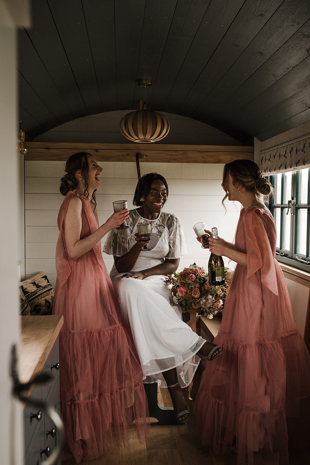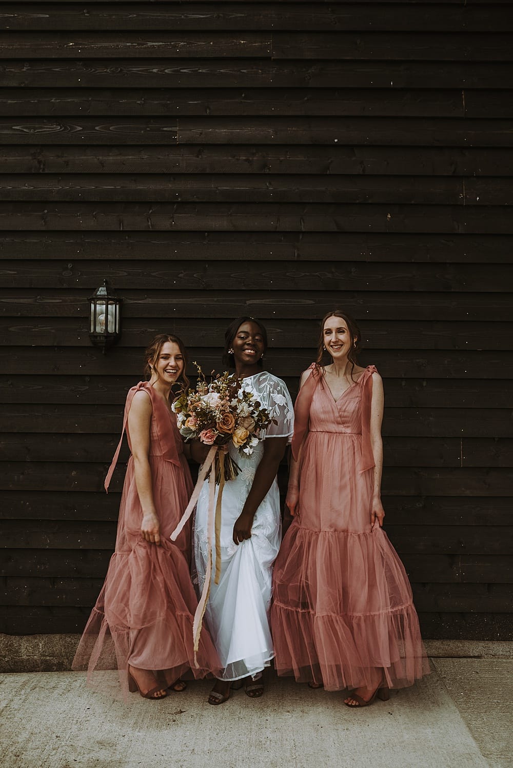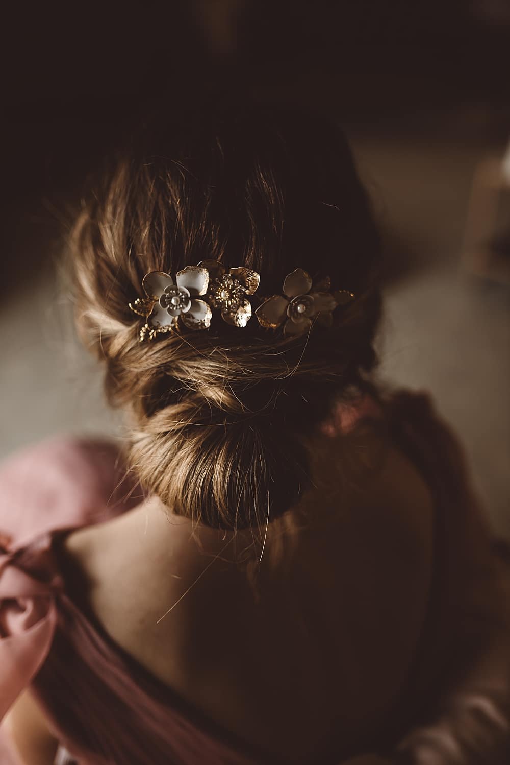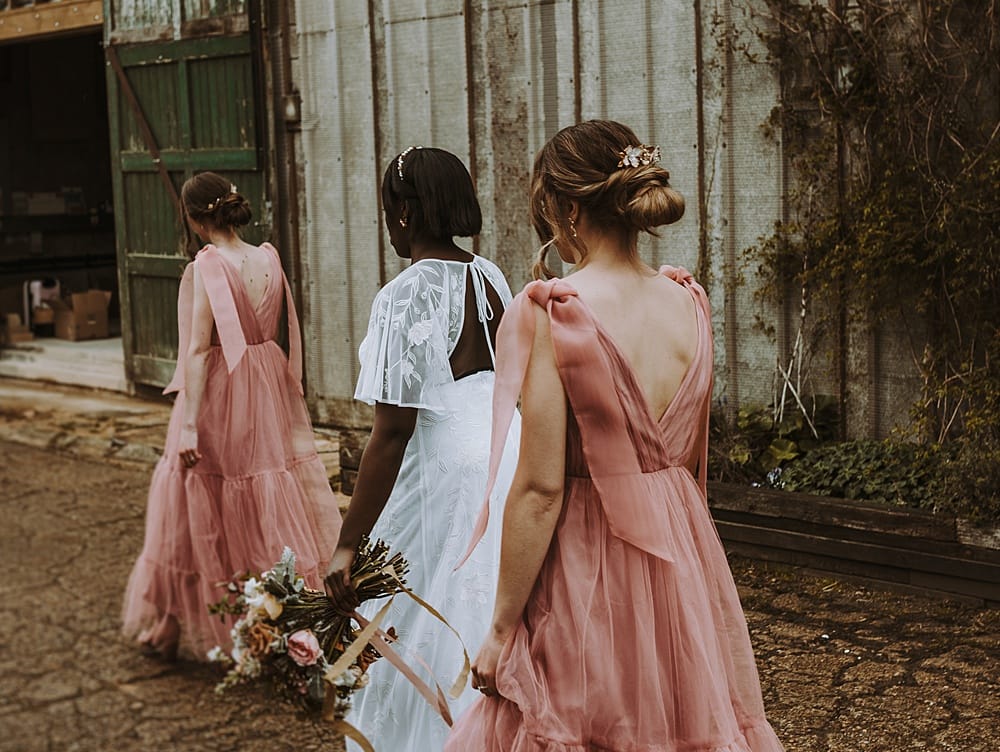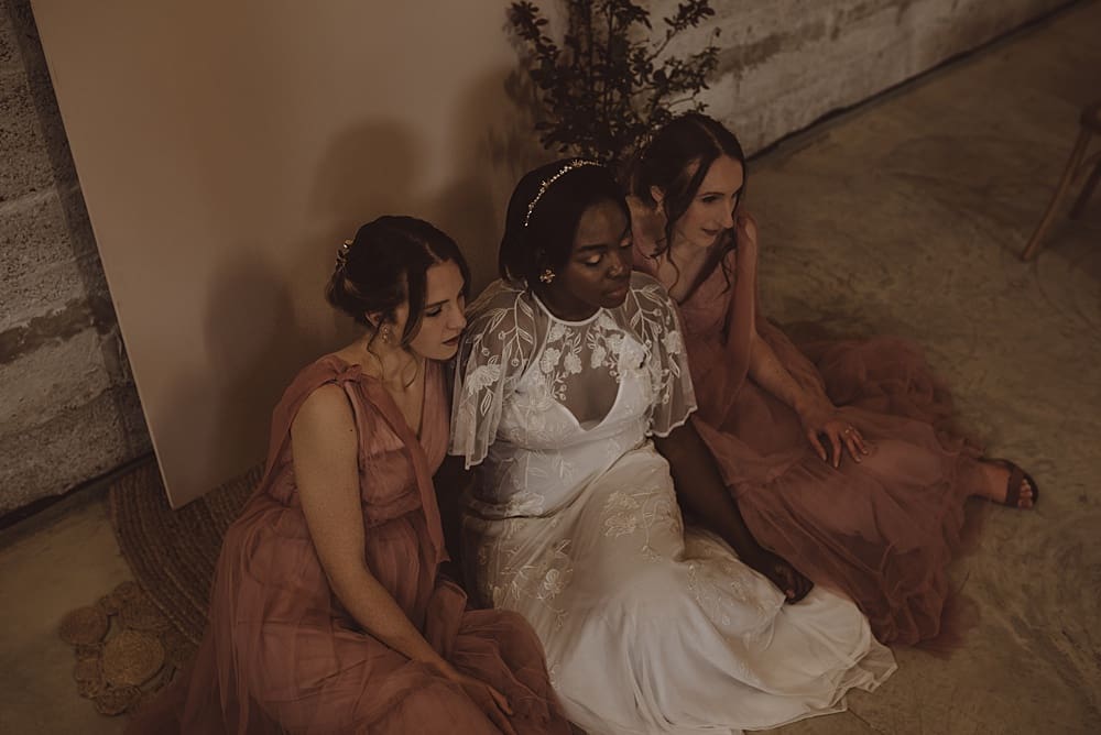 We loved the dusty pink colour of the bridesmaid dresses and the tulle shoulder ties, while our bride wore a gorgeous A-line dress with floral details that tied in perfectly with the overall theme of the shoot. We were so excited to be able to use some of Garter & Veil’s wonderful pieces to enhance the models’ looks. We felt that the delicate earrings and hair pieces were the perfect accessories to complete the bridal party outfits.