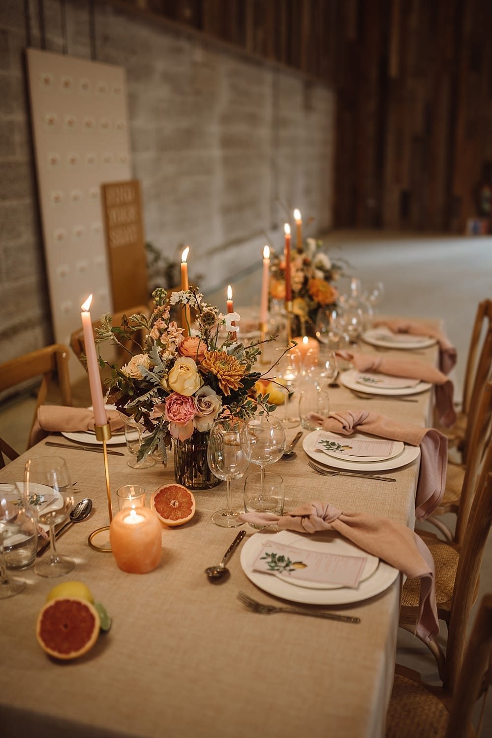 Lastly, we wanted the tablescape to feel bright yet romantic and to bring all the decor elements used so far together. We used a mixture of textures and bright colours; natural linen cloths and napkins; Himalayan salt candle holders; cut fresh fruit as table decor and modern lemon inspired menu cards. We’re all about the little details and we love to use running themes (such as fruit in this instance) throughout our design to keep things feeling cohesive.