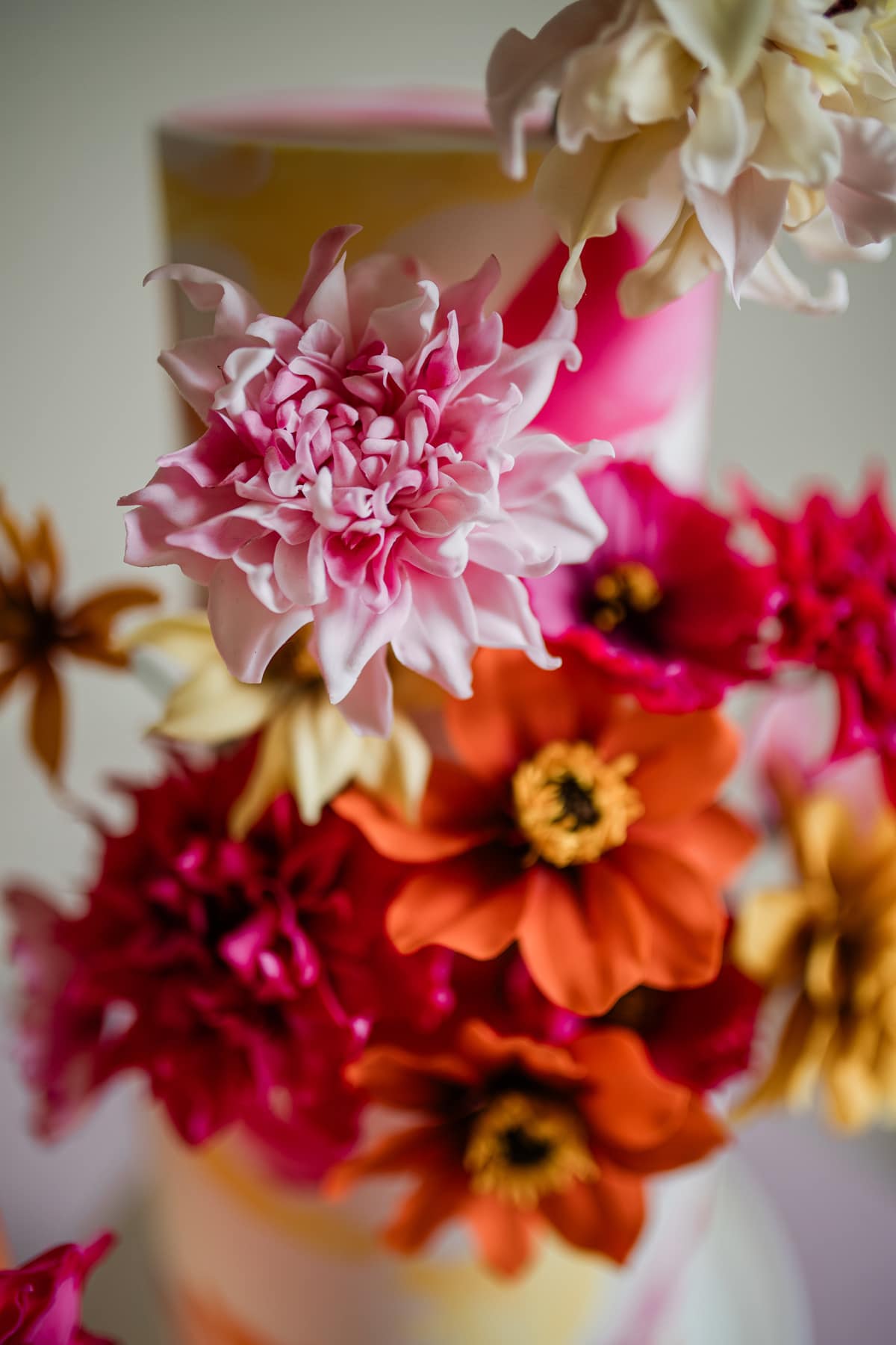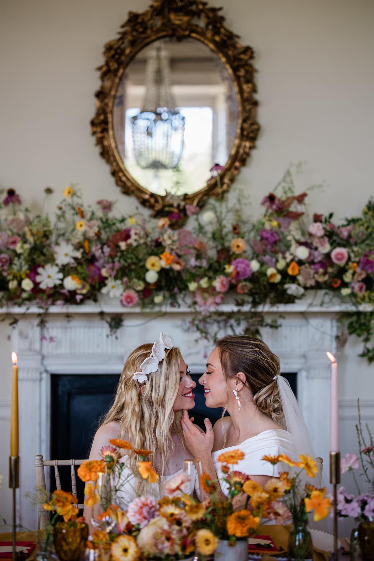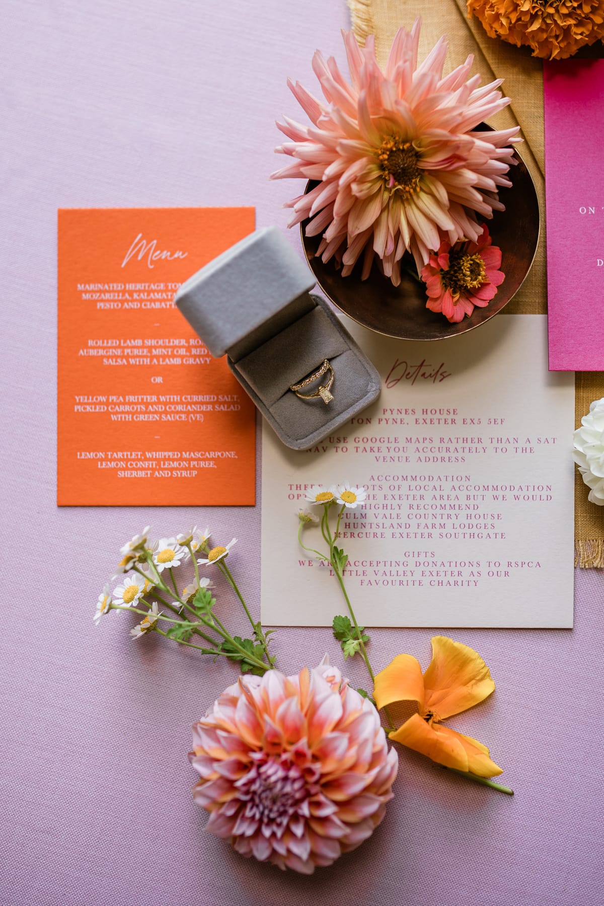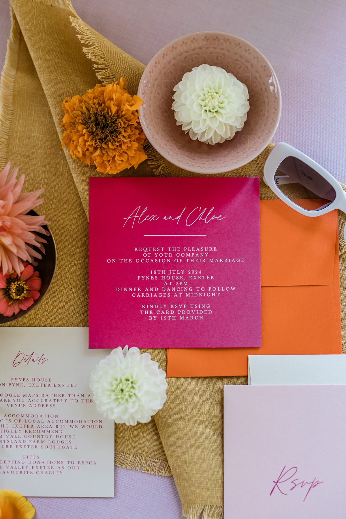 The shoot aimed to embrace colour and showcase that a traditional manor house wedding didn’t need to conform to muted or conventional colour palettes. Embracing the hot summer colours, we went full-on floral with masses of beautiful, brightly coloured flowers that stood out against the beautiful architecture of Pynes House.