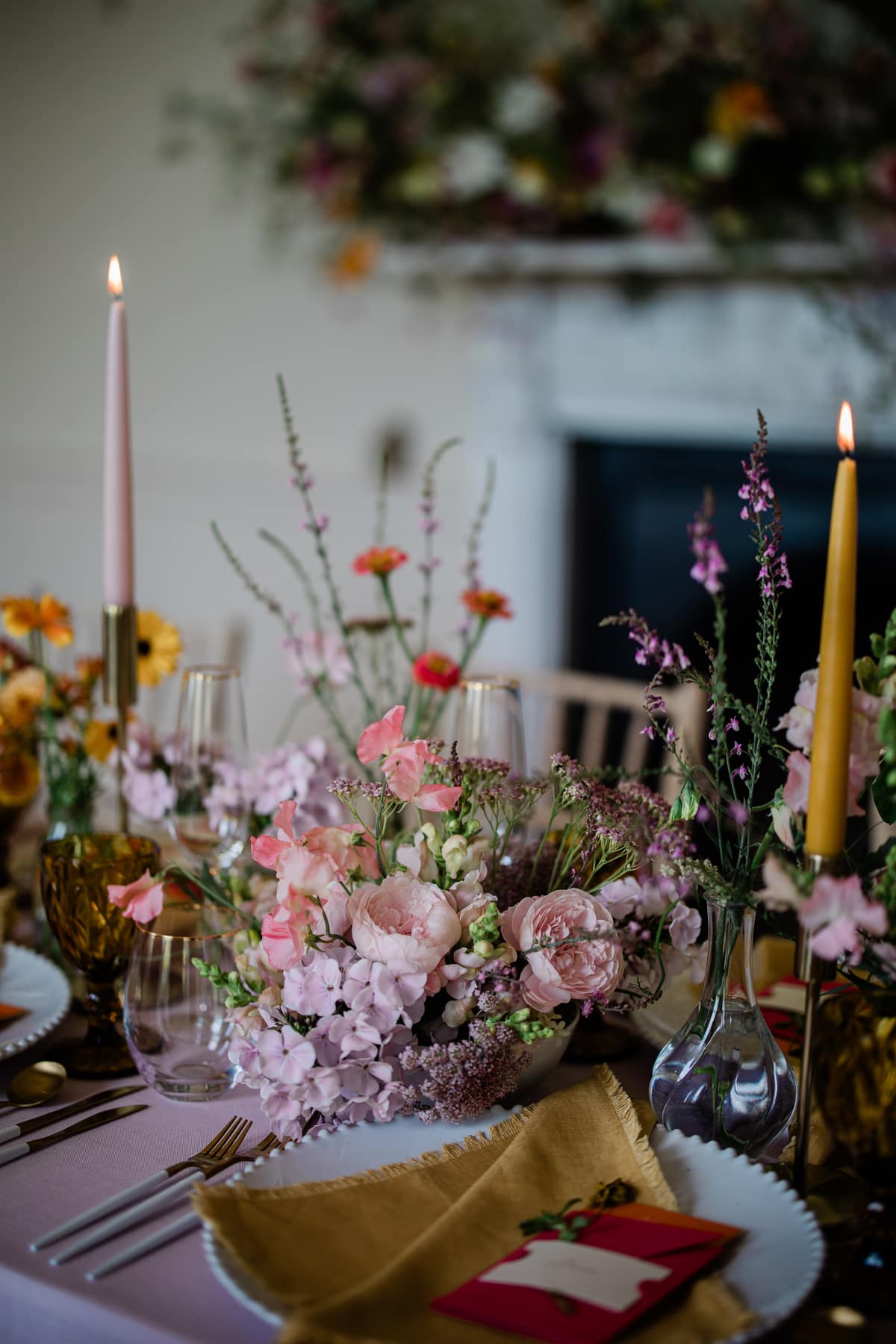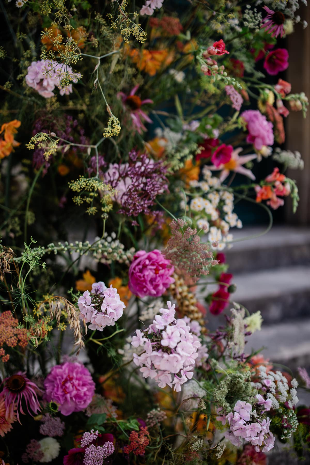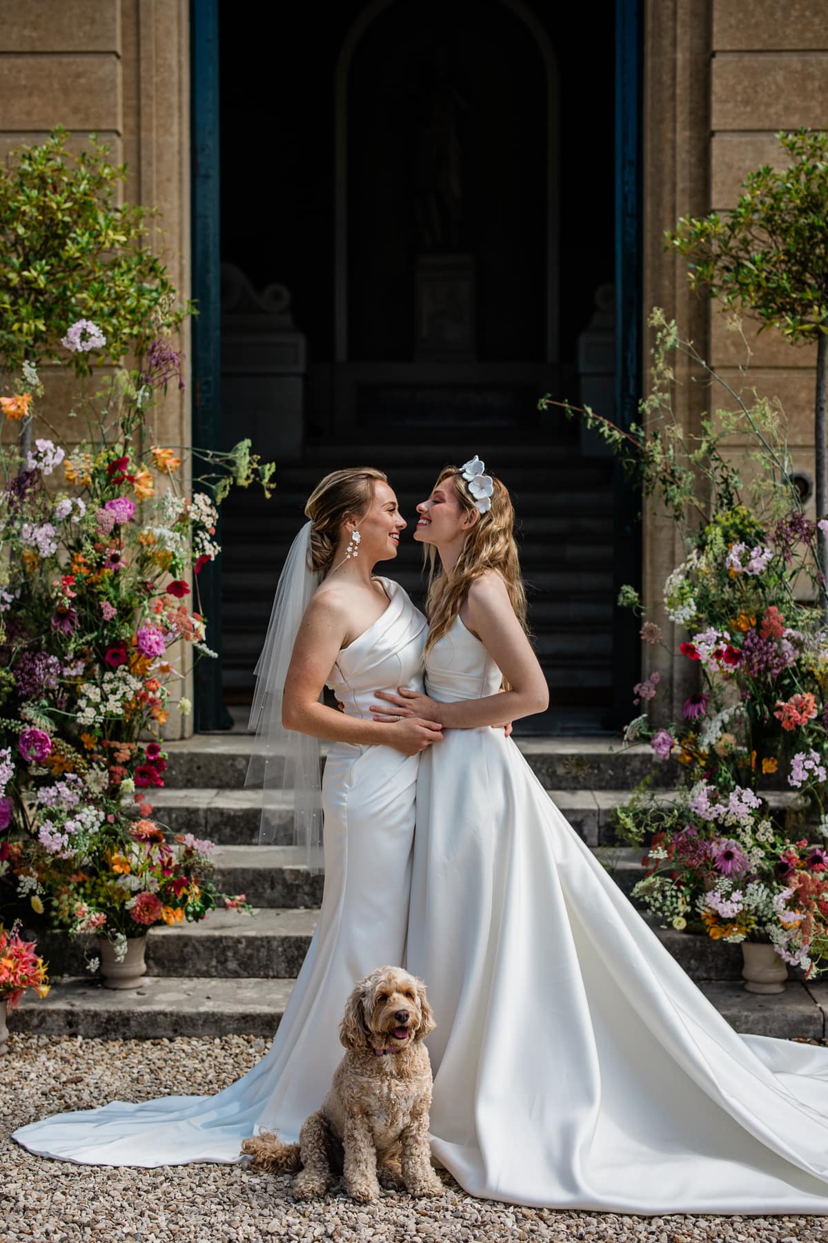 The shoot aimed to embrace colour and showcase that a traditional manor house wedding didn’t need to conform to muted or conventional colour palettes. Embracing the hot summer colours, we went full-on floral with masses of beautiful, brightly coloured flowers that stood out against the beautiful architecture of Pynes House.