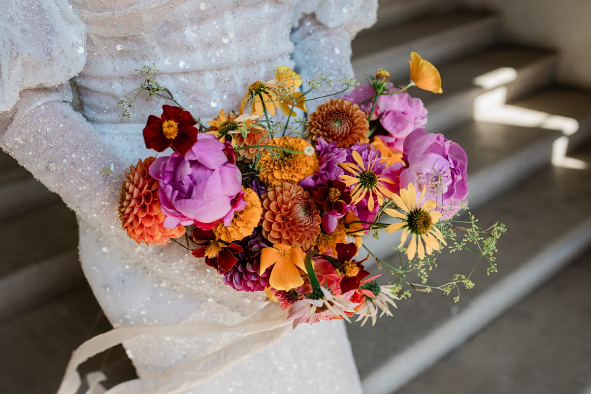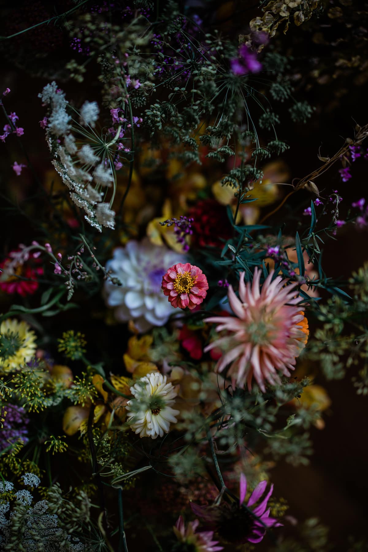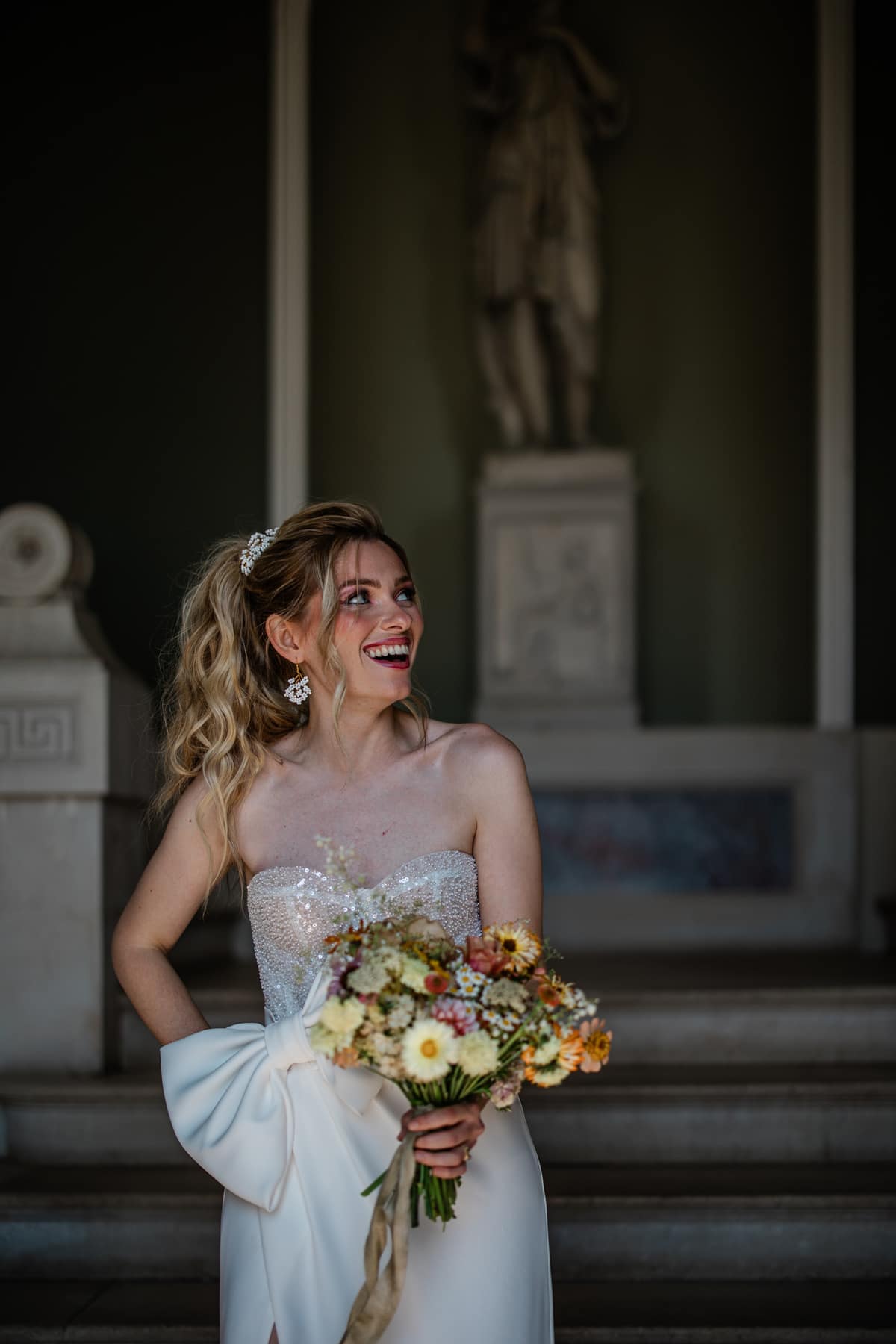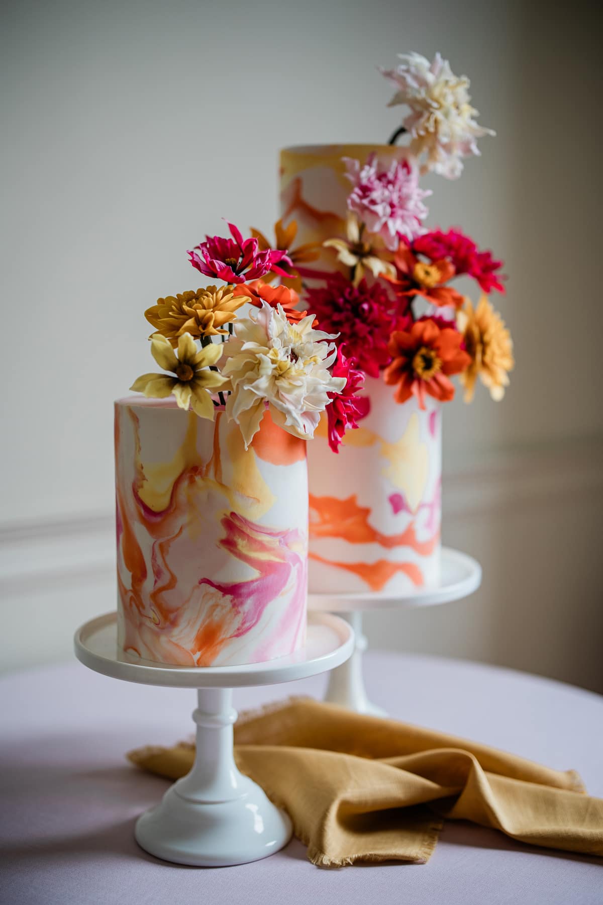 The shoot aimed to embrace colour and showcase that a traditional manor house wedding didn’t need to conform to muted or conventional colour palettes. Embracing the hot summer colours, we went full-on floral with masses of beautiful, brightly coloured flowers that stood out against the beautiful architecture of Pynes House.