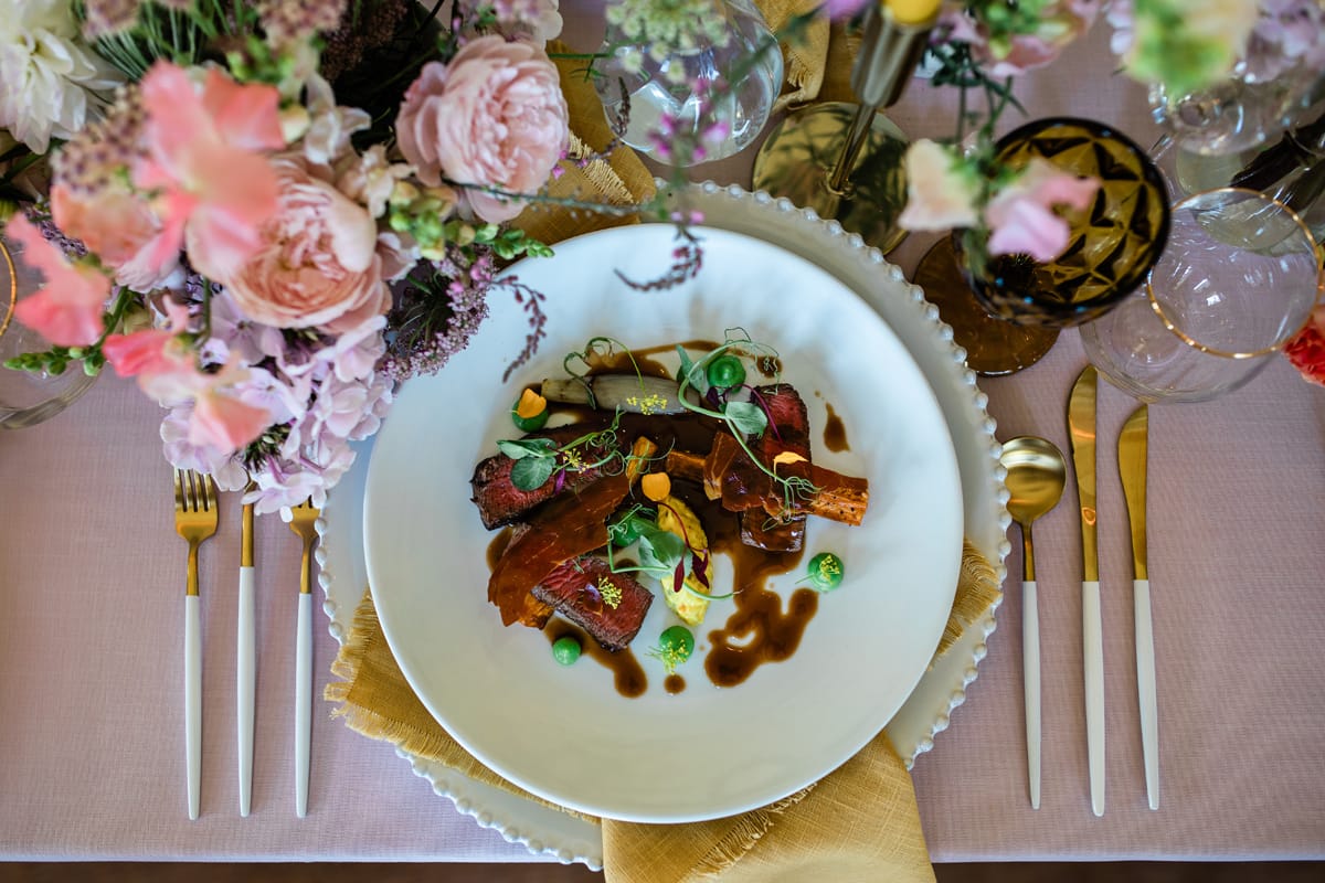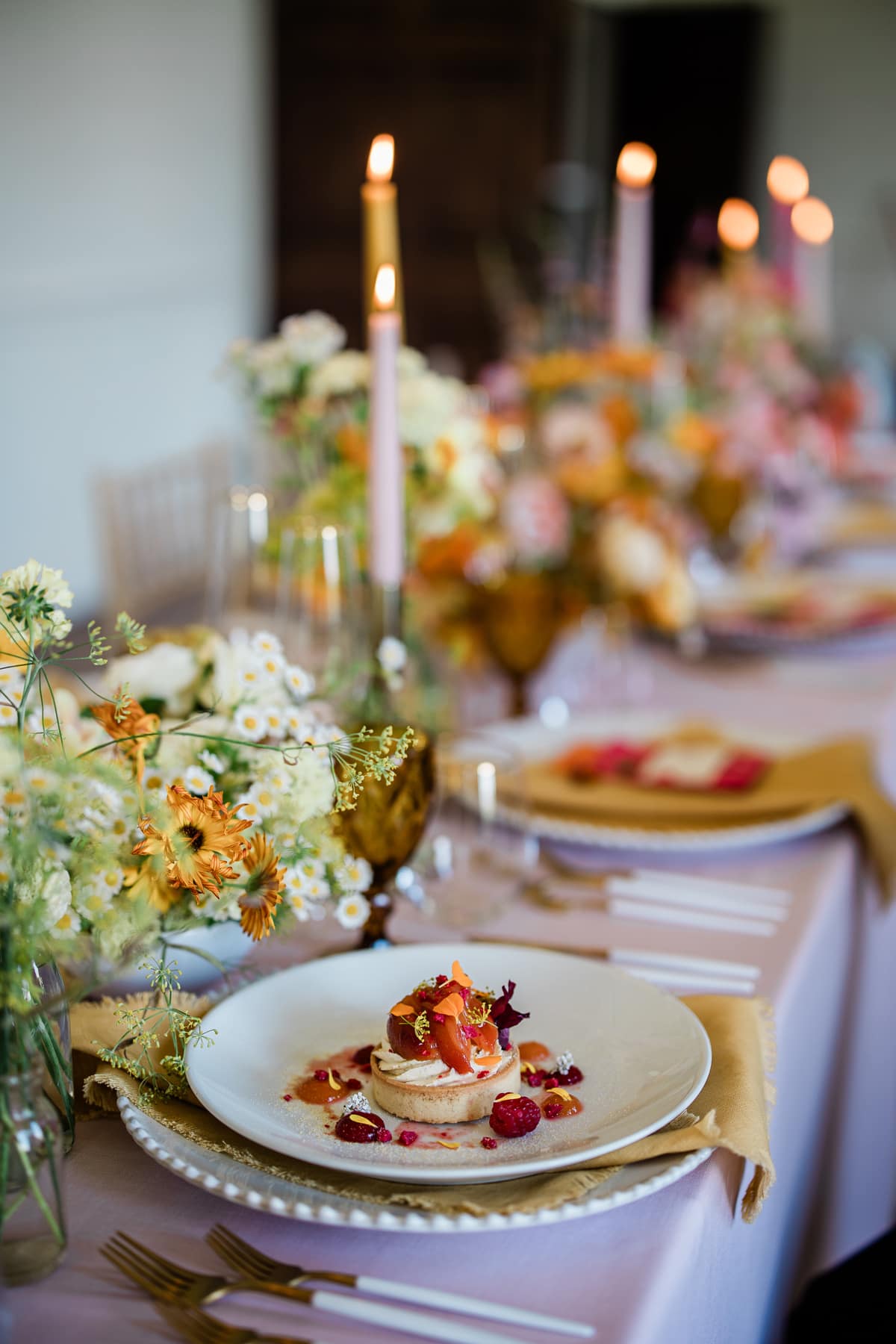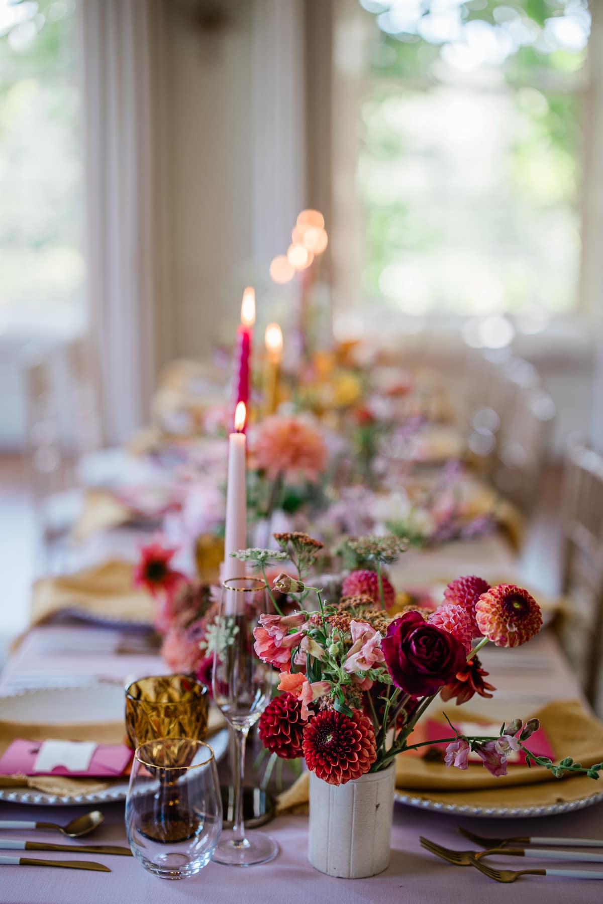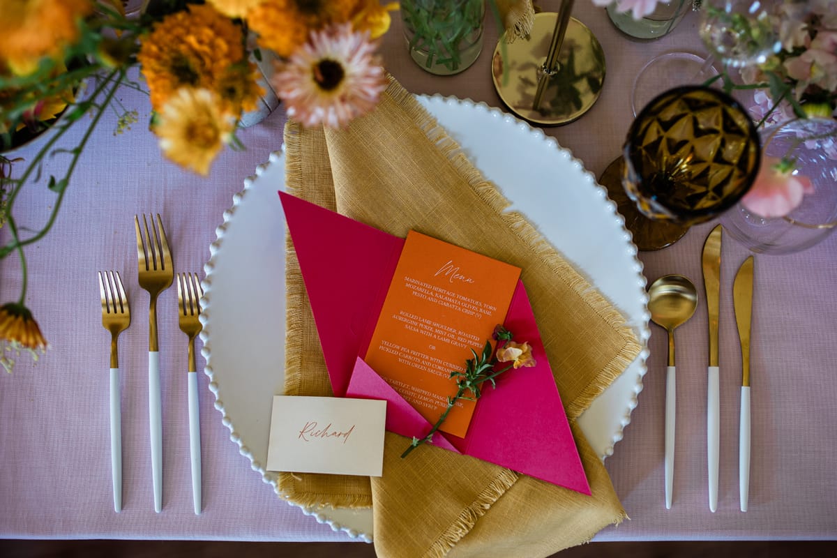 The tablescape was a full-on colour fest, with ombre flowers running down the centre of the table and bright origami-style place cards that opened up to show menu choices. Fun colour twist candles added to the colour, and light-hearted nature fabric welcome banners and table plans added a modern touch.