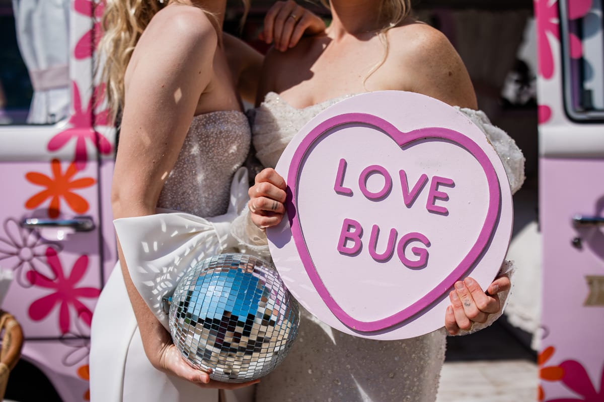 This shoot was all about fun, so our gorgeous couple took full opportunity of the pink floral camper photobooth and changed into evening looks with plenty of sparkle, Vera Wang style and sunglasses. We even had a gorgeous dog as a ring bearer!