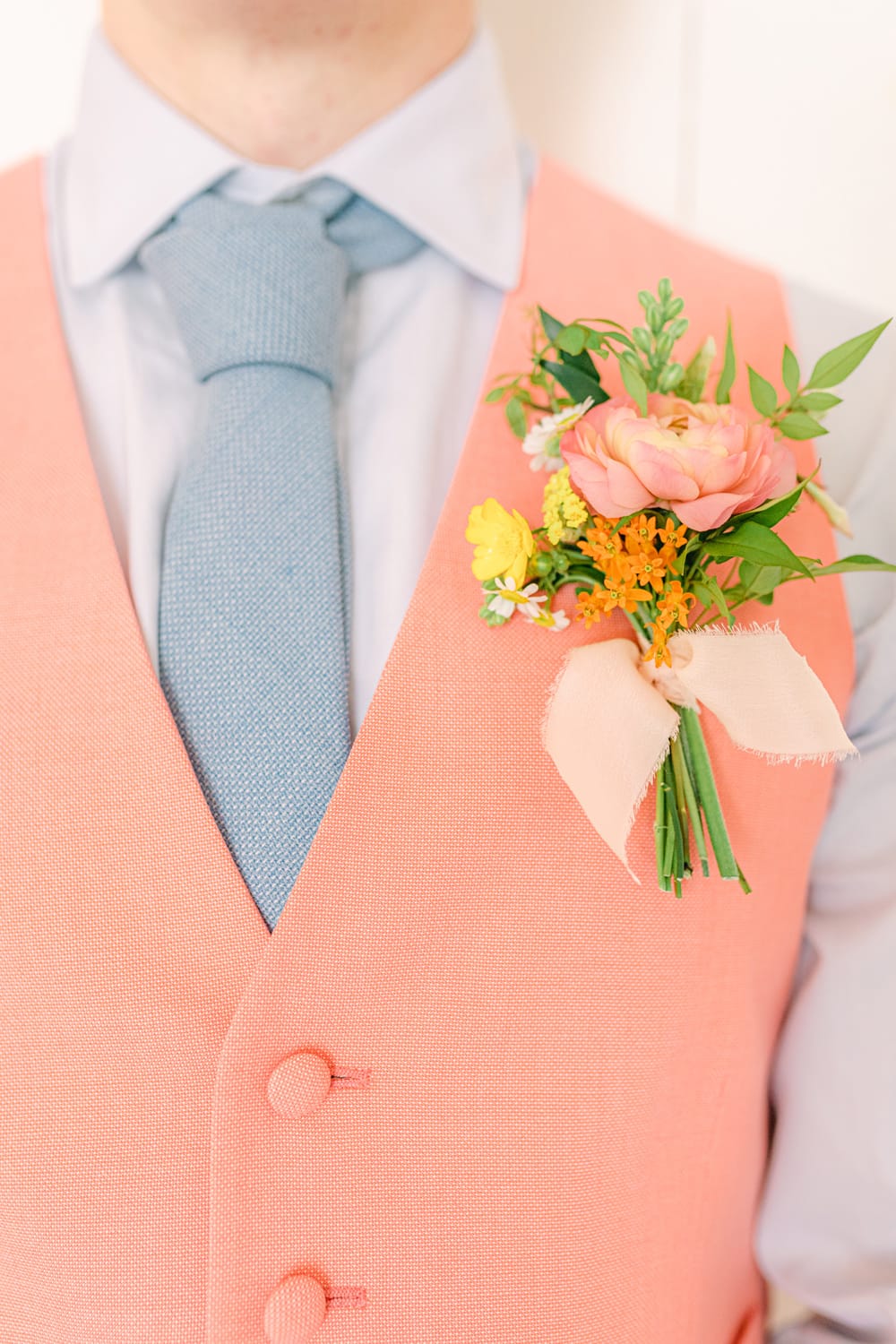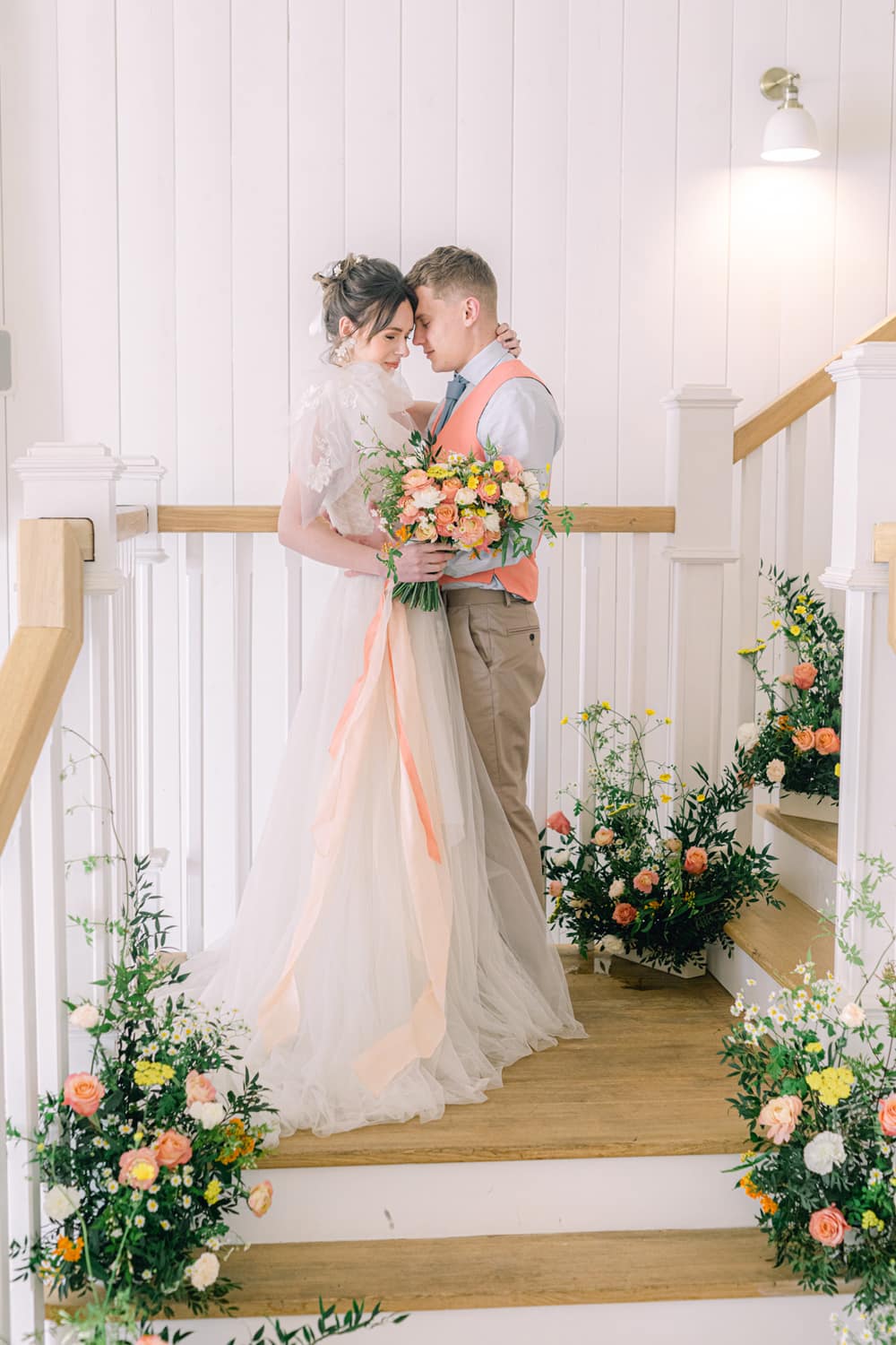 Today’s styled shoot is a perfect example of this; a parade of colour showcasing the rich vibrancy of summer. Peach, lemon, soft whites, coral and orange dance together surrounded by luscious greens, and that’s just the flowers. The entire scene, from the elegant stationery to the show-stopping wedding cake, is overflowing with vibrant, playful wedding inspiration, and the coral waistcoat and baby blue shirt/tie combo needs special mention. I sincerely hope a bold groom or two will go ahead and embrace colour for their festivities. What a joy!