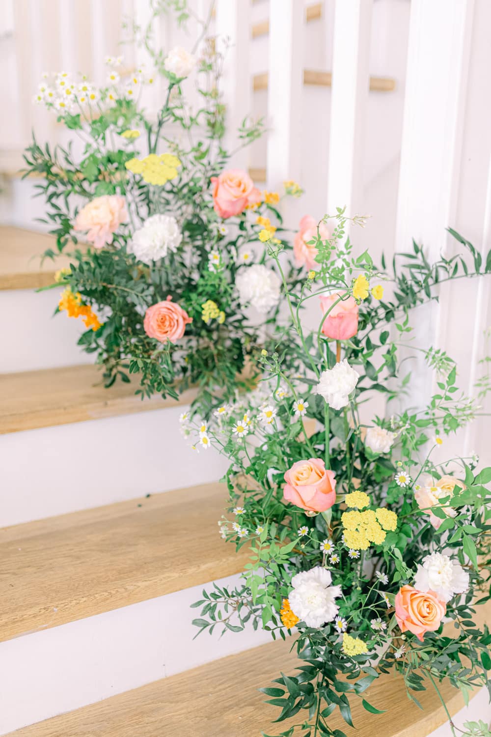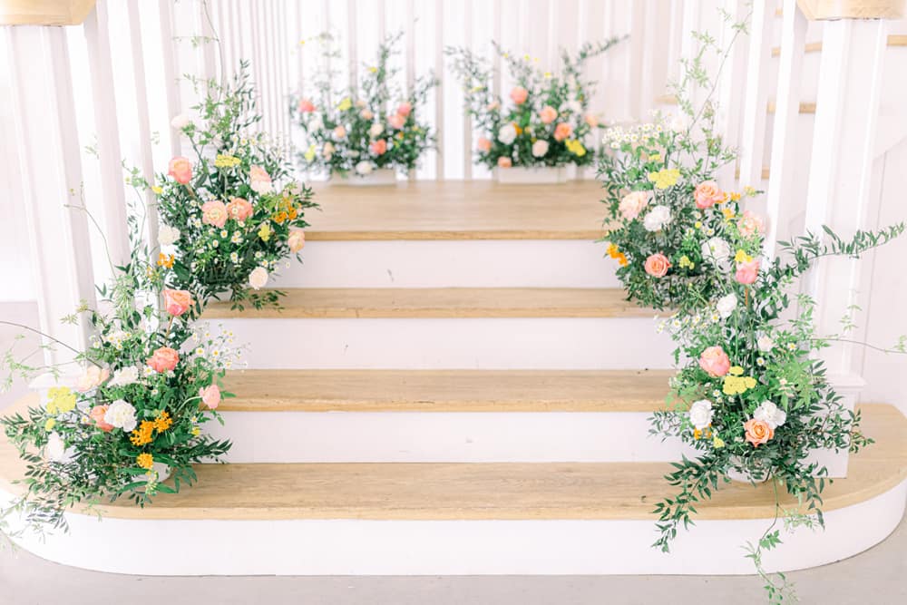Beth from A Basket Full Of Blooms was a natural choice, with Bethan using a considerable amount of her home-grown blooms and foraged foliage within her designs. The vision for the shoot called for an abundance of flowers and texture, and Bethan didn’t disappoint. She created wild and unstructured floral arrangements up the staircase and the ceremony aisle. As well as the table arrangements and decor around the wedding cake. The bouquet was also wild and semi-unstructured to follow through on how nature grows as free and unconfined.