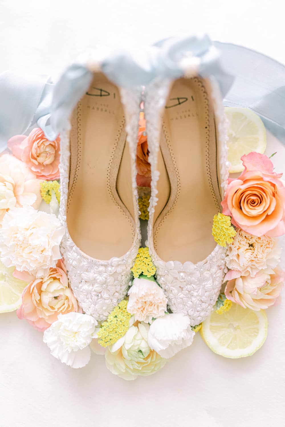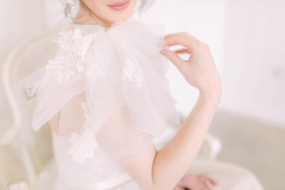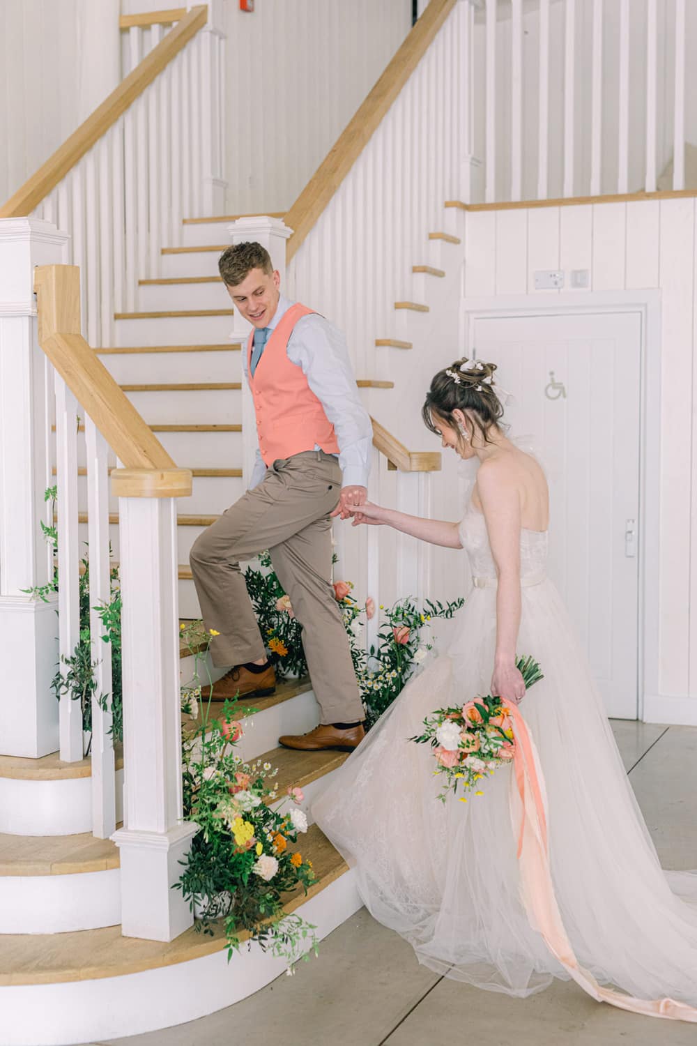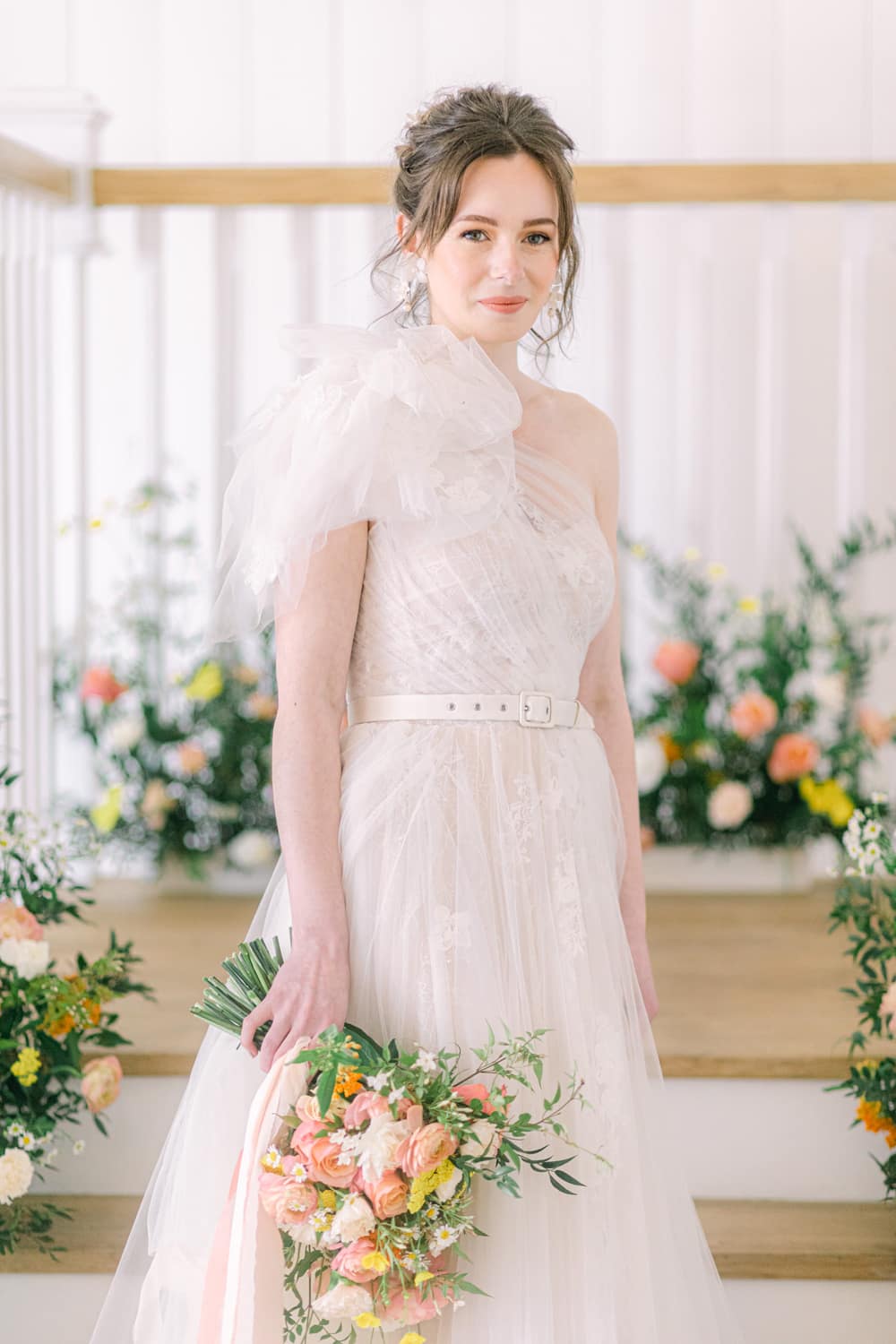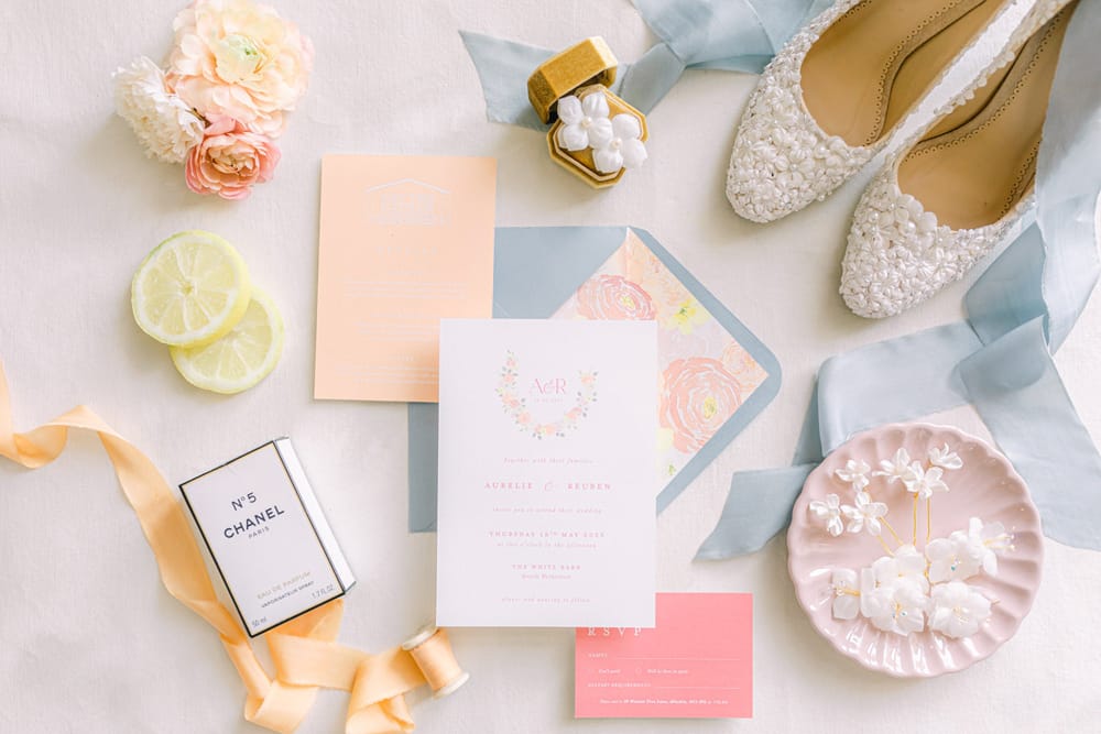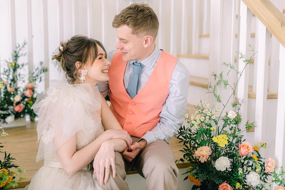 The bride’s look features a textured updo incorporating a silk ribbon, fresh and dewy makeup, and coral lips. She wore a design by designer Josephine Scott that blended old-world romance with a more modern approach. It featured layers of luxury tulle and a one-shoulder ruffle. The look was completed with accessories designed and hand-made by award-winning designer Rachel Sokhal Bridal and hand-crafted shoes by shoe designer Diane Hassall tied with hand-dyed ribbons. The groom wore a custom-tailored suit, including a coral waistcoat, a light blue shirt, and sand-coloured chinos.