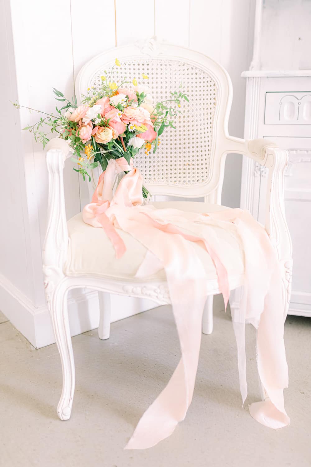 Flowers and naturally dyed textiles were carefully styled to showcase the barn’s focal points, including the staircase leading up to the mezzanine area and the iconic white barn doors, making for the perfect backdrop for the ceremony. The tablescape design was an opportunity to play with colours, such as the slate blue velvet tablecloth and coral pink silk ribbons, which adorned bespoke embroidered napkins. The cake completed the setup and comprised three deconstructed tiers. Each tier featured handcrafted sugar flowers and peaches, giving a subtle nod to the summery, zesty feel of the shoot.
