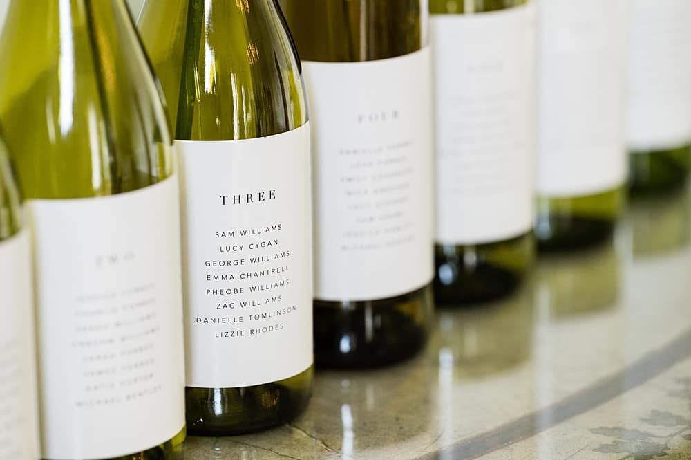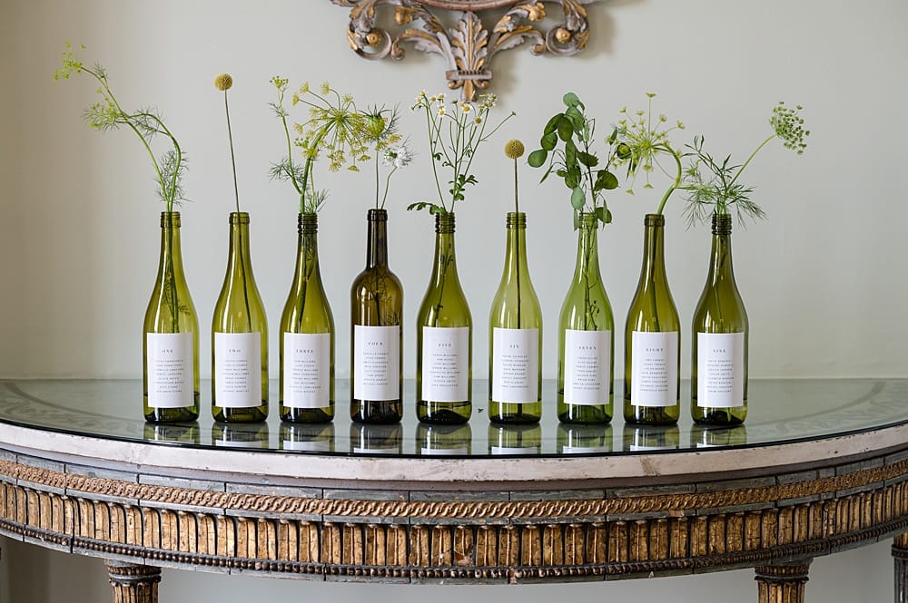 The stationery (with thick deckled-edge matte paper) was subtle too but used lots of tactile texture to keep it engaging. We chose recycled and recyclable paper stocks and the ribbons were made from organic bamboo which was hand-dyed with natural dyes (lilac leaves and ivy). And we added a more playful element with the seating plan which was created from recycled wine bottles with labels and single flower stems.