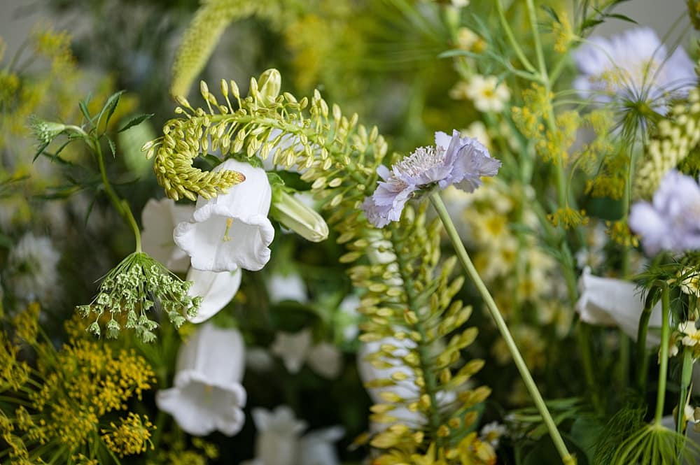 Trees and potted plants provided the scale, and then we chose delicate and free-flowing flower varieties for femininity, structure without stiffness, and movement.