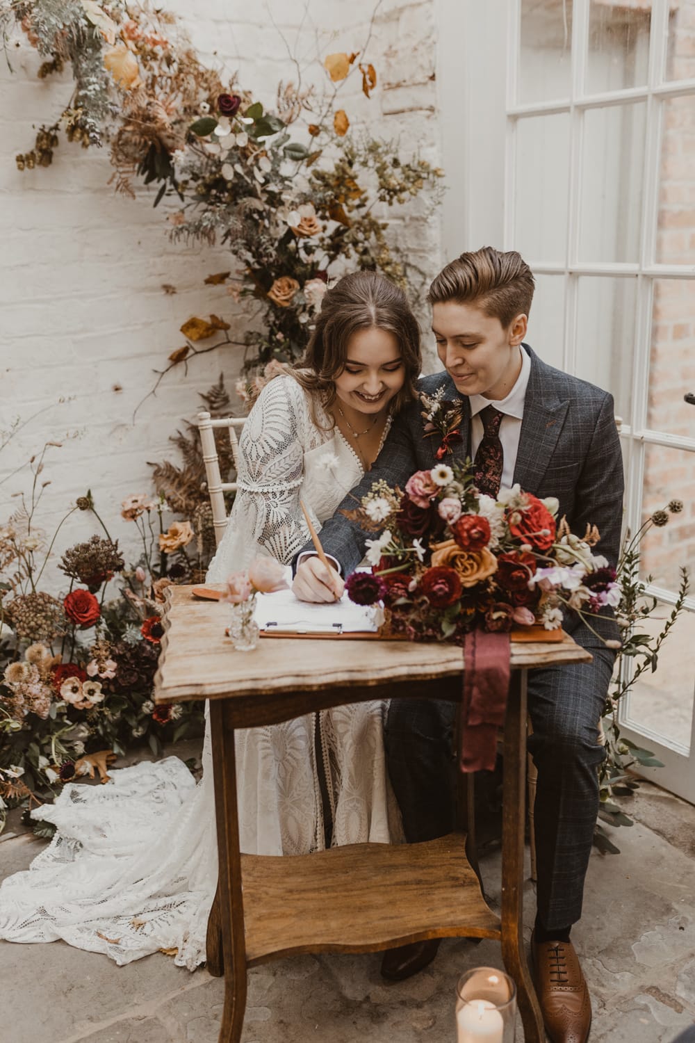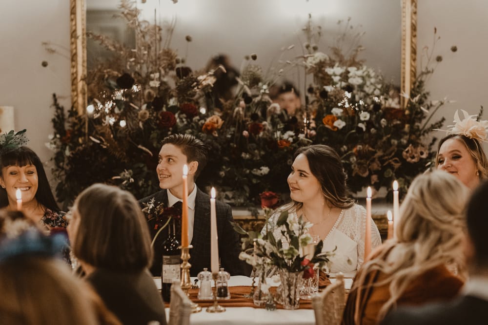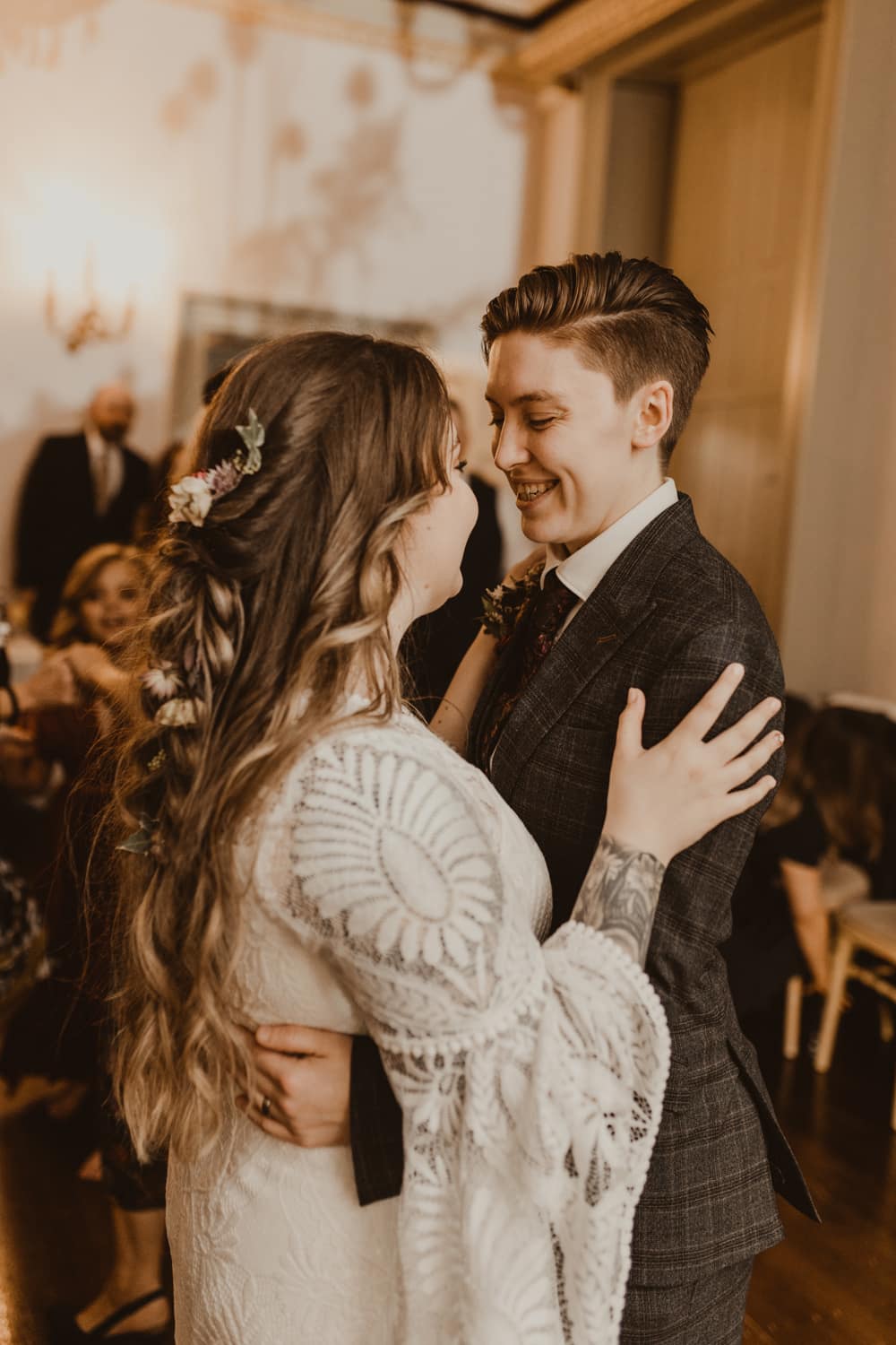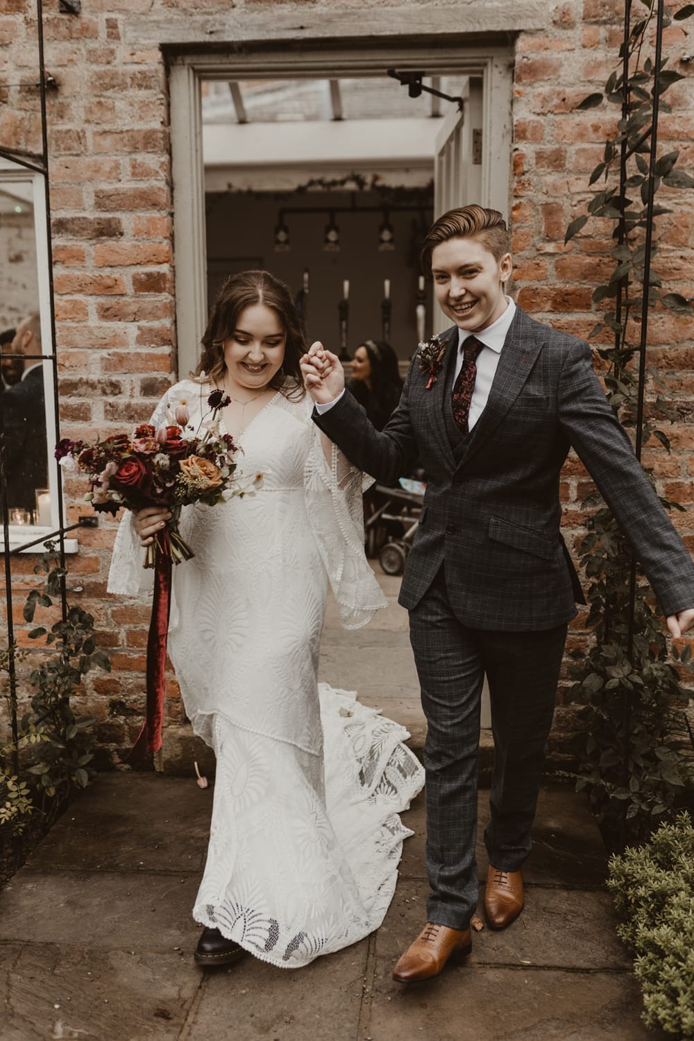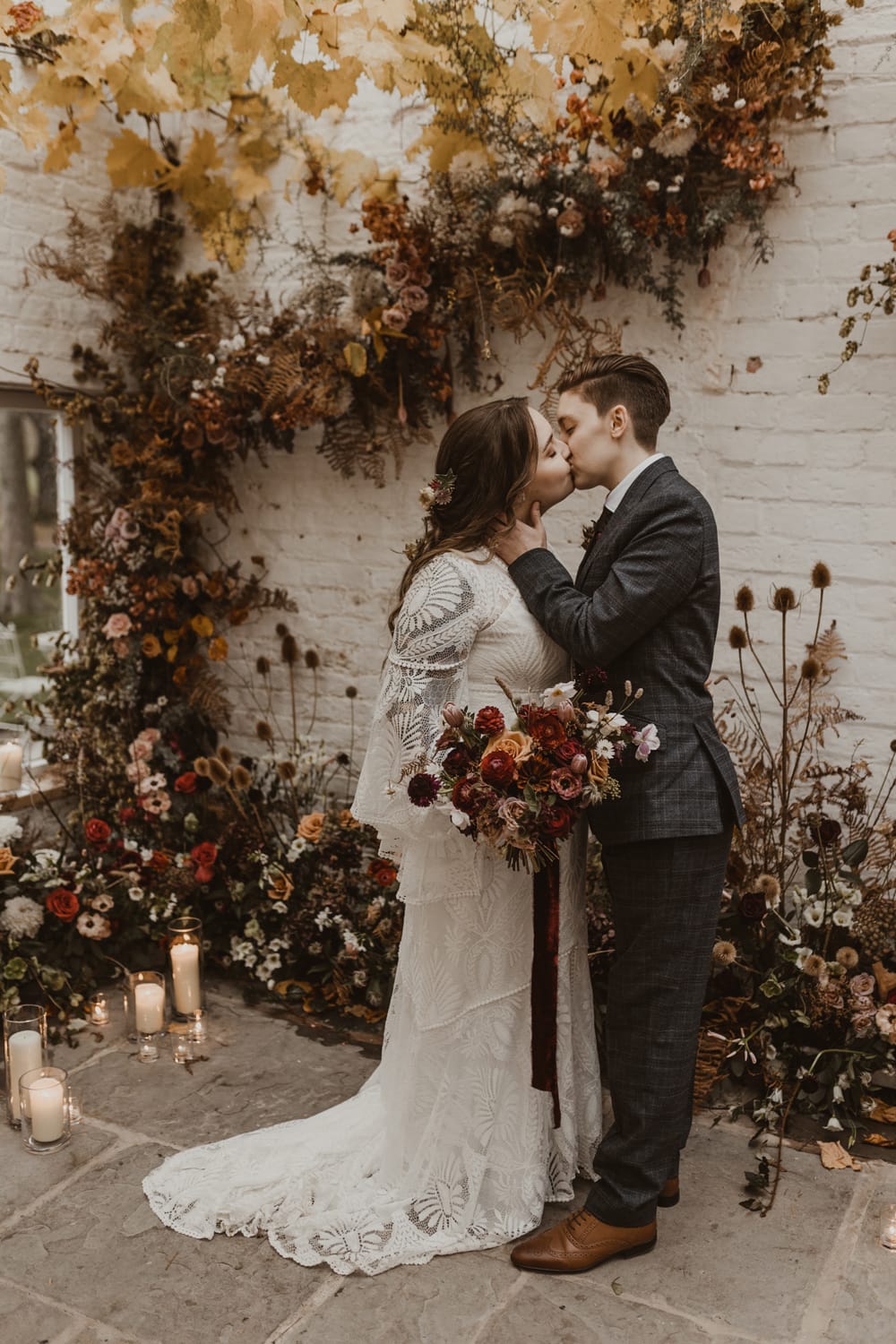 Tasmin and Becky’s intimate November wedding was boho in style but with a sprinkling of decadence. Our bride Tasmin wore a long lace gown with a train and bell sleeves. Her long hair was styled half up, half down with a long loose plait and fresh flowers woven through, finishing off her look with black Doc Marten boots and Pride socks. Becky wore a grey check suit with a dark paisley style tie and a buttonhole following the flower theme. The bridesmaids who were a range of ages wore burnt orange and dark red floor length velvet dresses – perfect for the time of year and their overall wedding vibe.