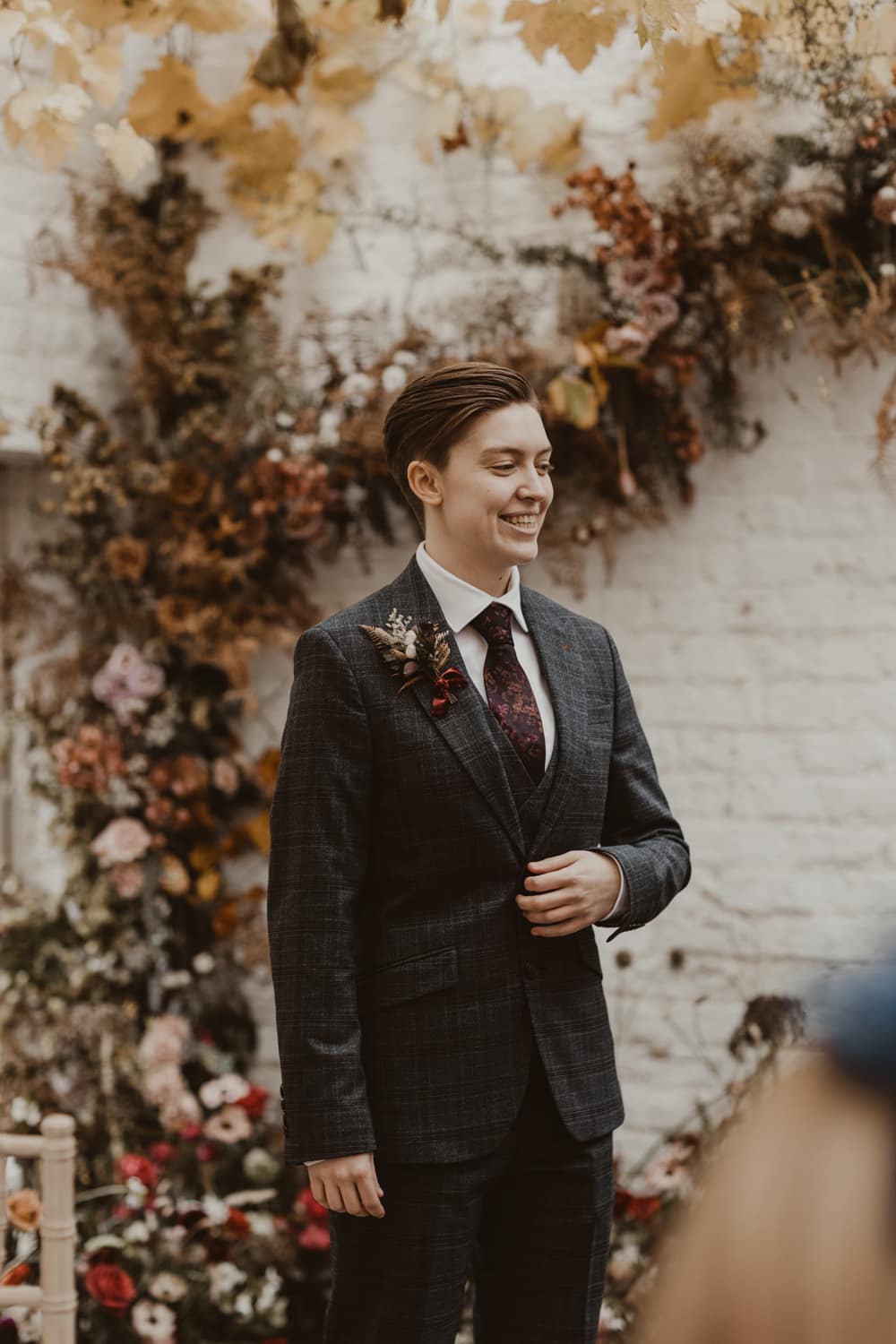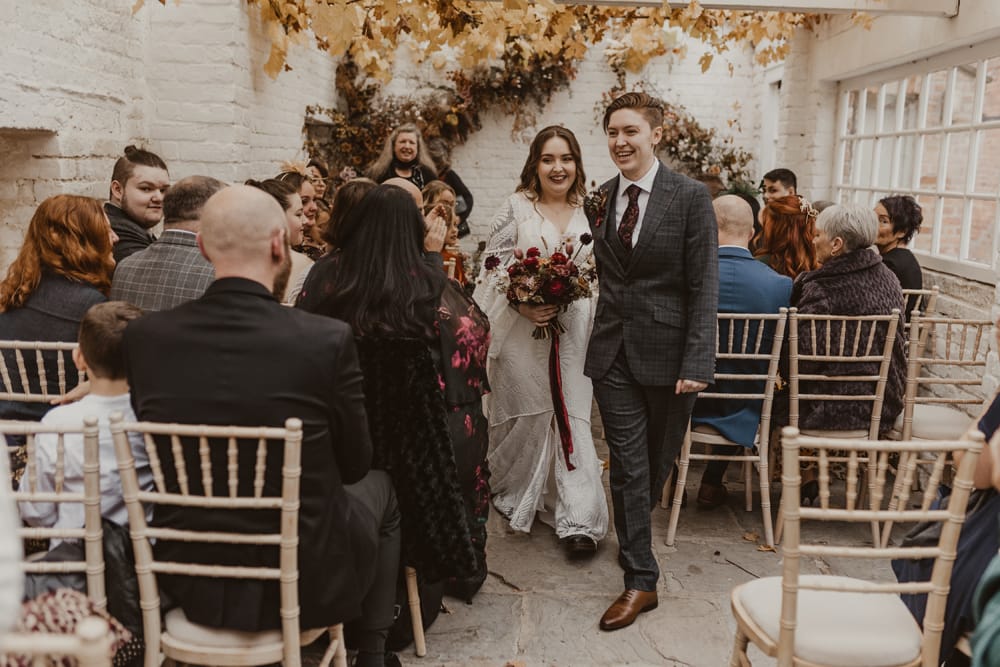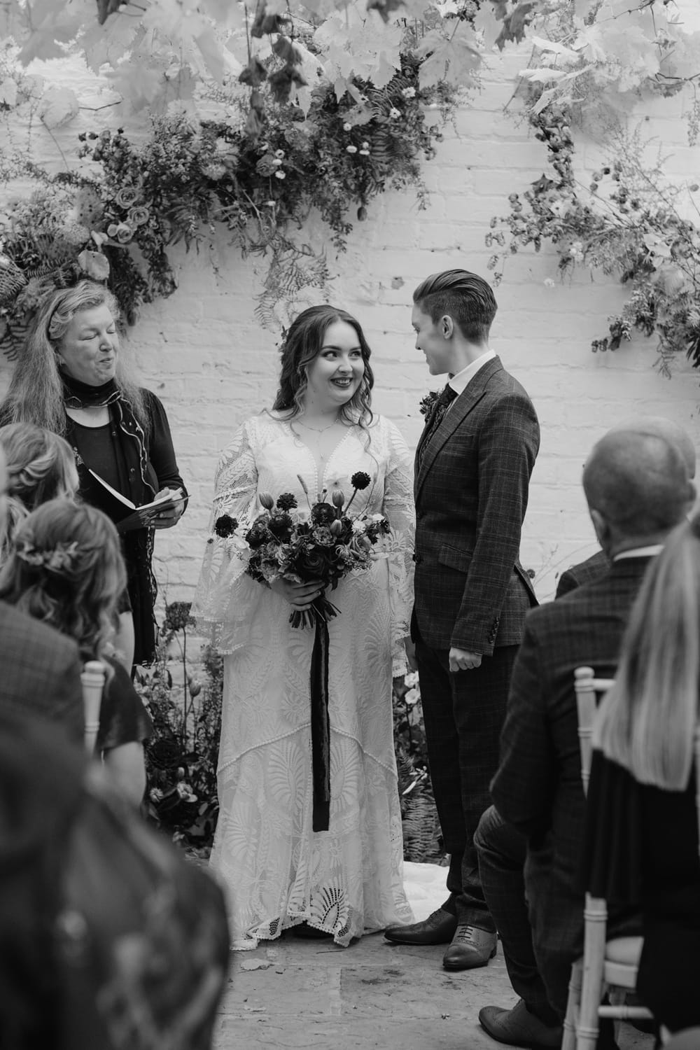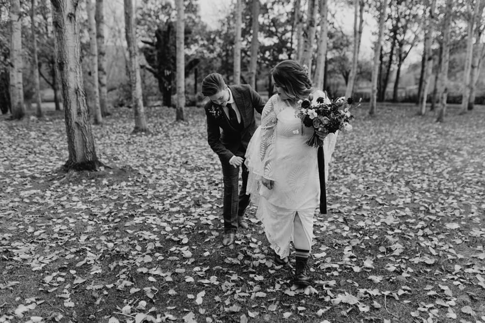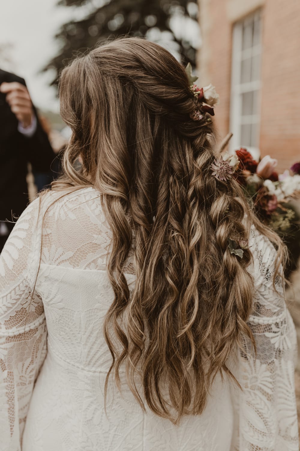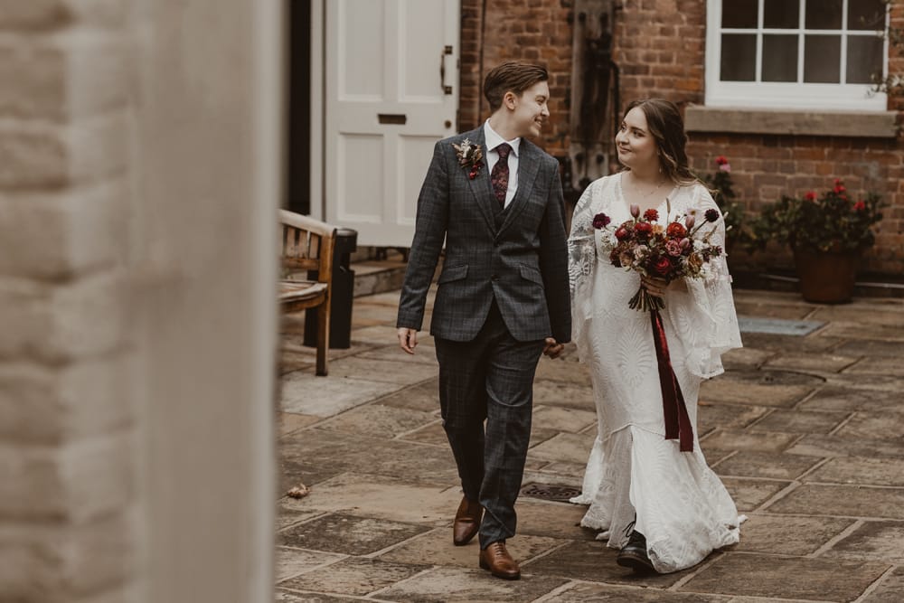 Tasmin and Becky’s intimate November wedding was boho in style but with a sprinkling of decadence. Our bride Tasmin wore a long lace gown with a train and bell sleeves. Her long hair was styled half up, half down with a long loose plait and fresh flowers woven through, finishing off her look with black Doc Marten boots and Pride socks. Becky wore a grey check suit with a dark paisley style tie and a buttonhole following the flower theme. The bridesmaids who were a range of ages wore burnt orange and dark red floor length velvet dresses – perfect for the time of year and their overall wedding vibe.