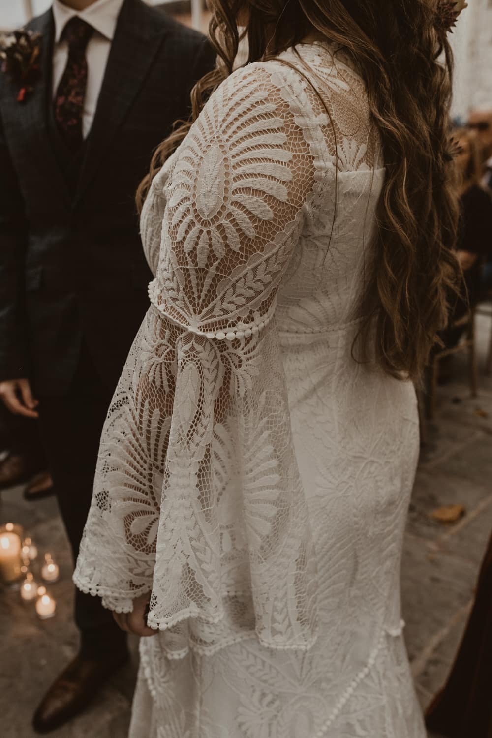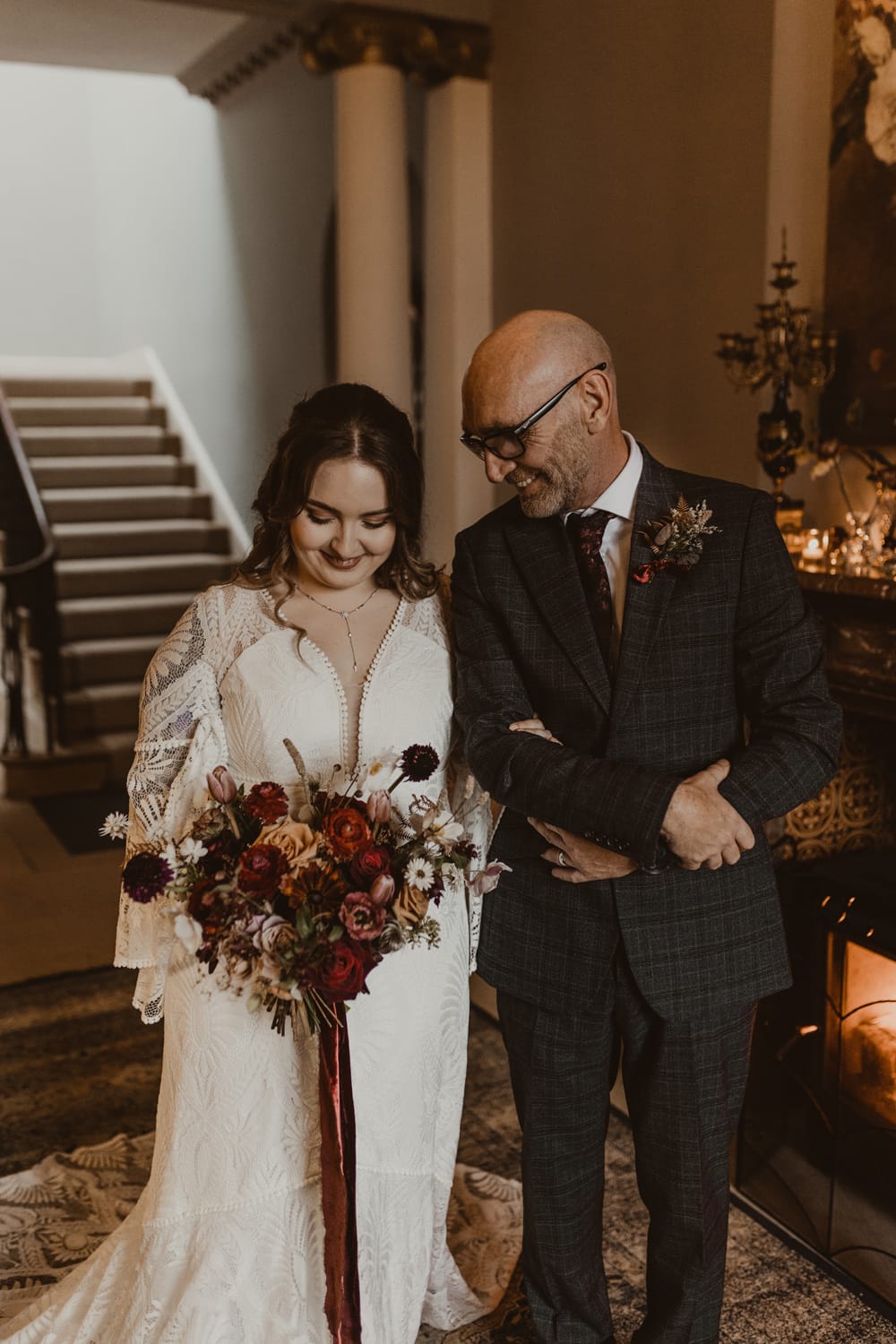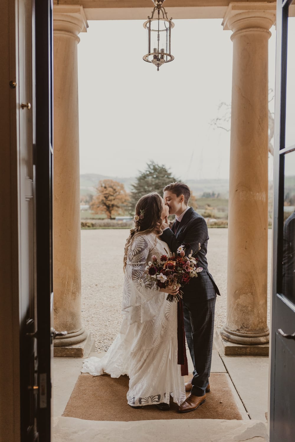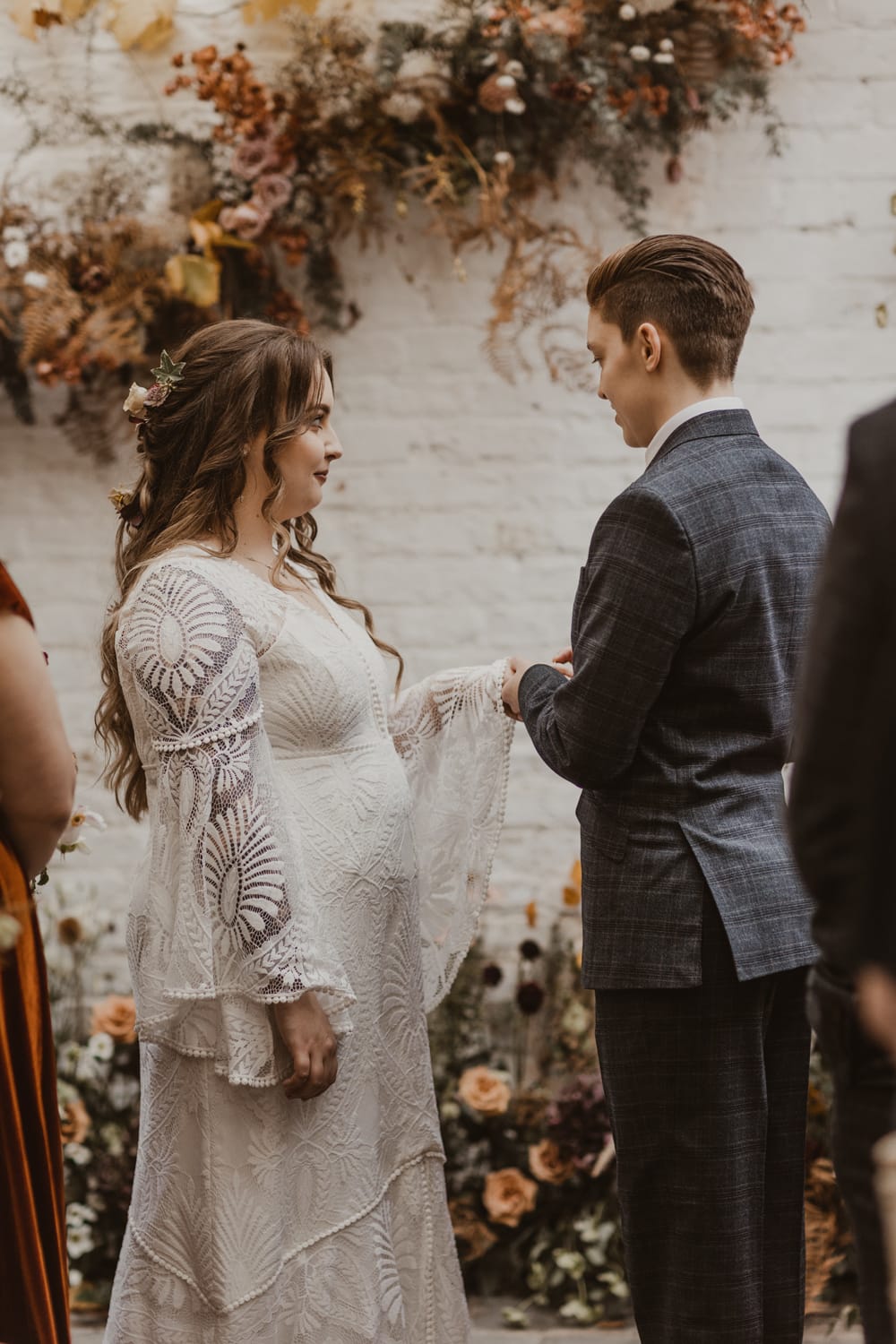 Tasmin and Becky’s intimate November wedding was boho in style but with a sprinkling of decadence. Our bride Tasmin wore a long lace gown with a train and bell sleeves. Her long hair was styled half up, half down with a long loose plait and fresh flowers woven through, finishing off her look with black Doc Marten boots and Pride socks. Becky wore a grey check suit with a dark paisley style tie and a buttonhole following the flower theme. The bridesmaids who were a range of ages wore burnt orange and dark red floor length velvet dresses – perfect for the time of year and their overall wedding vibe.