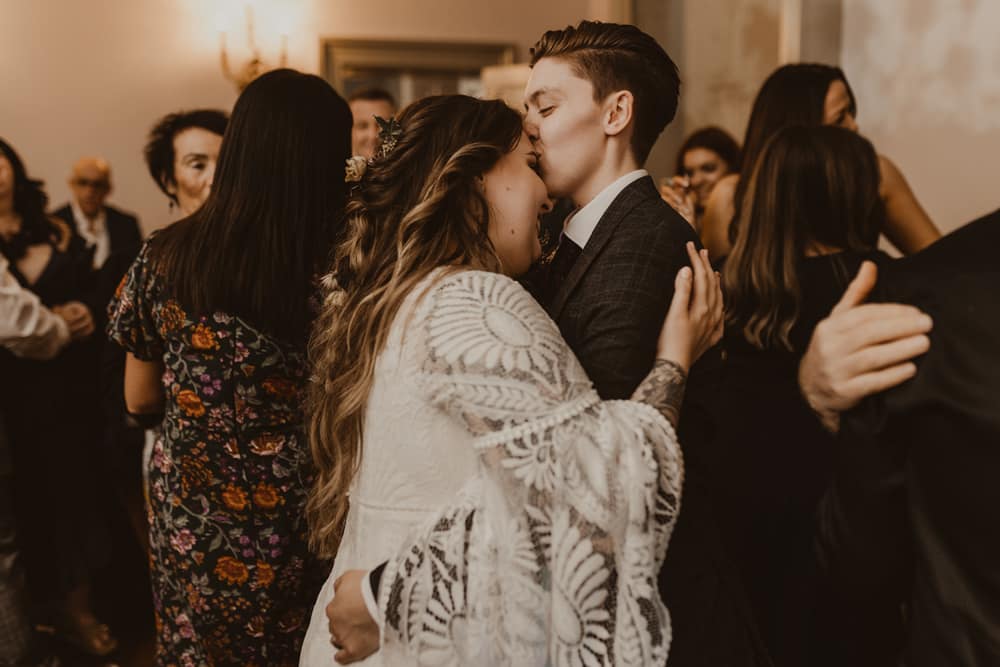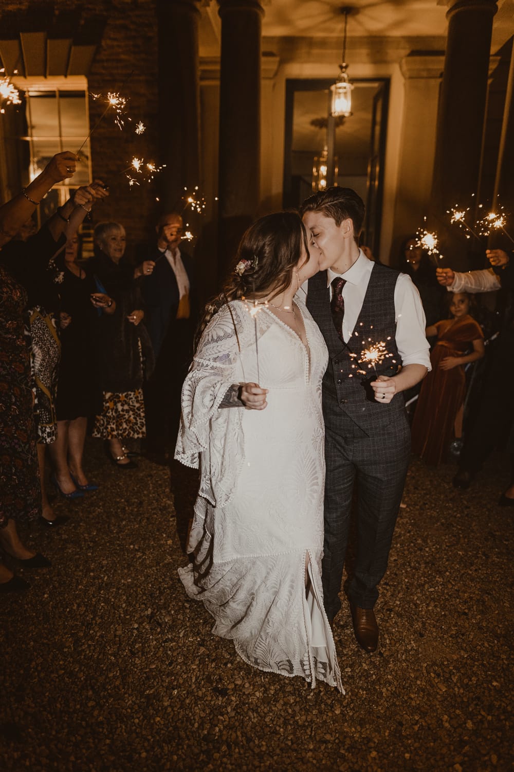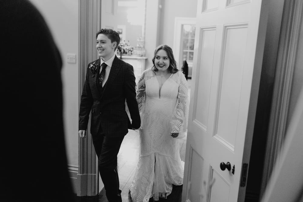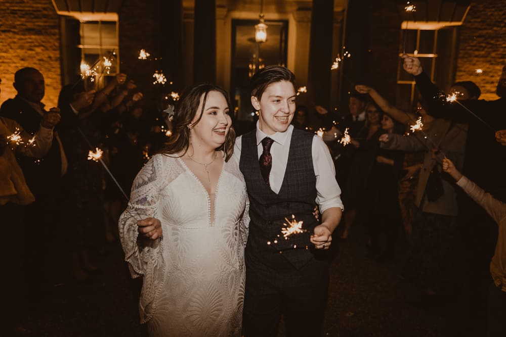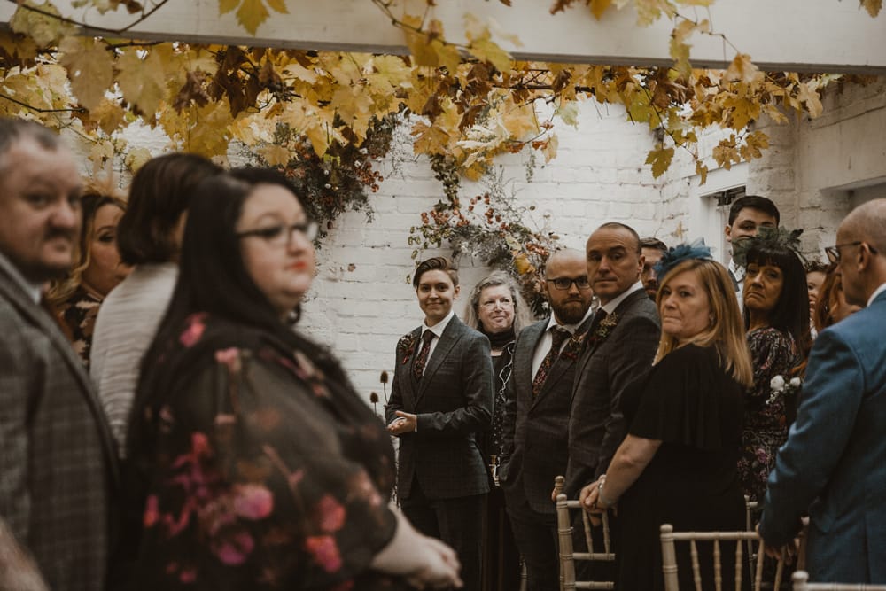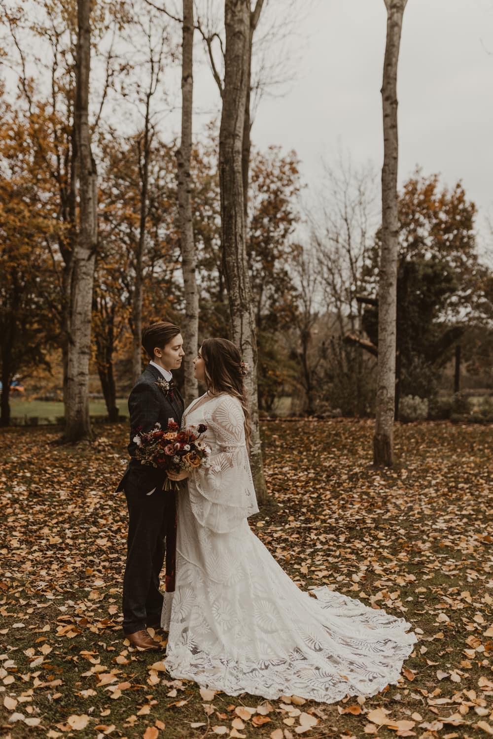 Tasmin and Becky’s intimate November wedding was boho in style but with a sprinkling of decadence. Our bride Tasmin wore a long lace gown with a train and bell sleeves. Her long hair was styled half up, half down with a long loose plait and fresh flowers woven through, finishing off her look with black Doc Marten boots and Pride socks. Becky wore a grey check suit with a dark paisley style tie and a buttonhole following the flower theme. The bridesmaids who were a range of ages wore burnt orange and dark red floor length velvet dresses – perfect for the time of year and their overall wedding vibe.