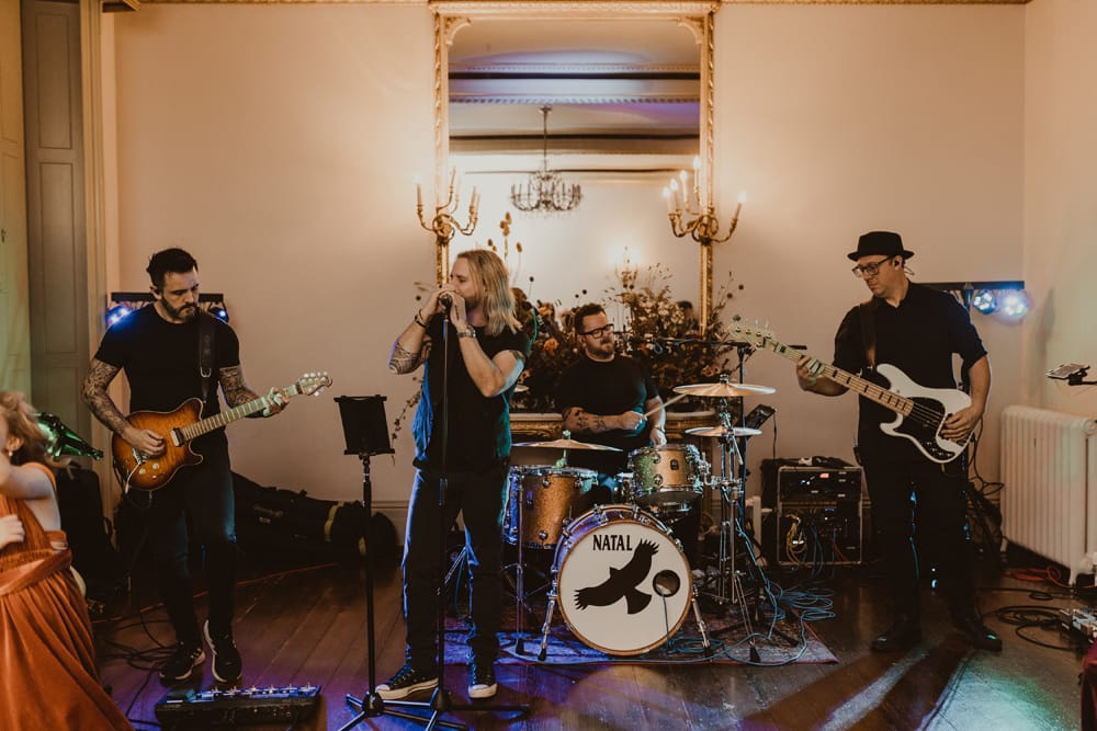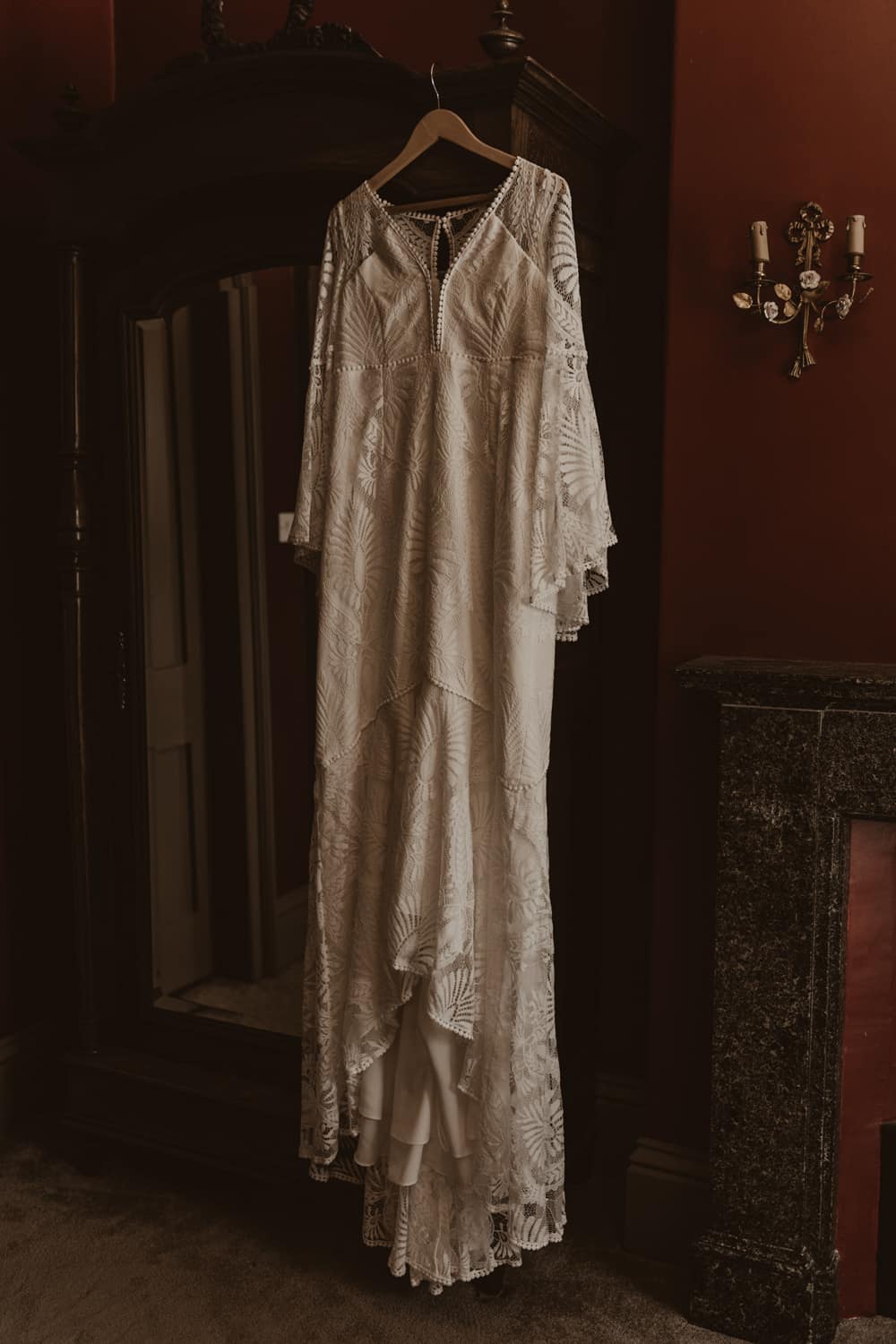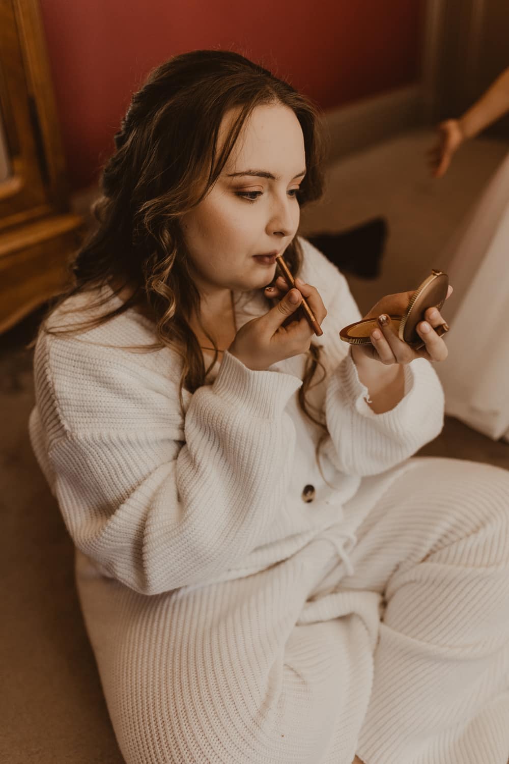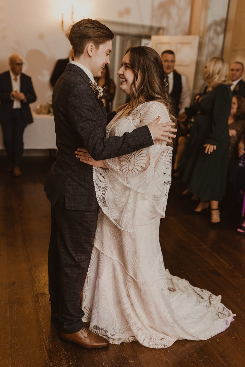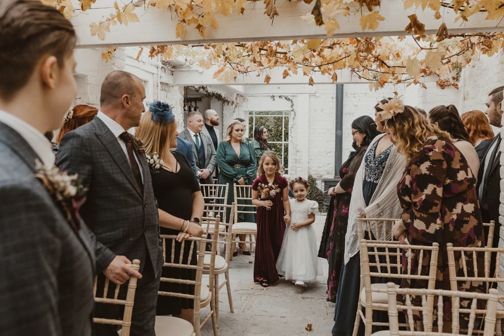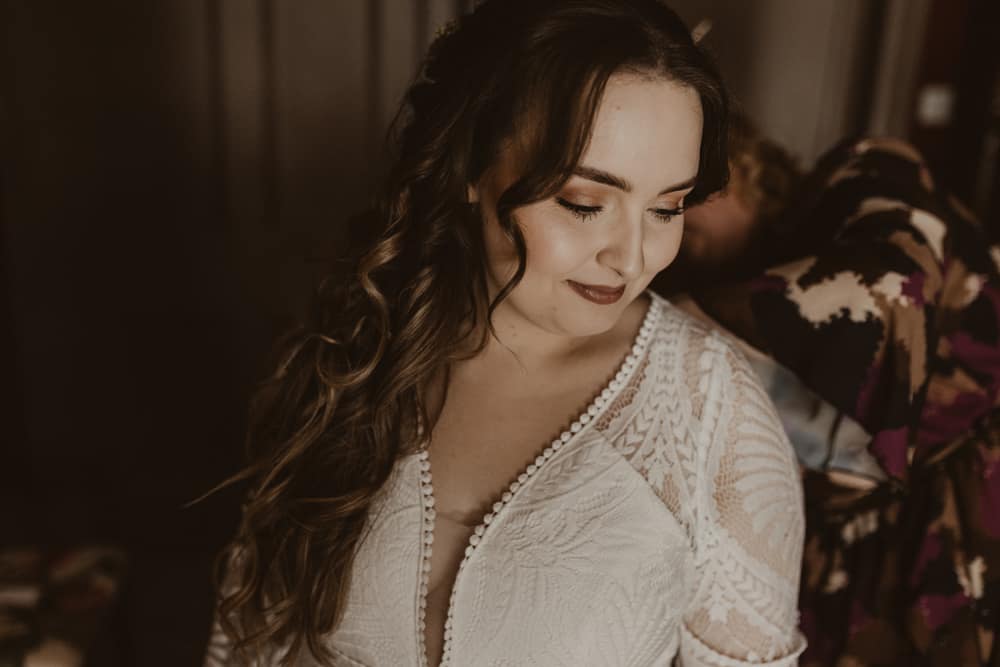 Tasmin and Becky’s intimate November wedding was boho in style but with a sprinkling of decadence. Our bride Tasmin wore a long lace gown with a train and bell sleeves. Her long hair was styled half up, half down with a long loose plait and fresh flowers woven through, finishing off her look with black Doc Marten boots and Pride socks. Becky wore a grey check suit with a dark paisley style tie and a buttonhole following the flower theme. The bridesmaids who were a range of ages wore burnt orange and dark red floor length velvet dresses – perfect for the time of year and their overall wedding vibe.