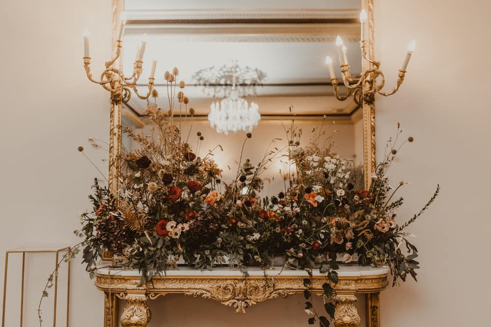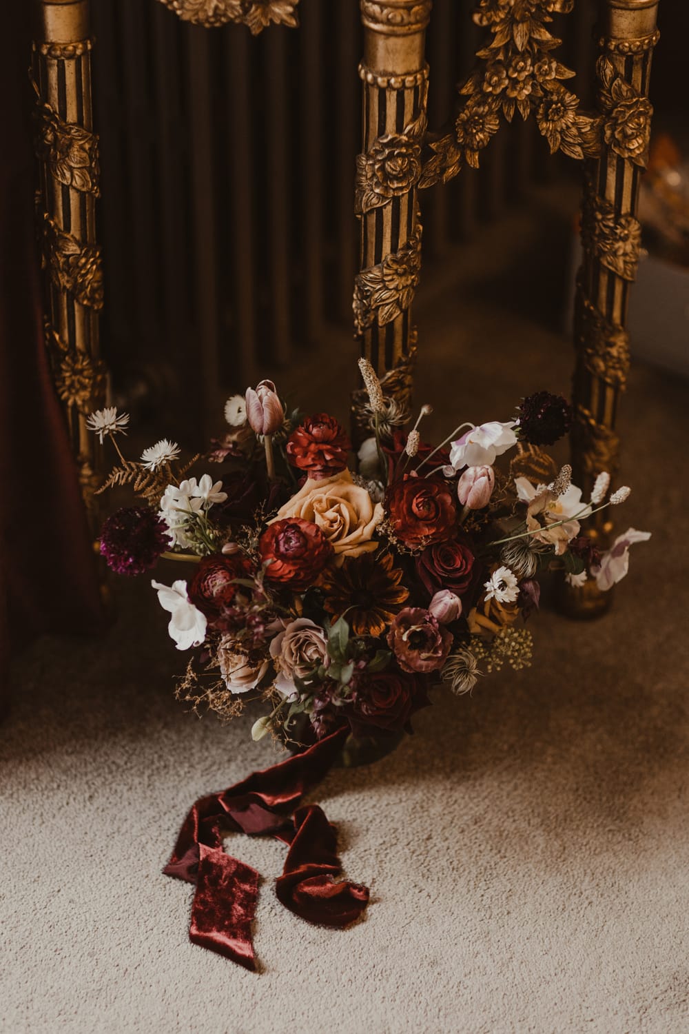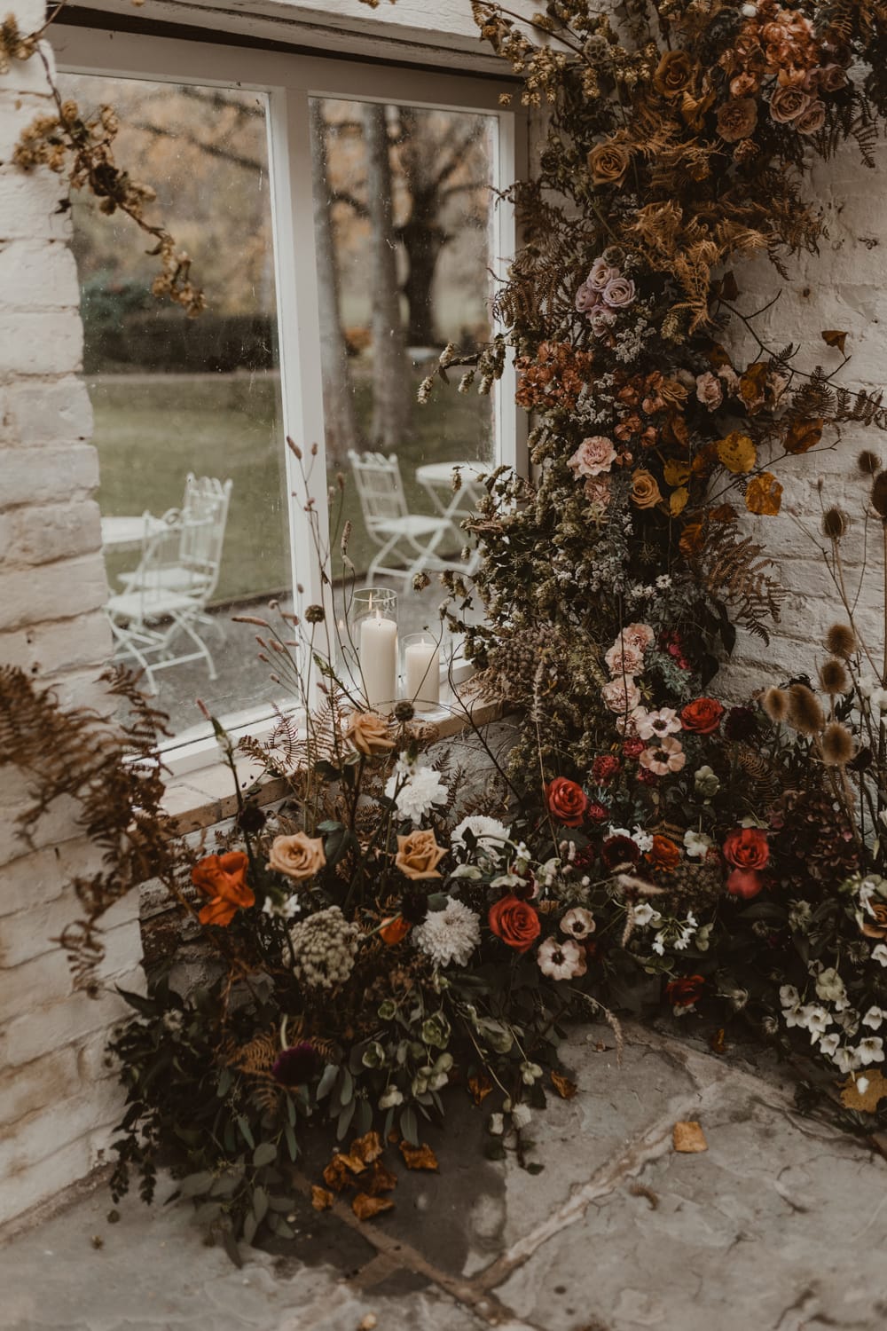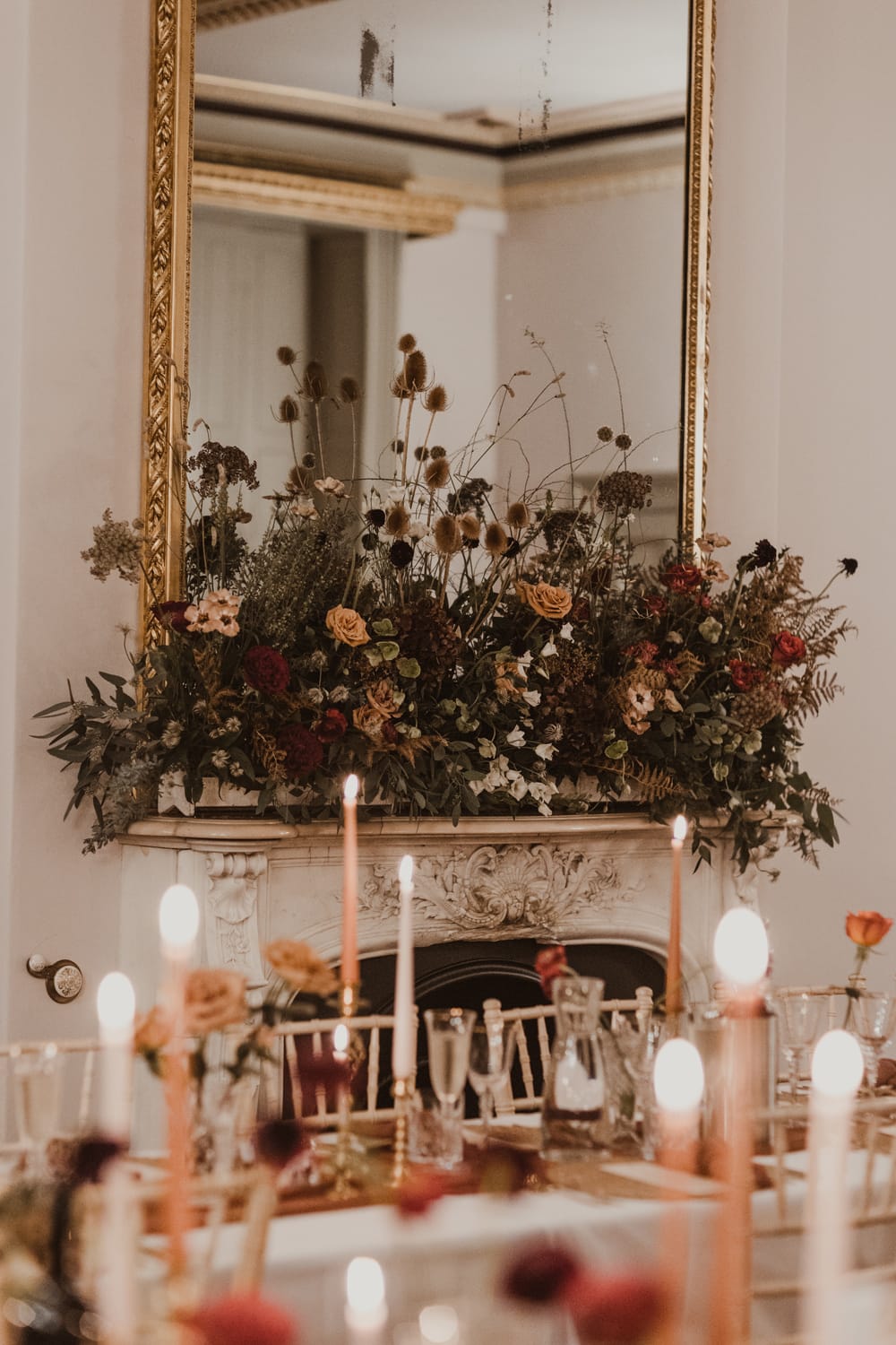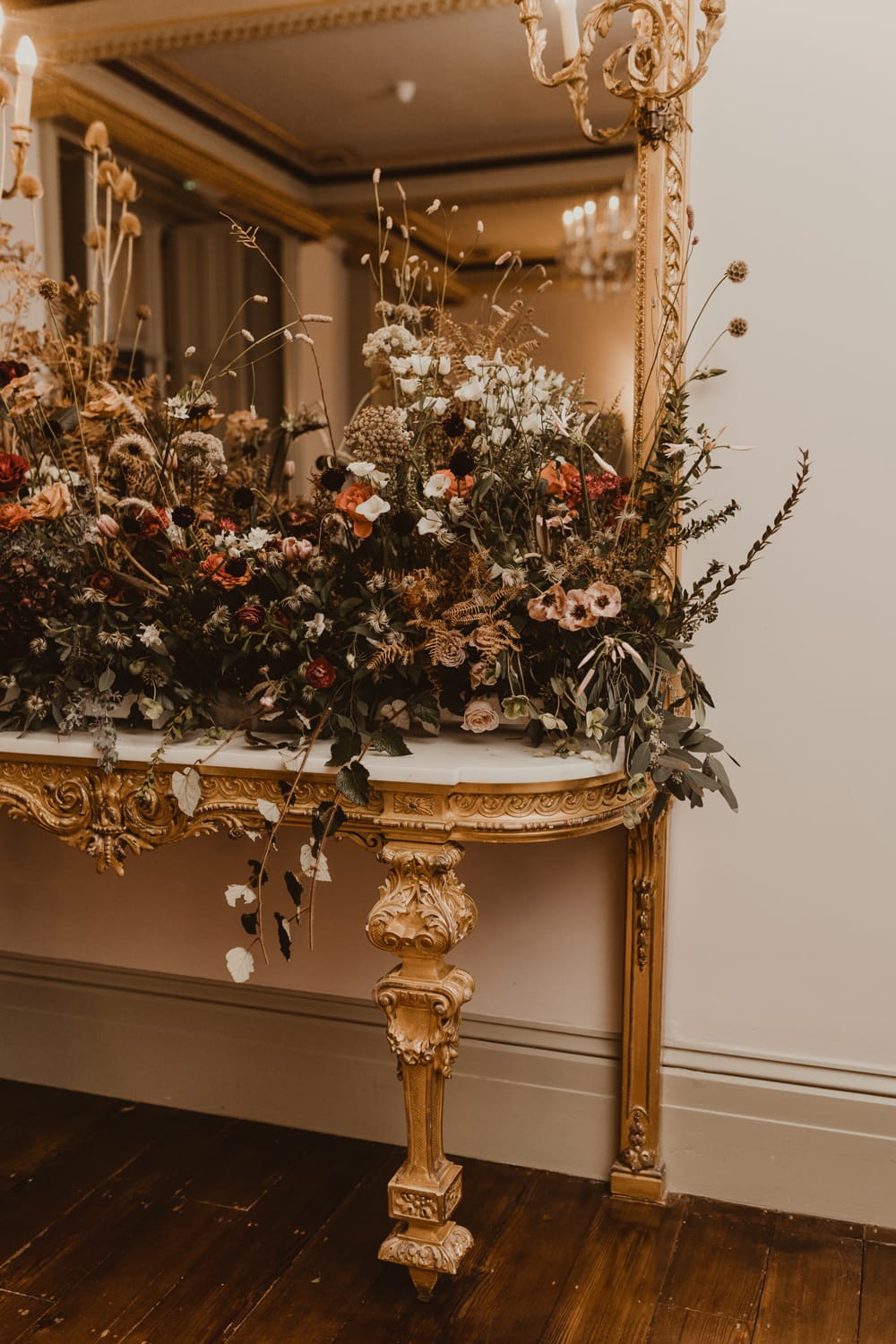Tasmin and Becky chose Pheasant Botanica as their floral designer. Donna is one of our top recommended florists and certainly knows to create an impact at Garthmyl Hall. The flowers of the day were powder pink and beige roses, lots of foraged dried bracken and thistles, red roses and red and orange ranunculus to name a few! They were all brought together in a beautiful rambling backdrop for the ceremony, which was then moved in parts to the mantlepieces in the Ballroom. To add to the atmosphere, Donna added lots of pillar candles in glass holders which were lit for the ceremony and created a really magical atmosphere for such a special occasion. In the Ballroom, she added lots of bud vases to the tables which were complemented by brass candlesticks and pale orange and blush pink candles. The bouquets followed the same wild, decadent theme and were bound with crimson velvet ribbon.