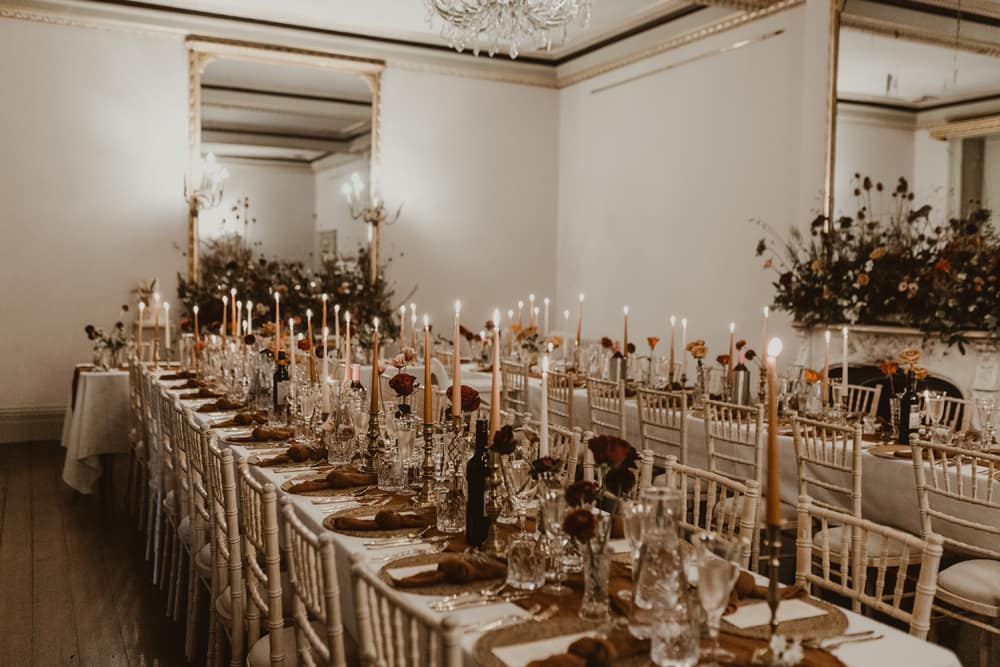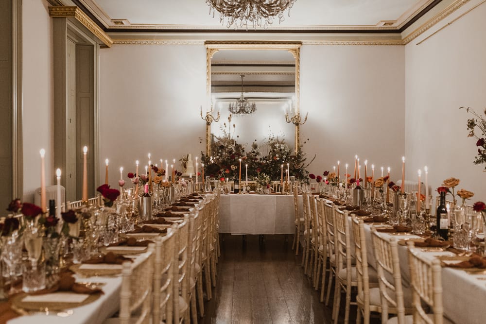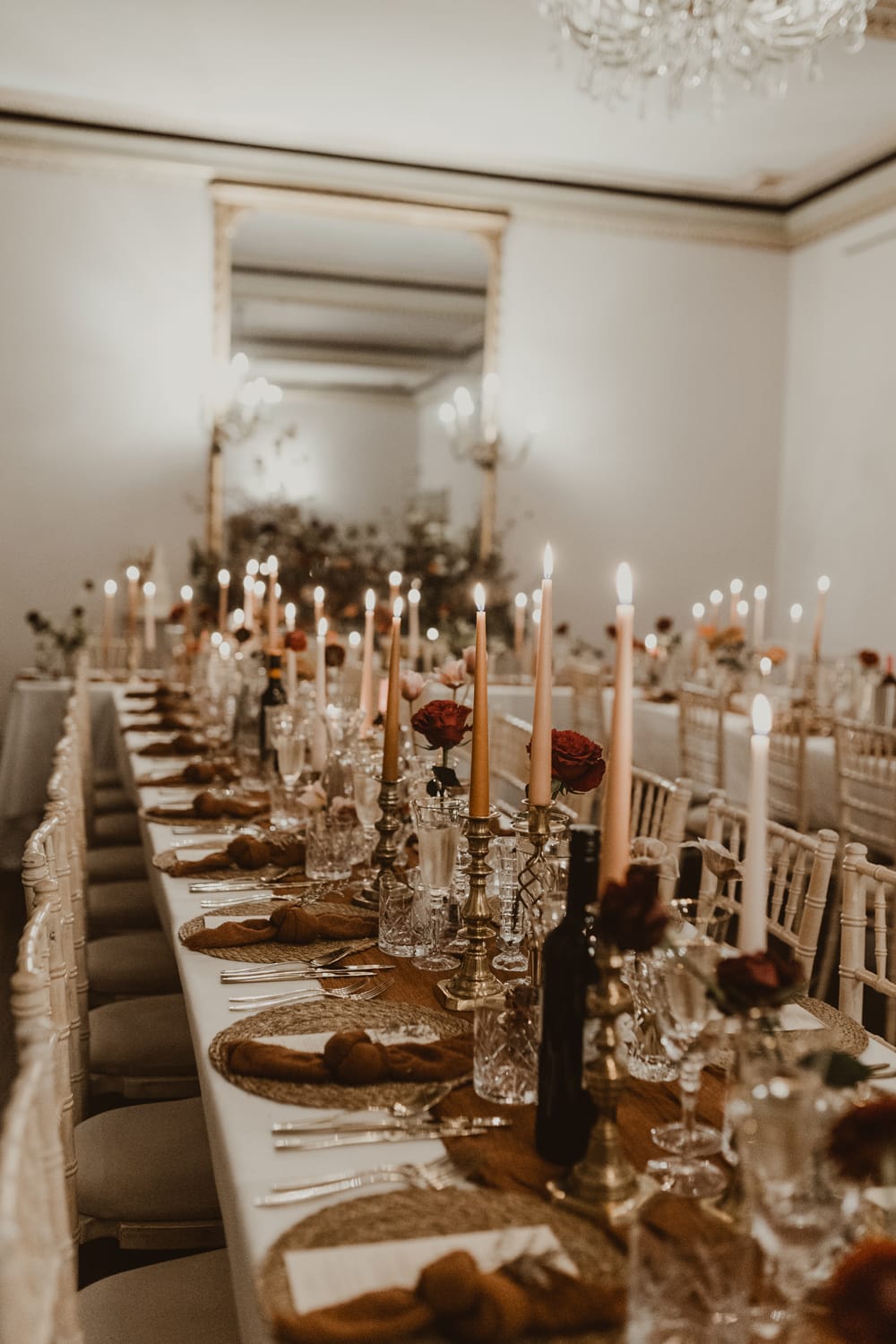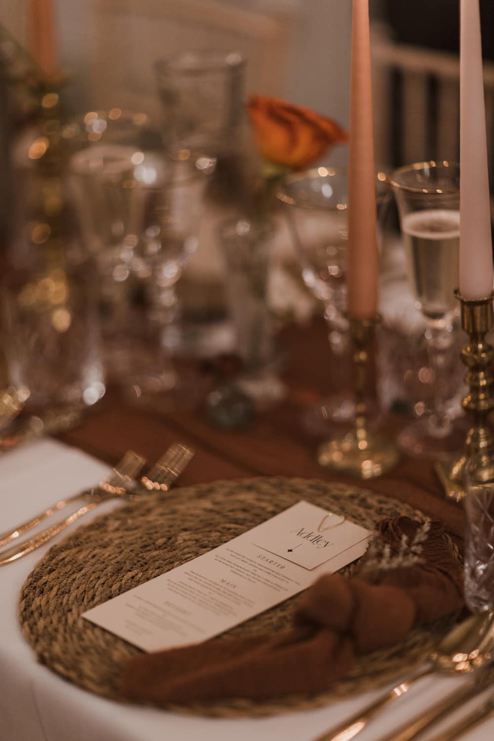 They truly embraced the time of year when it came to their theme. Everything was autumn-appropriate and the colour scheme of burnt orange/rust with pops of deep, dramatic red was absolutely stunning. We set the tables up in the Ballroom for them in a U-shape which was perfect for their size of wedding and created a beautiful, cosy ambience for the wedding breakfast and evening reception. The rustic trestles were decorated with a burnt orange runner, matching napkins, brass candle holders and gold cutlery. They chose woven straw placemats, gold rimmed glasses and stationery finished off with a gold teardrop paperclip.