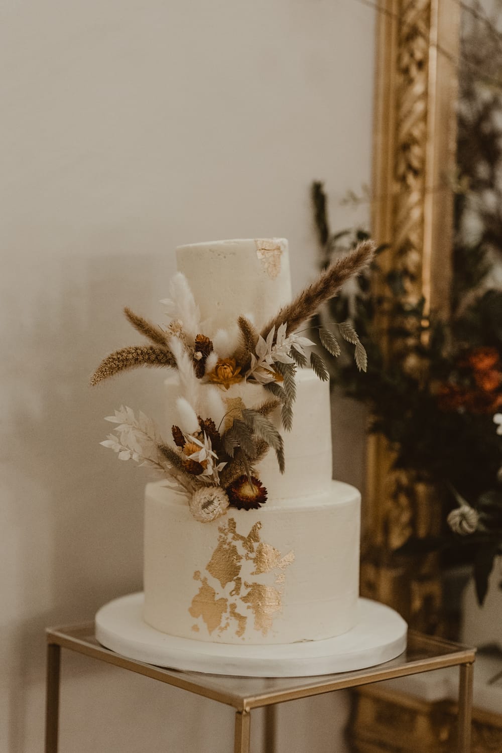 Tallulah & Co is one of our recommended caterers who is an expert at designing breathtaking menus for our couples that both look and taste delicious – Tamsin and Becky’s autumnal wedding was no exception! Their wedding cake by Red Rose Cake Co was a three-tiered wonder, iced in cream icing and decorated with gold foil, dried flowers and rabbit tails.