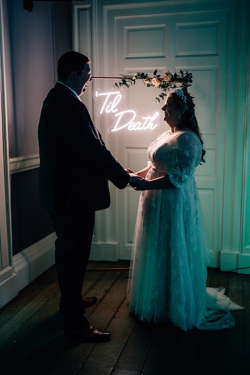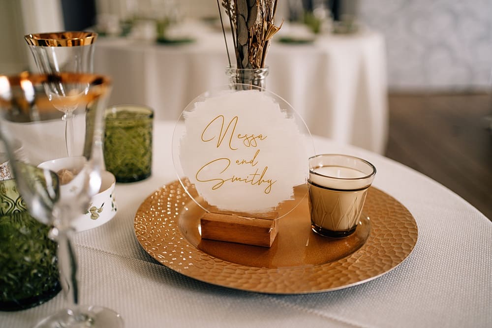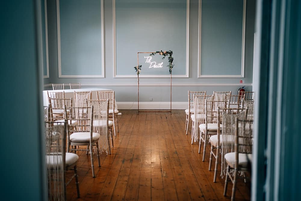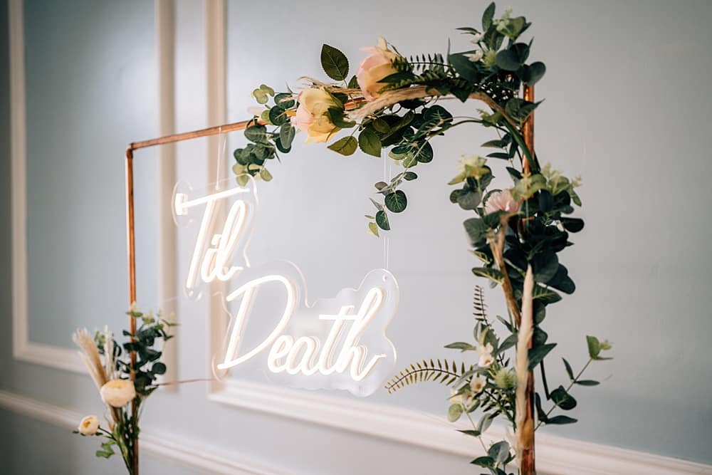 We didn’t originally have a theme for our wedding. I knew when we first started planning that I wanted to collect cups and saucers for the guests to use and I wanted to DIY as much as possible. A few weeks before the wedding I decided I wanted macrame on all the chairs instead of sashes, I was making these up until the day before the wedding! I also made table name signs based on our favourite TV couples. My dad made the copper arch which we hung our ’til death’ sign on and it is one of our favourite decorations.