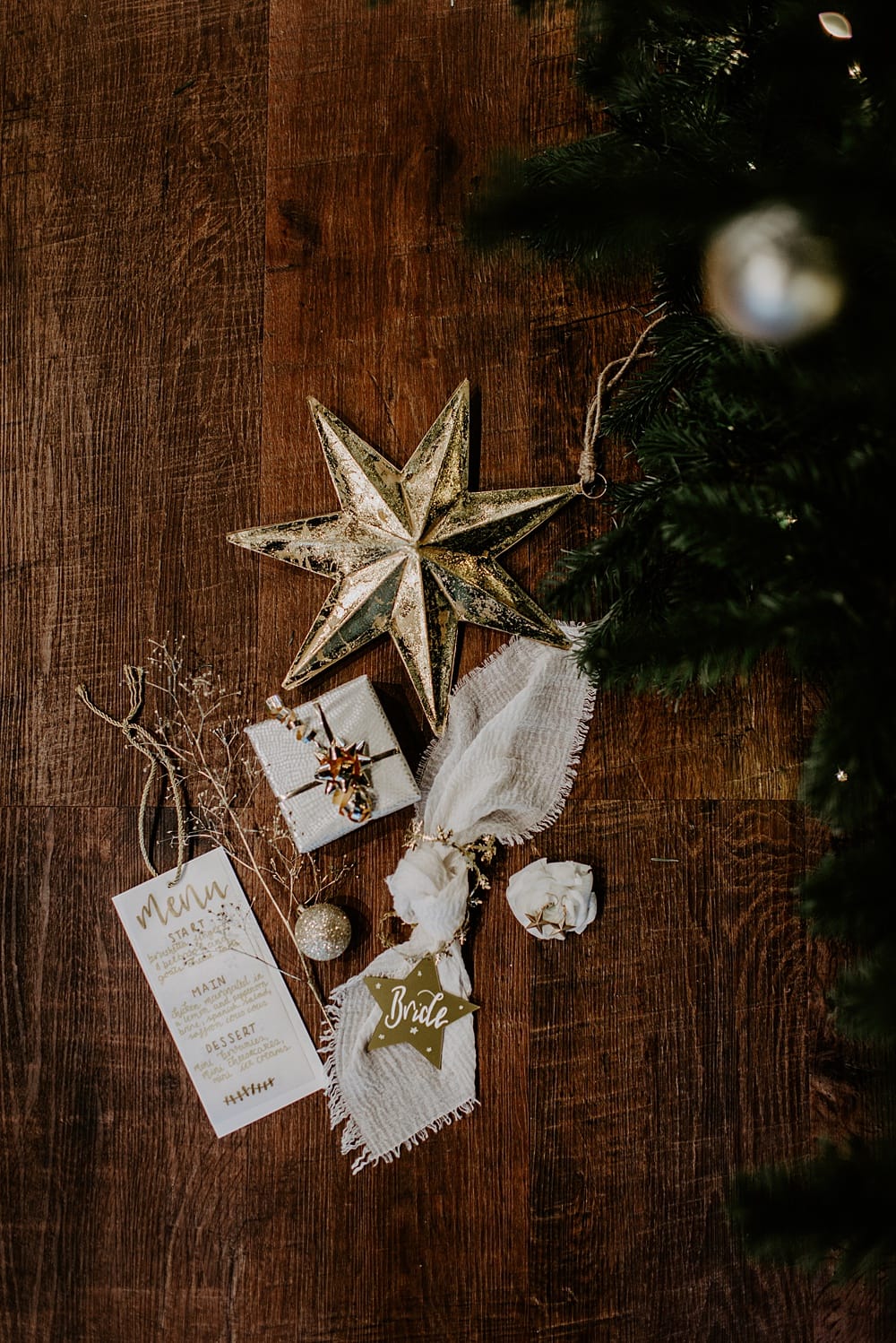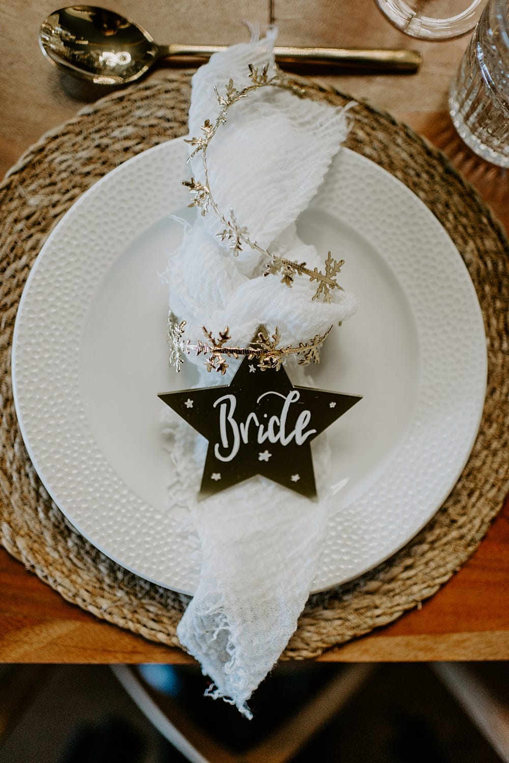 Crisp white and sparkly gold was the theme of our stationery. The gold star place settings complimented wintry white linen, and both worked well against the rustic wooden table and woven placemats.