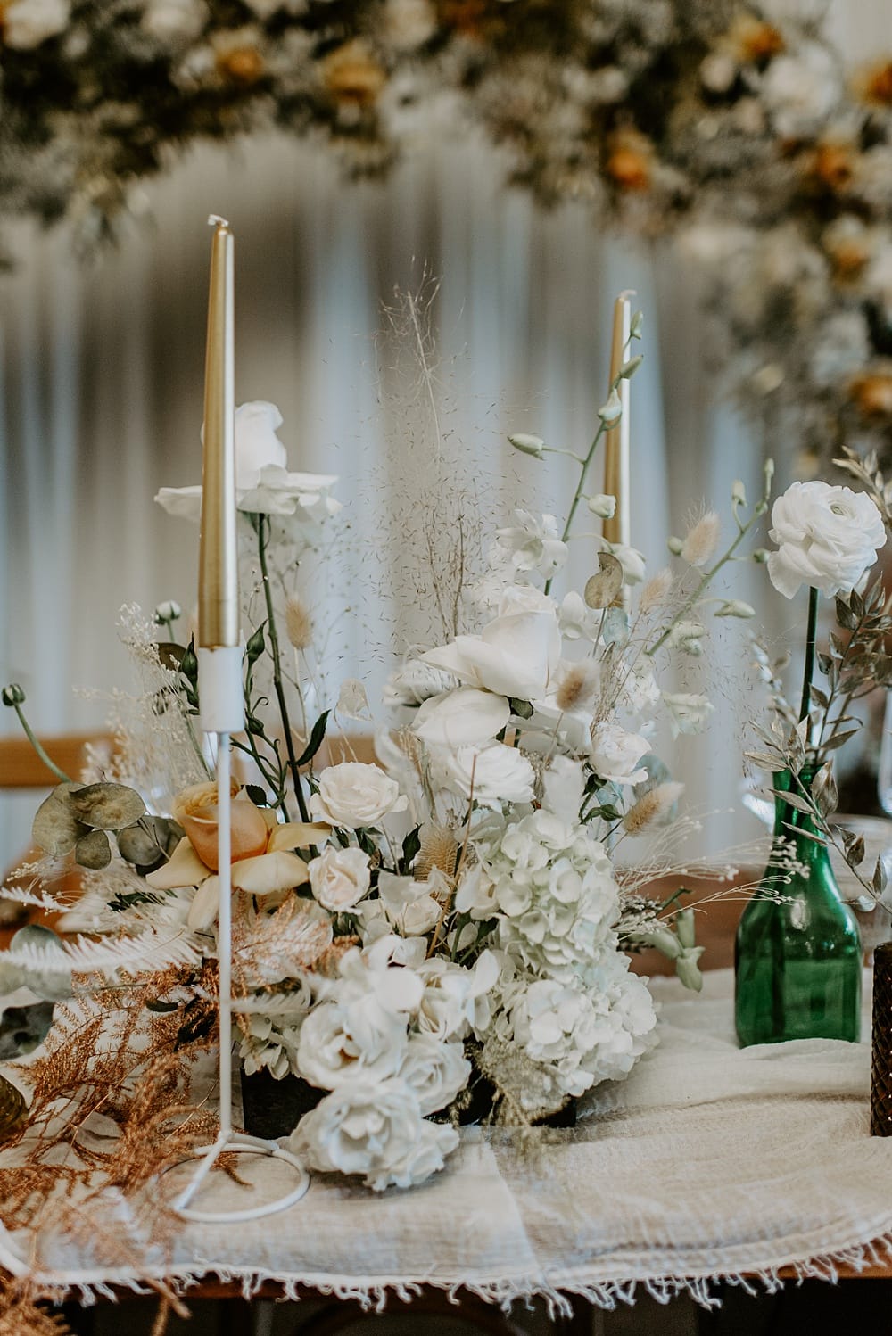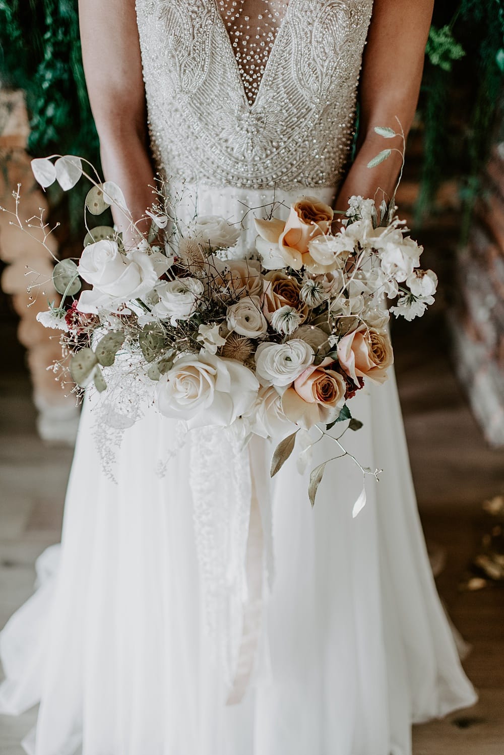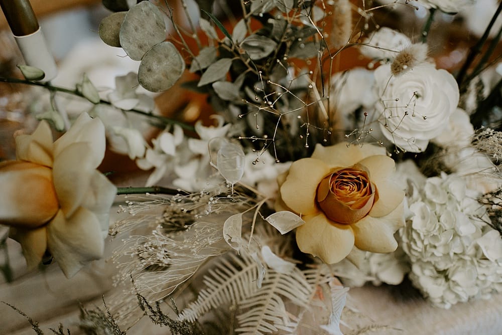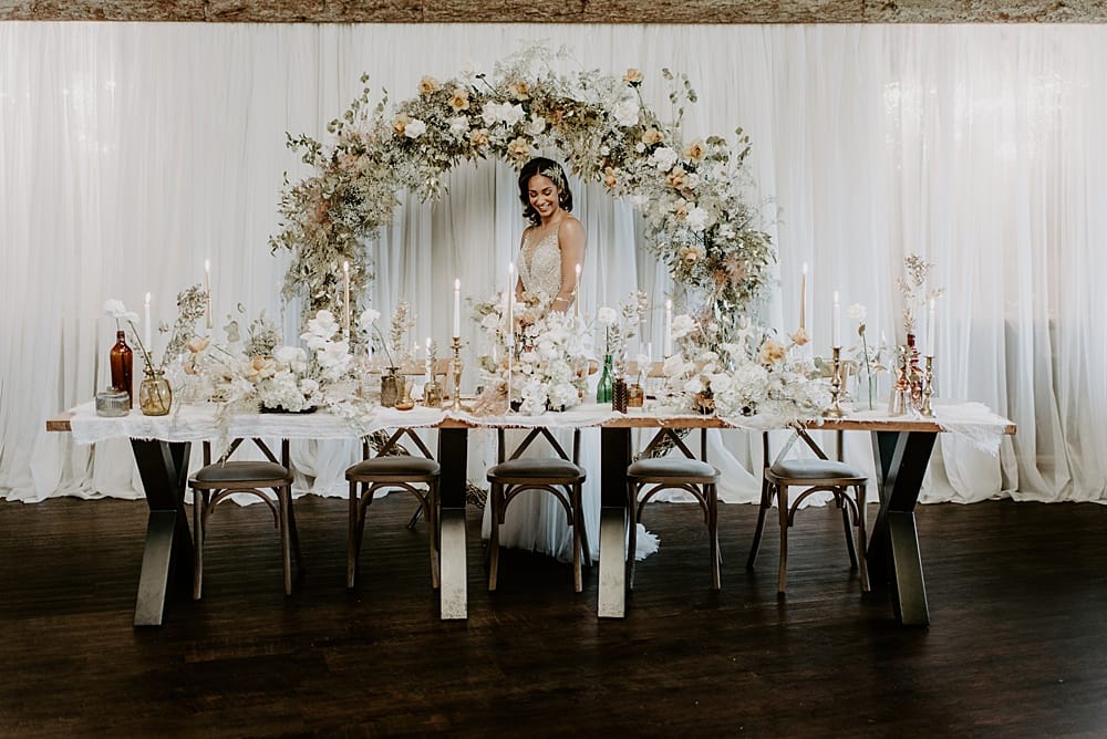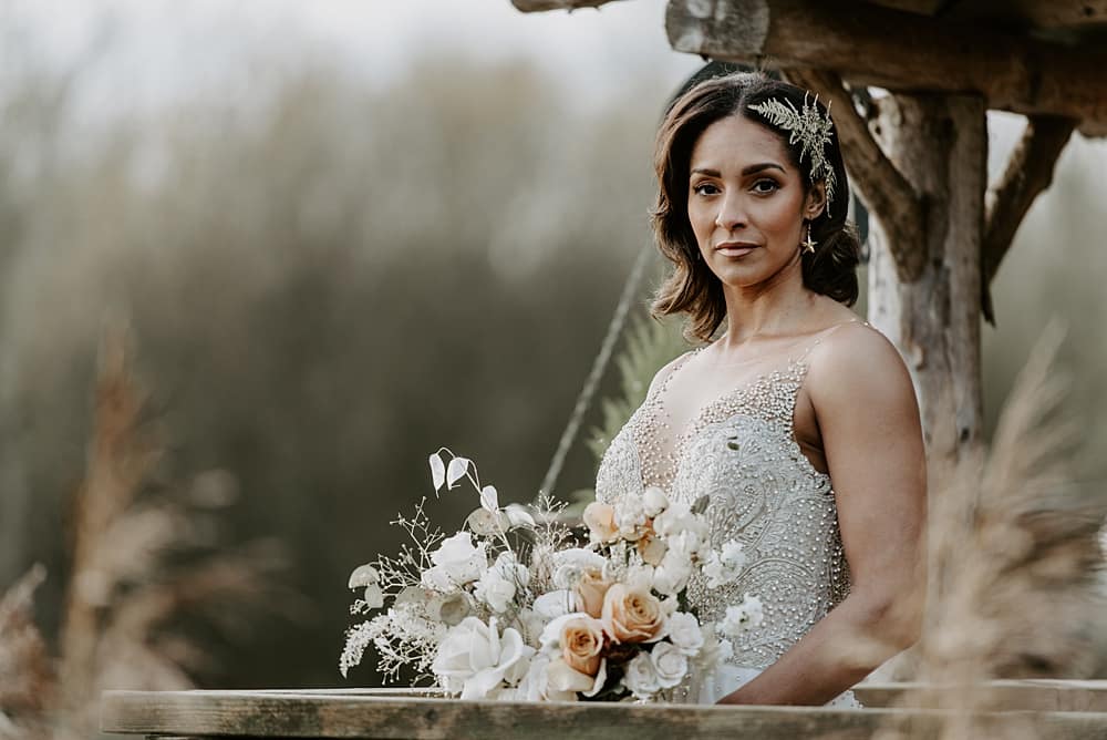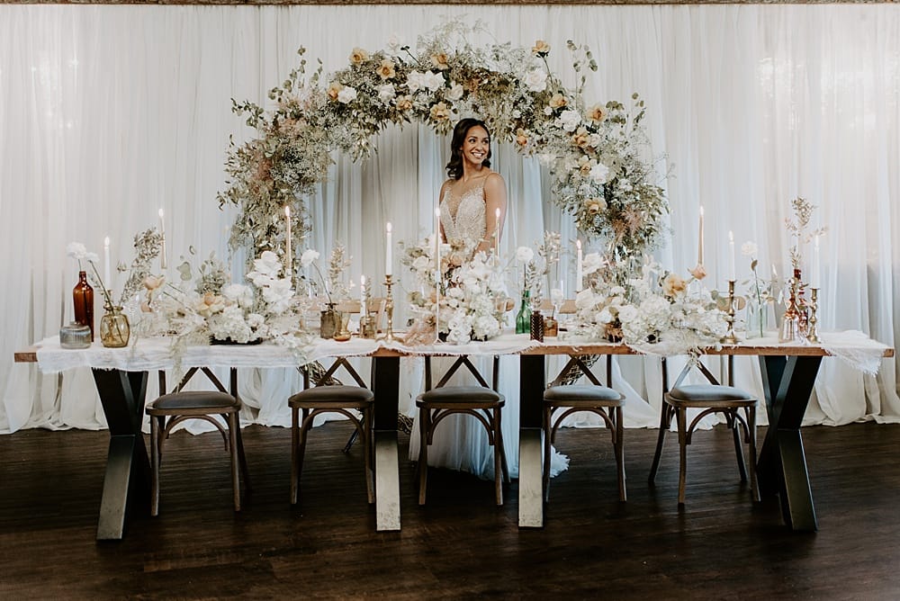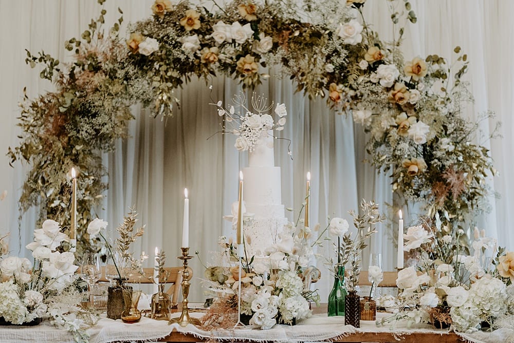 Claire’s willow moongate was transformed into a lush backdrop for the top table. A mix of orchids, honesty and gold eucalyptus paired with the timeless rose were used which added to the romantic element of the shoot.