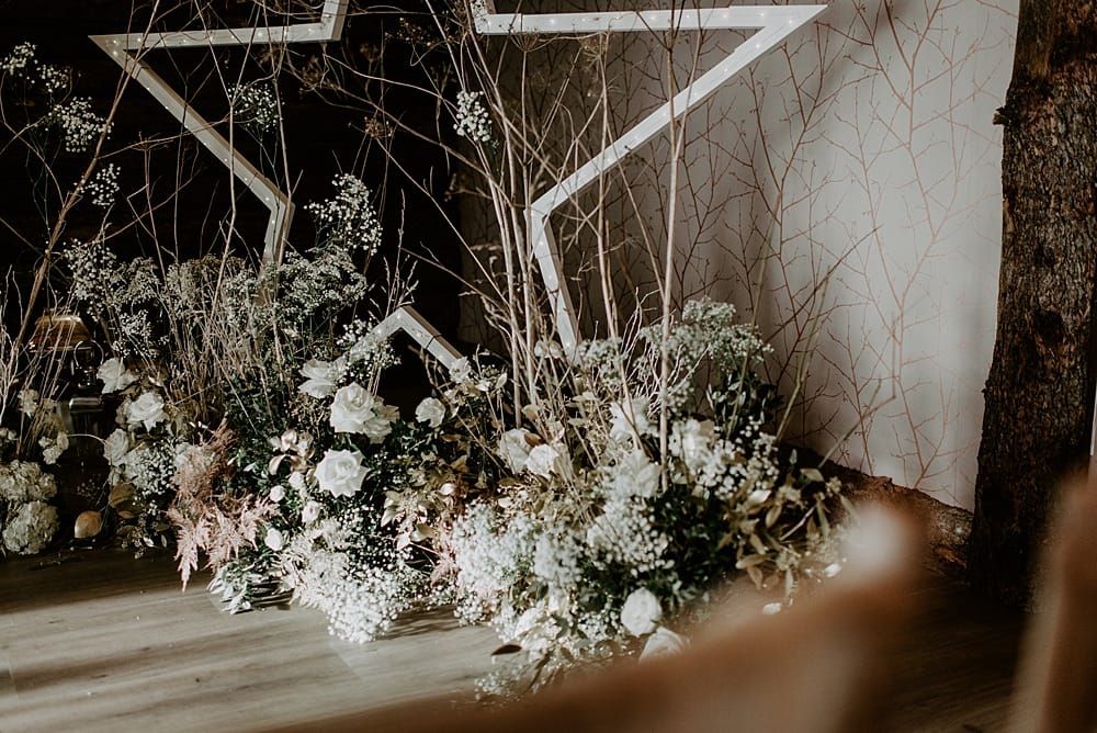 The oversized star, from Born Boho, was used as a backdrop in the ceremony area, styled with Bloom & Bridal’s contemporary grounded floral design. The arrangements’ wild form and natural tones gave a modern twist. The candle lit ceremony room and twinkle lights on the star added warmth to the lodge and completed the ‘cosy vibe’ look we were aiming for.
