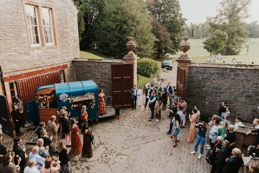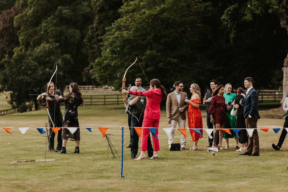 To kick start the celebrations, Thomas and Kayla welcomed their guests for an evening of highland games, falconry, and archery at the Castle. They then enjoyed speeches in the Castle’s Courtyard followed by live music and authentic Scottish food, including fish and chip van and sharing platters of locally sourced produce. The pre-wedding celebrations continued in the Vaulted Cellar and in front of the castle, with the band paying into the evening and guests enjoying the summer evening around the firepits.