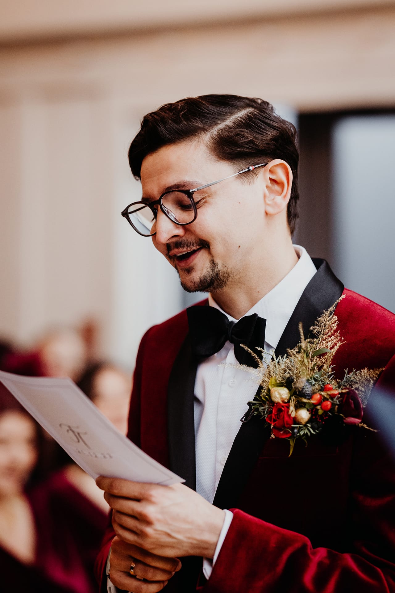 When we decided to have a winter wedding, we knew we wanted to go for traditional Christmas colours, so we opted for red and green. To give us the extravagance we wanted for our wedding, we encouraged a black-tie dress code for all the guests and chose velvet fabric for ourselves. Our suits were tailor-made by Zebel, who matched the suits to our vision.