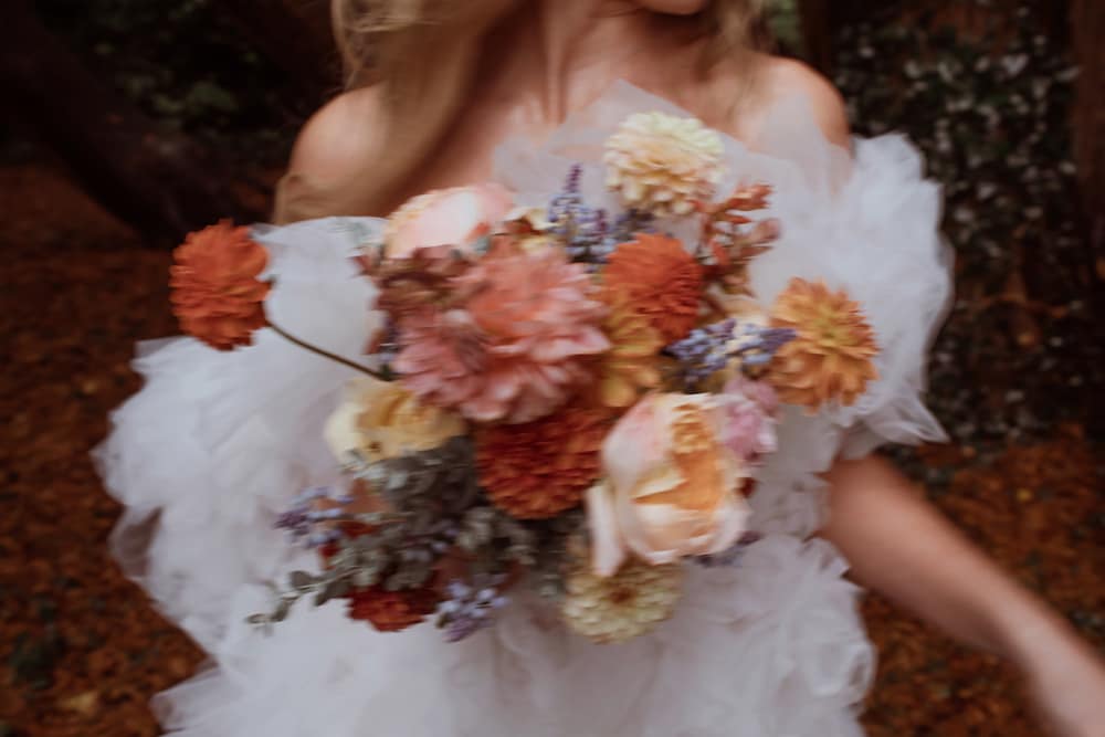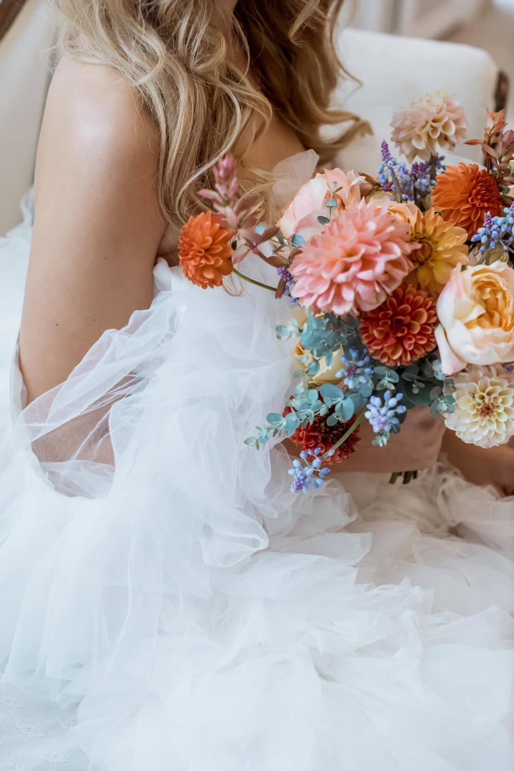 Our florist, Jodie from Copper Green, knew that dahlias had to be included. The range of colours available when they are in season is incredible. Ones that are homegrown in the UK are so vibrant but somehow with such a soft pastel tone that it makes your heart sing! They were the main stars and sat alongside roses, butterfly ranunculus and the palest ice-blue muscari. The roses added another more ‘blousy’ dimension that suited all the ruffles of the stunning dresses. The butterfly ranunculus and muscari were a dainty addition to add to more of a textured garden feel to make sure that nothing looked ‘formal’ and to add to the fun!