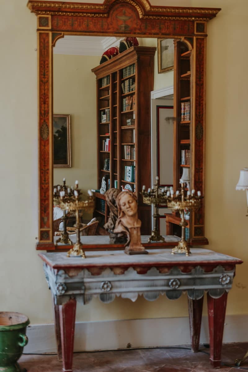 We designed some back drops using furniture and objects already within the house – huge old gilt Rococo mirror frames, antique Louis IV upholstered chairs, antlers, giant pine cones collected from La Belotterie’s own pine woods, a homemade tipi made from bamboo poles growing in the garden and fresh food from the local market and Patisserie in Castres. The dusty blue and soft pink colours of pom moms and lanterns were chosen to tie in with the brides dress colours, as well as the crockery.
