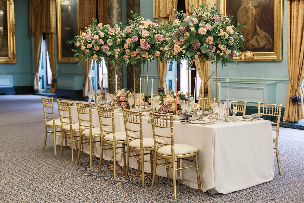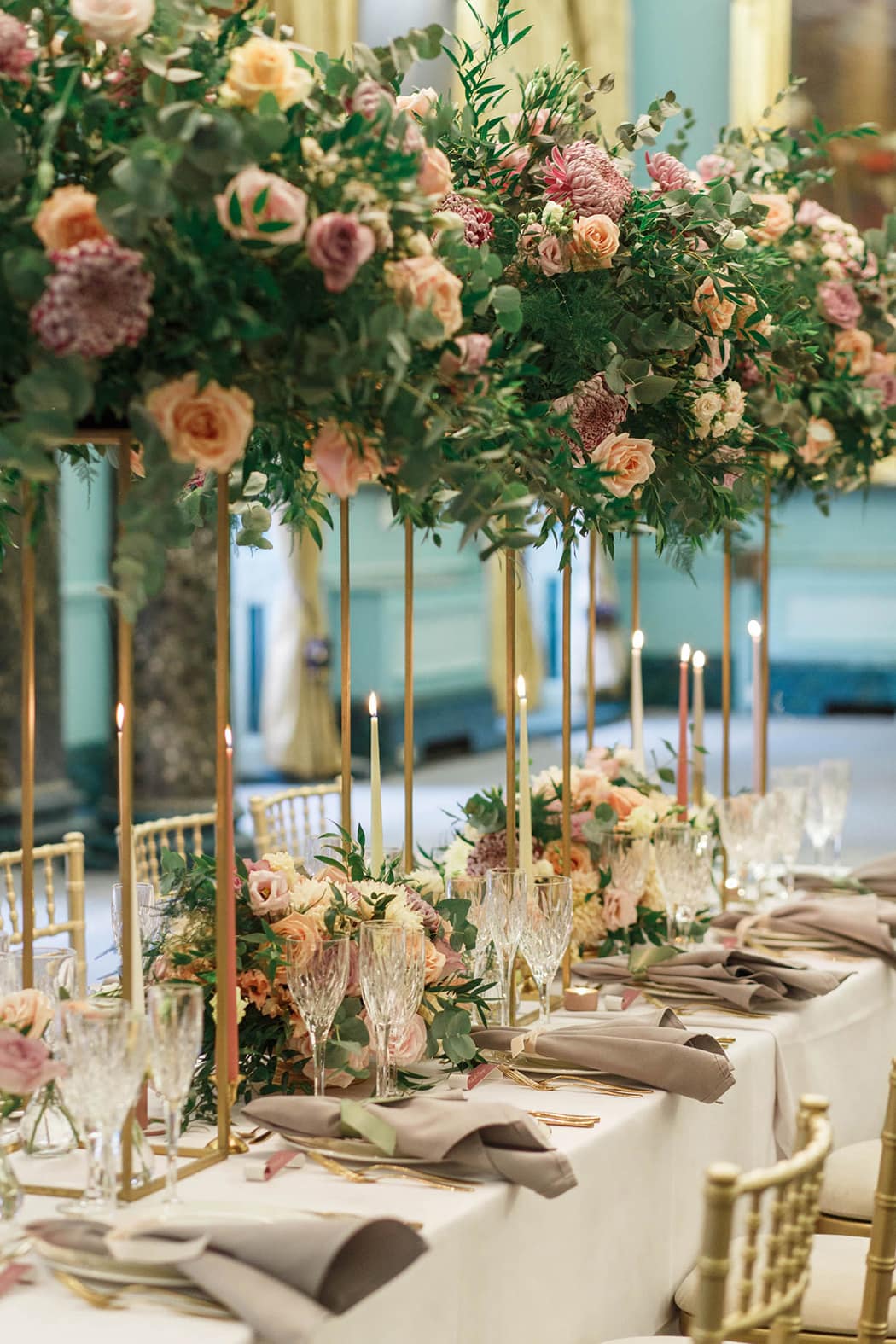 The Nash room is a very grand space that can seat 250 guests. It has amazing opulent chandeliers and large windows that have beautiful natural light surrounding it. We wanted to create a table that was large and could be a center focus whether you had a wedding for 30 or a wedding for 200 and wanted to mix it in. The raised flower arrangements were very fitting for a room that has such amazing high ceilings. We sprinkled in personalized London touches with a custom map of the couples favorite London