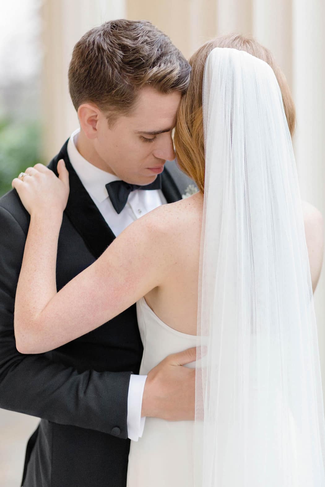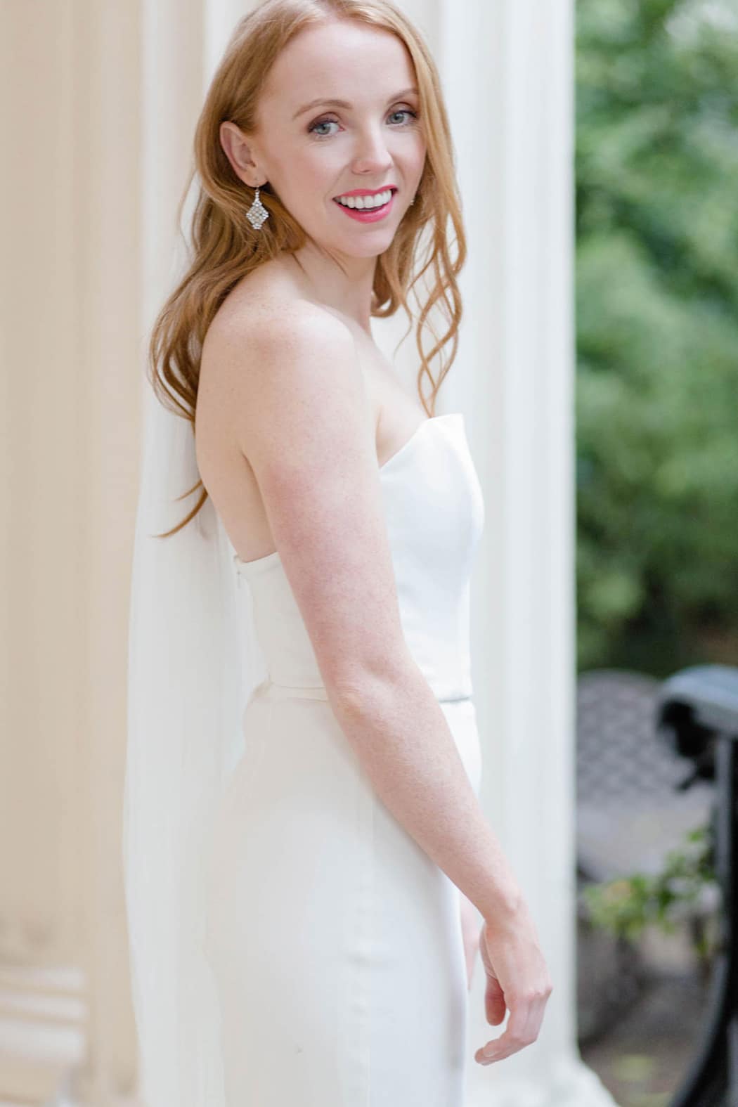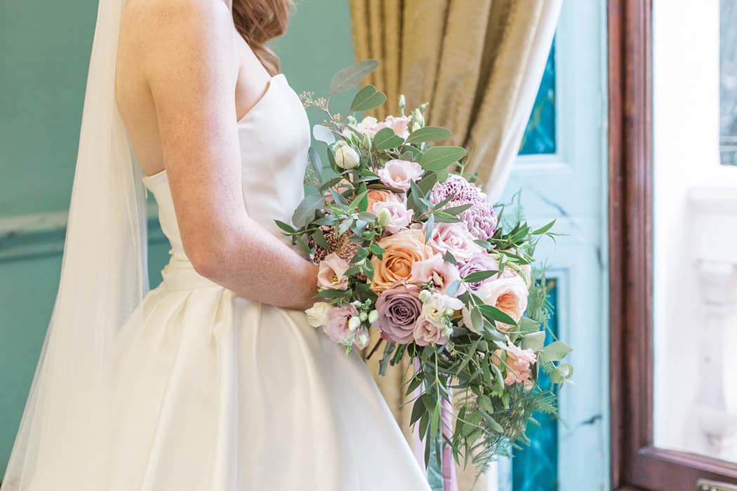 We dressed the bride in HalfPenny London Olivier dress and the statement Christian Skirt I imagined a bride walking up the staircase with a statement skirt on and afterwards removing it to showcase a simple classic dress. The venue is so grand that a classic dress made by a local London designer was perfect!