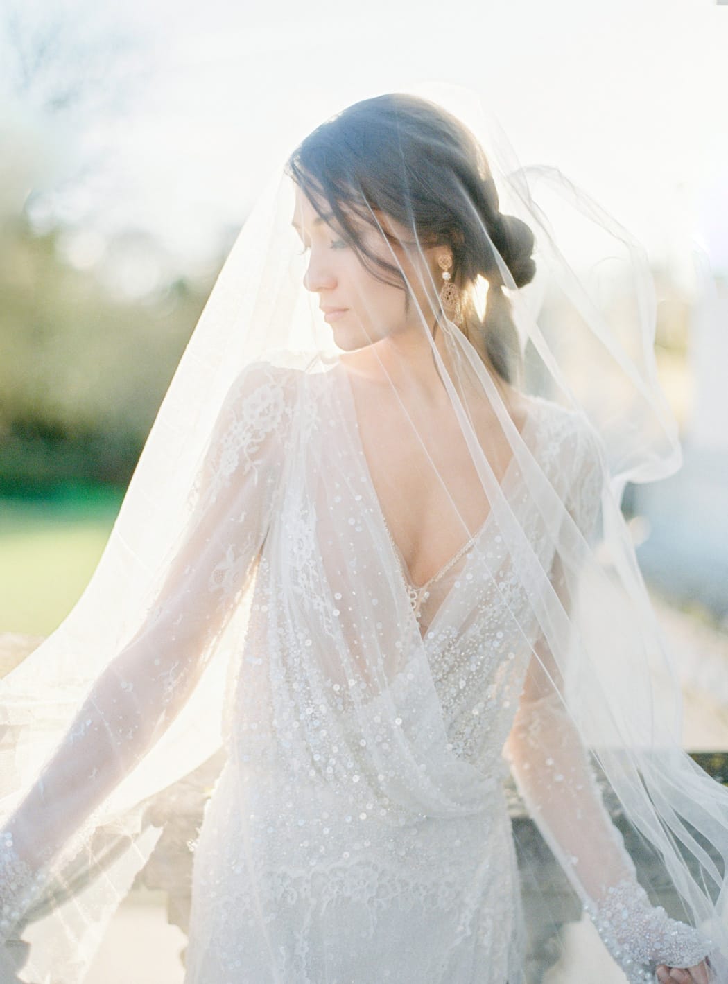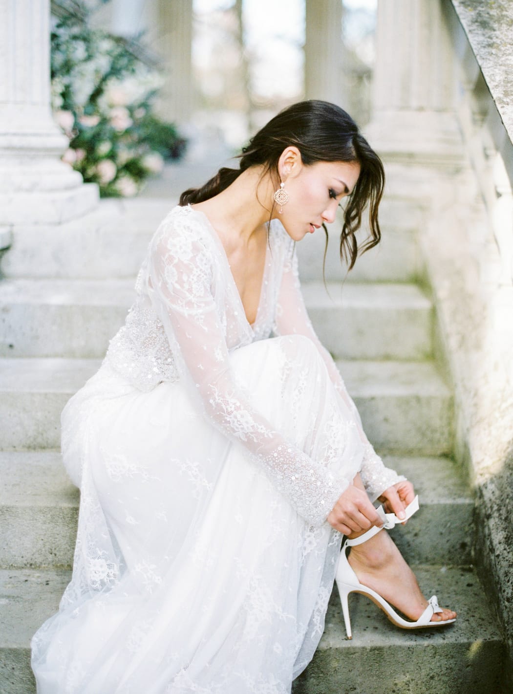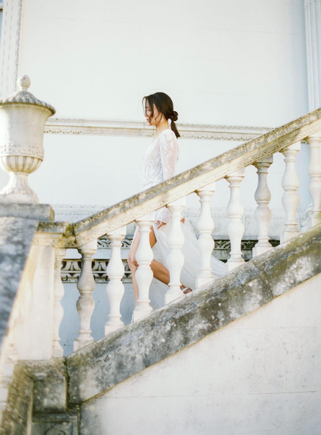 Our bride wore a truly magical bridal gown by Israeli designer, Inbal Dror; its delicate embroidery and beading paired with the sheer fabric and high leg split worked perfectly with the venue, that gorgeous light, and the exquisite floral designs.