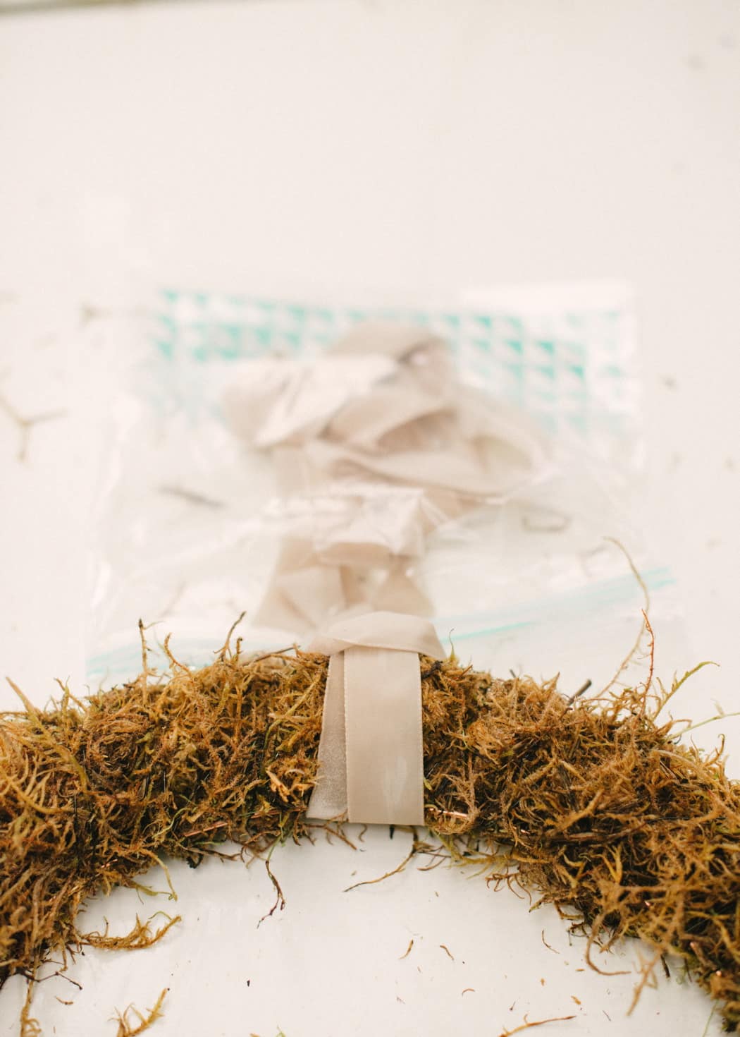 Next start inserting the moss into the copper wire ring to fill it out, as you go take your reel of wire and wrap around the moss tightly to keep in place. Repeat this process until the circle has been filled and then repeat 2-3 more times for good measure! Each time wrapping your wire around the moss and ring tightly to create a secure base.