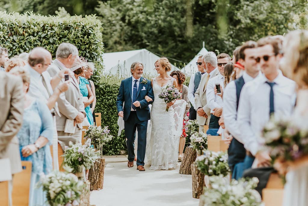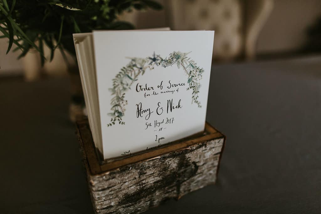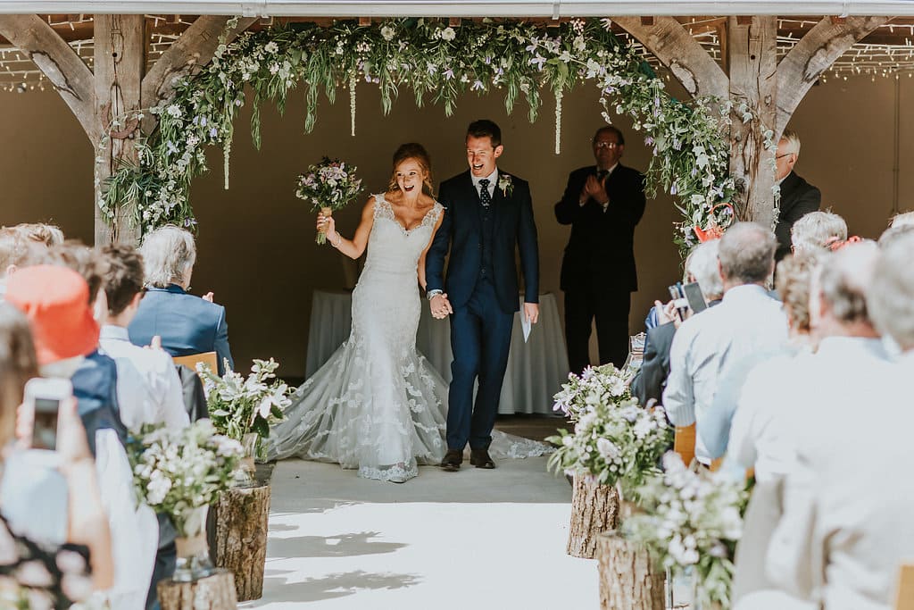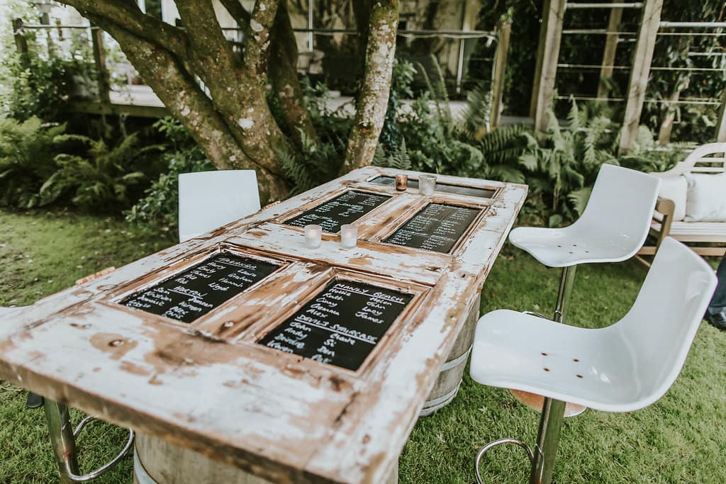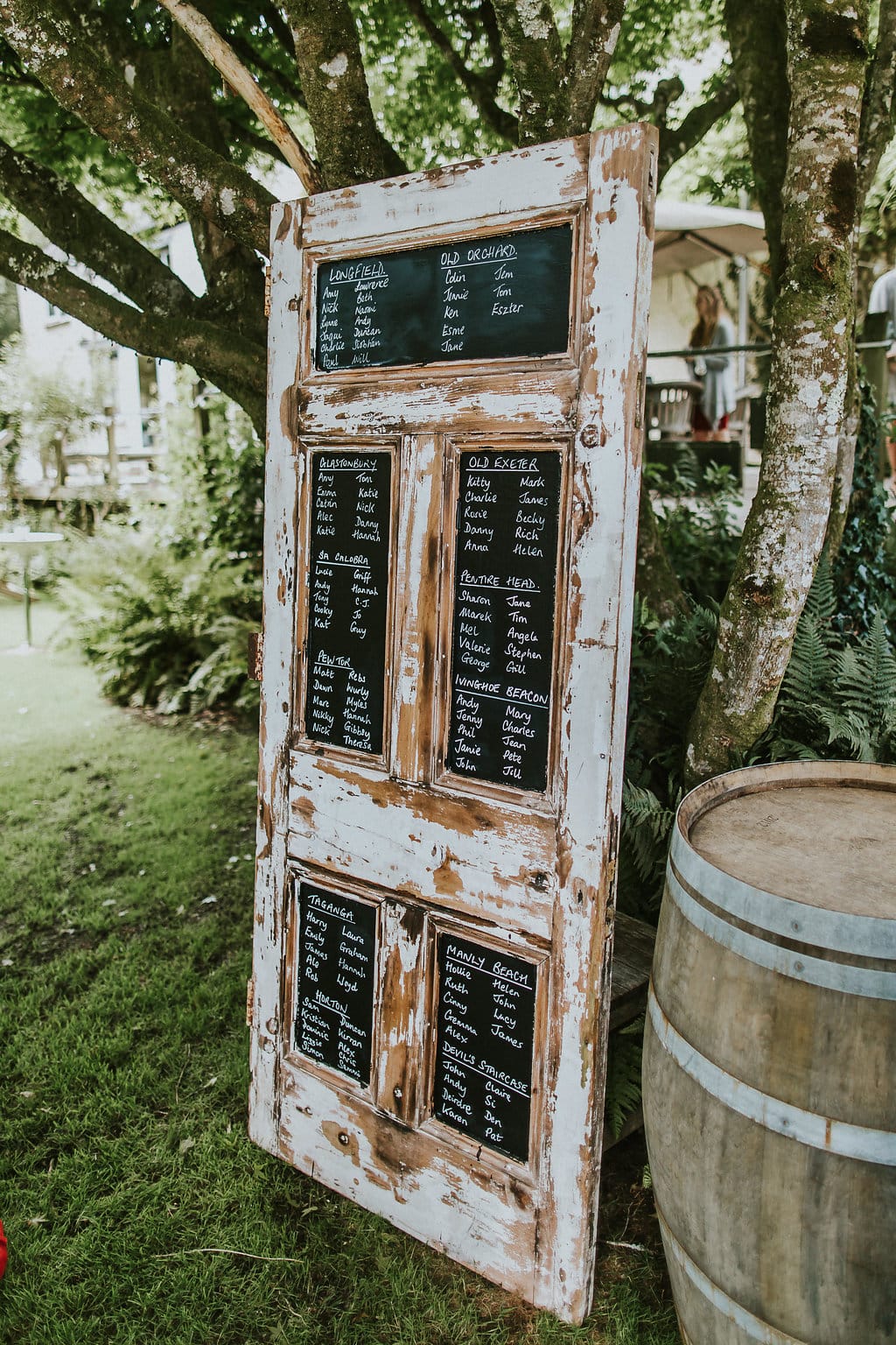 Our beautiful wedding stationery set the styling of our wedding from the start. The floral design on the invitations ended up being the inspiration for the floral arch in the wedding barn. It was important to us that the styling and flowers should only enhance Ever After’s beautiful gardens of. We used slates as table names and a beautiful reclaimed door as the seating plan. We also wanted to bring the beautiful gardens into the marquee and used our flowers and foliage in hanging arrangements and organic edible flowers were incorporated into the Devon Pimms we served as arrival drinks, as well as, featuring in the dessert.