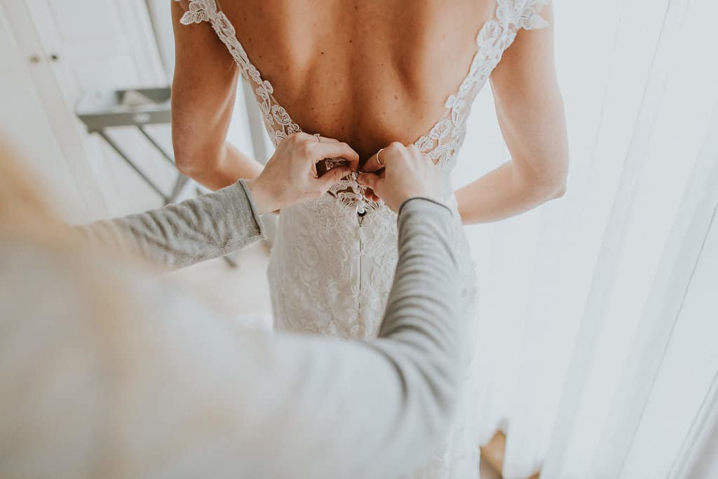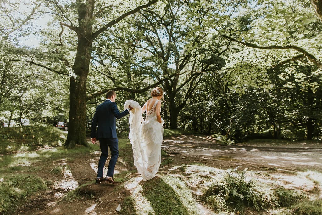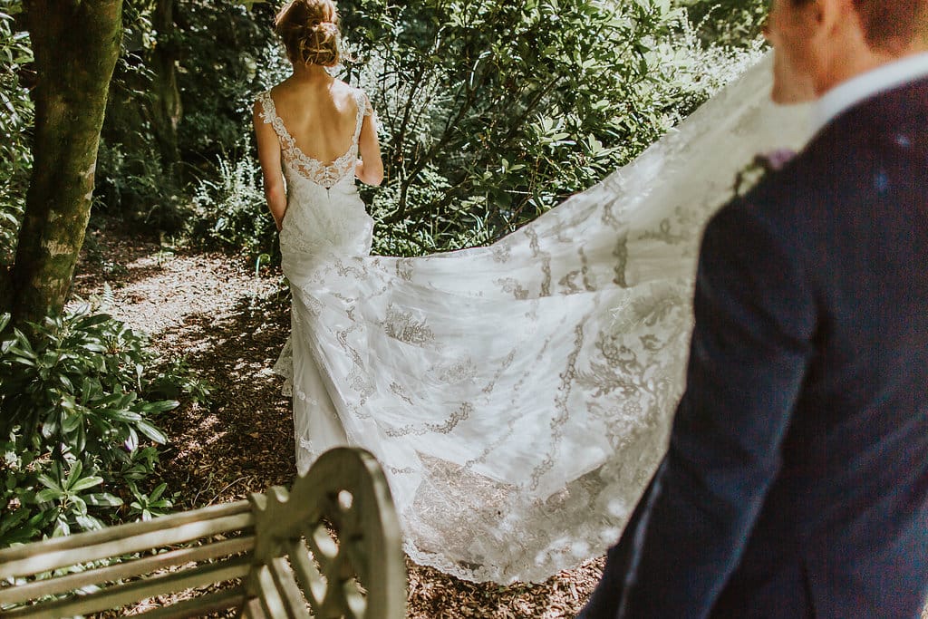 I had no preconceptions when I started looking for my dress. I was open-minded and tried on every style imaginable but was so thrilled with the dress I finally chose: a Martina Liana dress made of the most beautiful lace that really reflected the Dartmoor hedgerow flora. It had a long cathedral train which I was completely in love with. It was backless and had incredible lace straps which delicately incorporated lace leaves and tendrils.