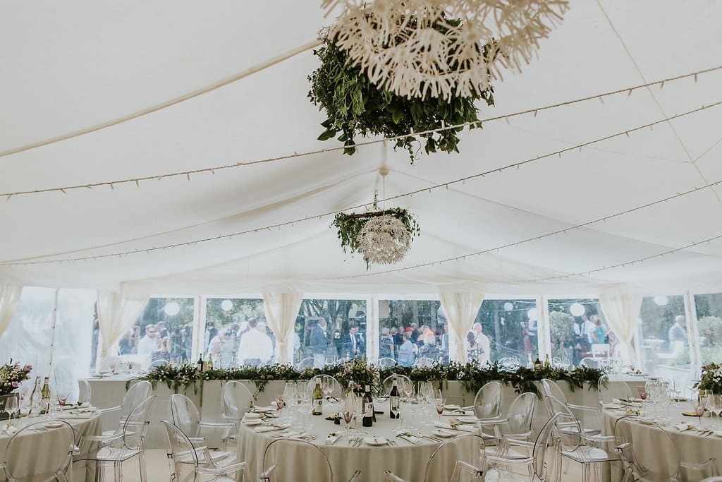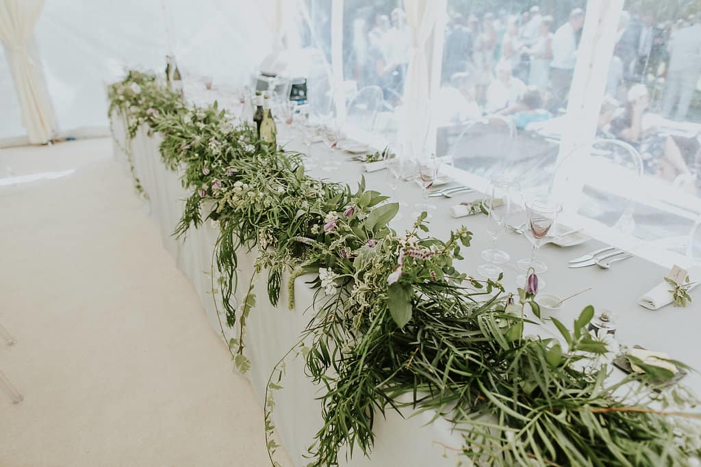 The arch for the wedding barn, the aisle flowers, the bouquets and buttonholes were created from a beautiful mixture of Clematis, Snowberry, Veronica, Scabious, Amaranthus, Eustoma and Hypericum Berry, as well as foliage in abundance. The arch in the wedding barn also consisted of carefully considered scents creating a natural aroma. The buttonholes even attracted bees and butterflies over the course of the afternoon. The foliage arrangements hanging from the marquee ceiling and lining the top table succeeded in bringing the essence of the beautiful gardens inside the marquee.