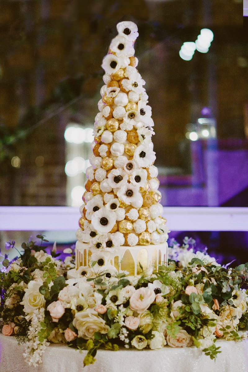 I think even before we got engaged we’d spoken about having a croquembouche wedding cake! Katie from Couture Cakes created a croquembouche masterpiece with a twist – the profiteroles were dipped in white chocolate and decorated with a mix of smooth shimmer, glitter, shimmery coconut and gold leaf. This was then placed on top of a luscious lemon cake, encased in lemon butter cream and gold leaf, with shimmering white dripping chocolate, which then sat on top of a bed of flowers.