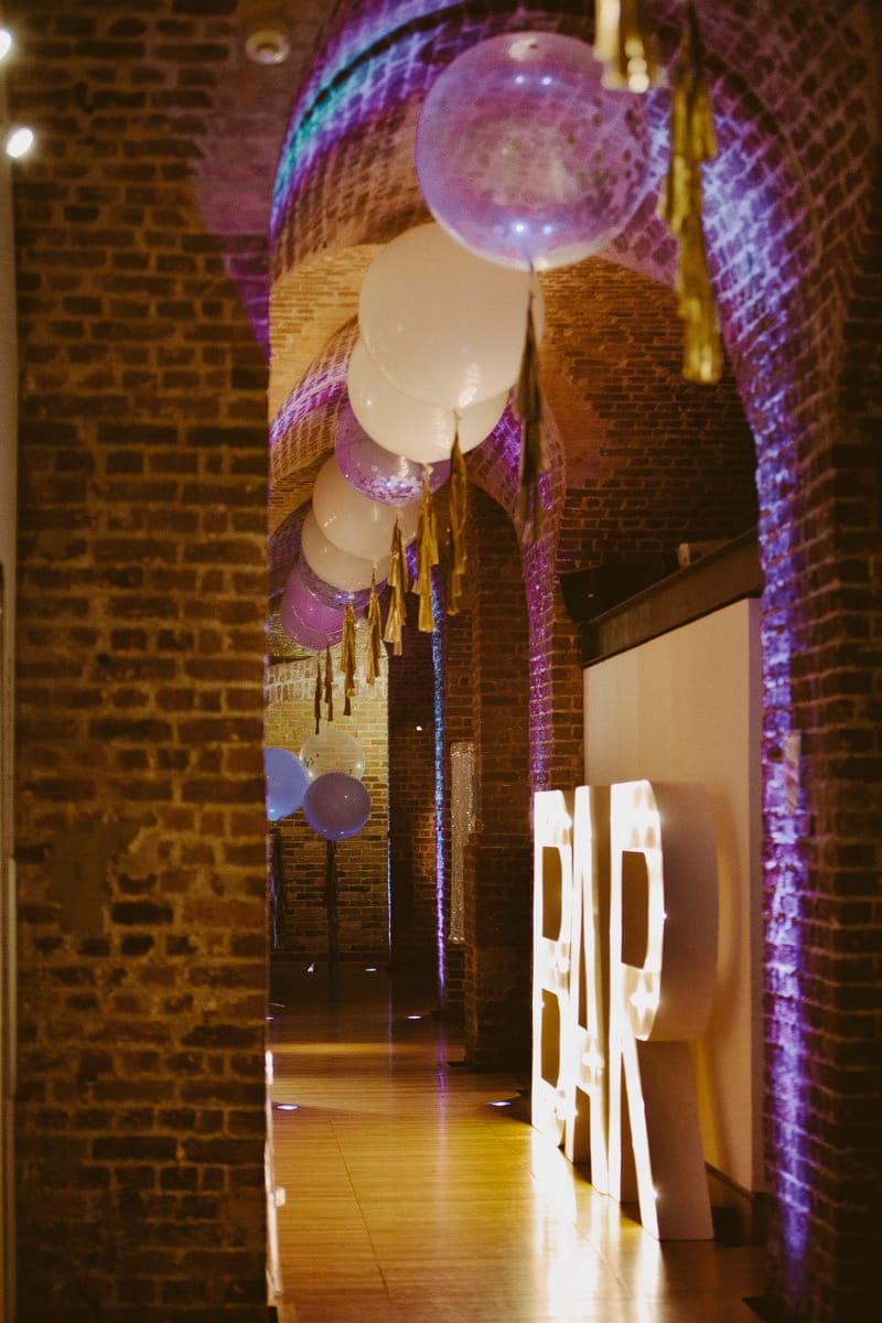 As we opted for a winter wedding we wanted a classic, timeless, intimate black tie affair filled with an abundance of candlelight. In the evening, we transformed the Vaults to create a party like environment for our guests with a separate chill-out zone, gold mirrored circular bar, illuminated letters and a Bubblegum Balloon lined corridor.