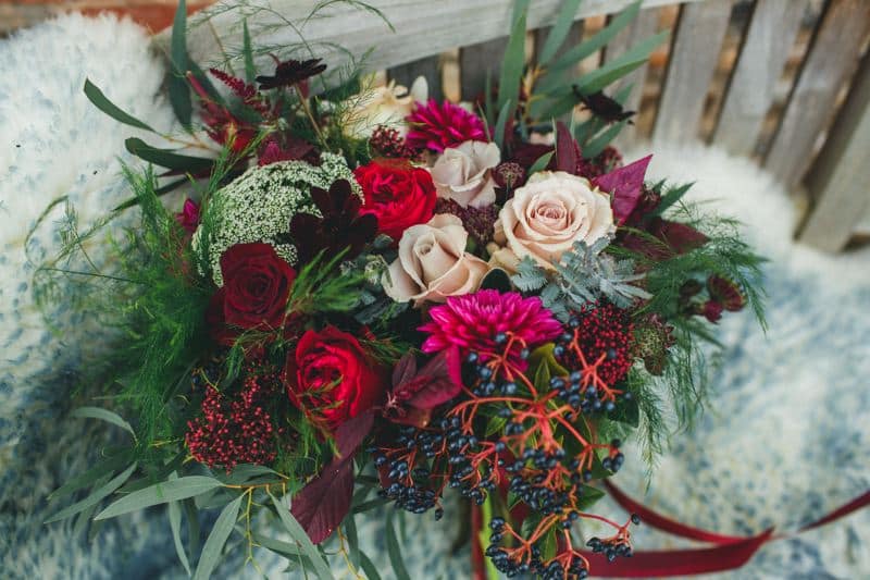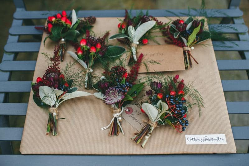 We did the venue flowers ourselves, but decided on professional flowers for the bouquets and buttonholes. I used a local florist, Catkin & Pussywillow, who have such a creative flare mixed with a wild rustic beauty. I discussed with them that I was looking for ‘wild, rustic and seasonal’ and allowed them to design the flowers. When they arrived the morning of the wedding, they were more beautiful than I ever could have imagined. The flowers perfectly complimented the autumnal colours we picked for the bridesmaids outfits and groomsmen’s bow ties. We have since dried the bouquets and have them hanging in the house as a beautiful display that we can keep forever.
