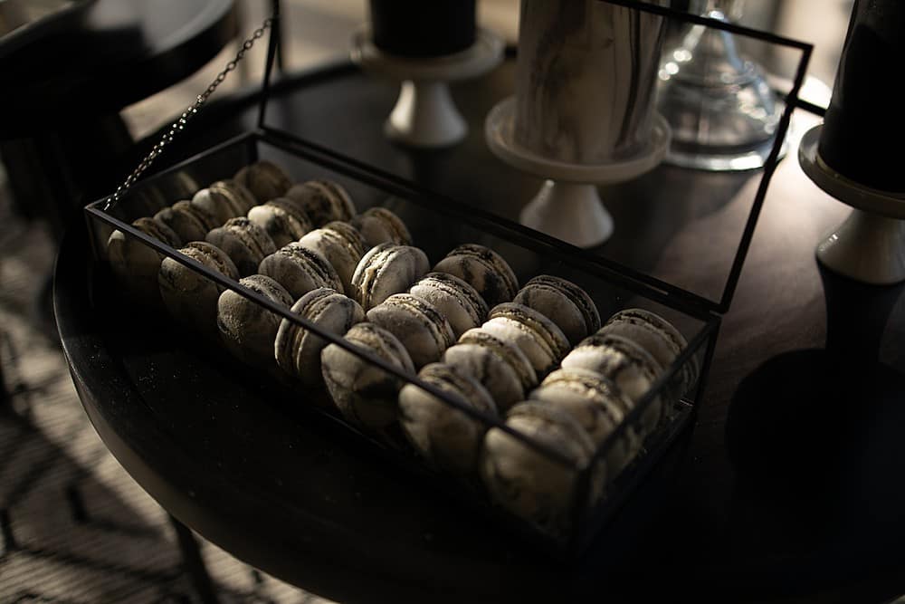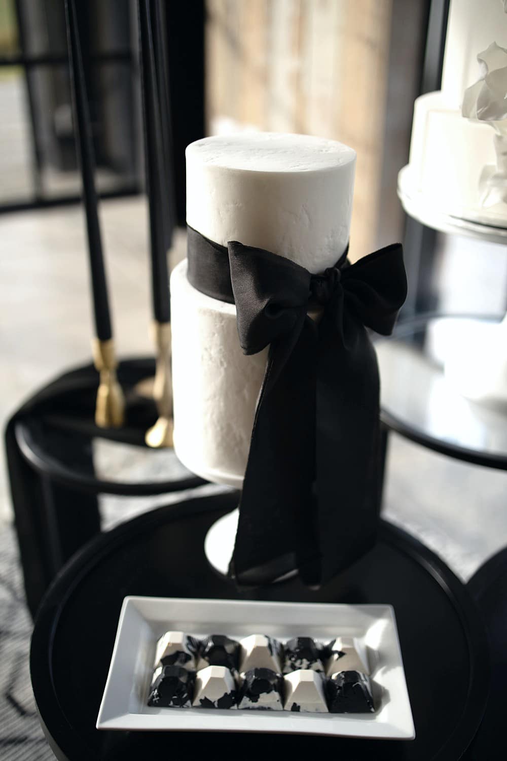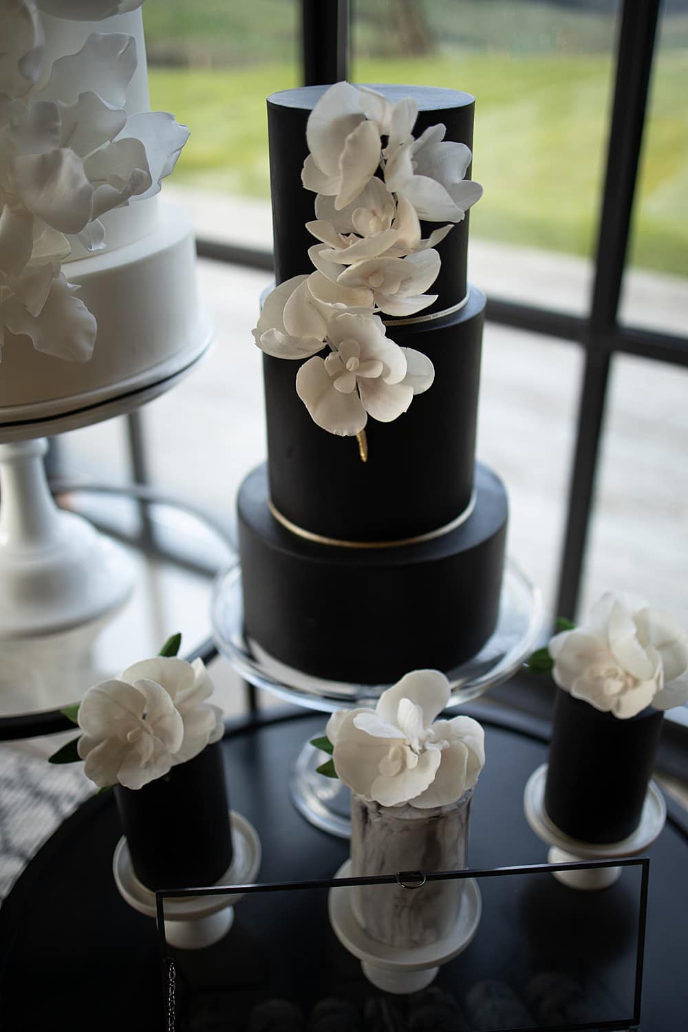 A lavish display of architectural icing mastery in the form of white and black cakes and macarons and chocolate pyramids was created by Anna Lewis Cakes.