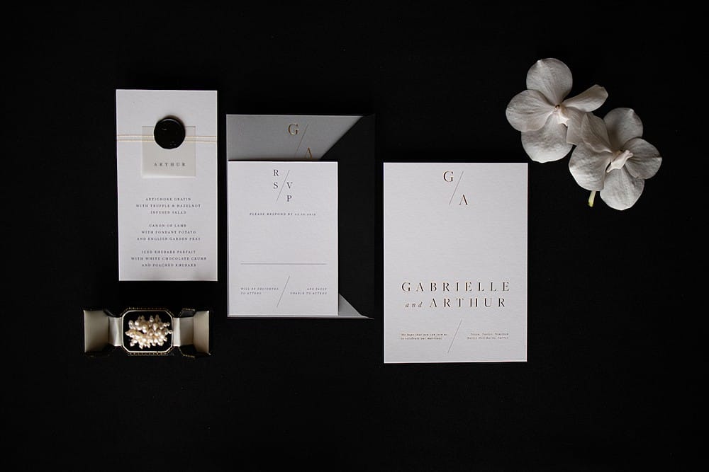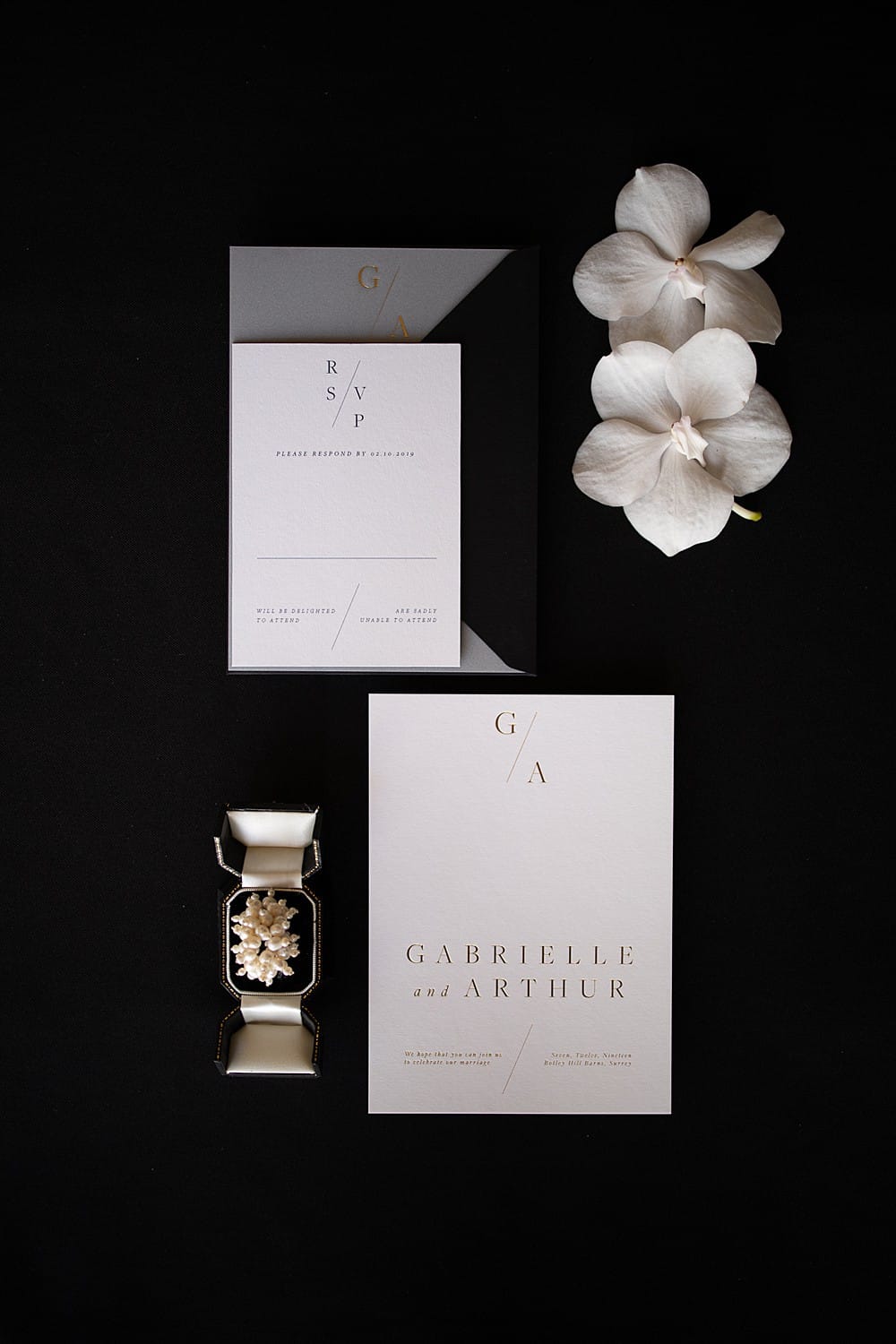 We nod towards this in ‘touches of Coco’ black throughout the shoot, alongside the bold contrast of white, with lashings of white flowers, extravagant cakes, head crowns and modern stationery. Our couple are named Gabrielle and Arthur, after Coco herself, and the one man she said she would have married, Arthur ‘boy’ Capel. He sadly died before they had the chance to marry but she forever claimed he was the love of her life. We tell the story of what should have been. Our table names are ‘Coco’ and ‘Chanel’ and our drinks menu consists of Champagne, and two cocktails – ‘The Noir’ and ‘The No.5’.