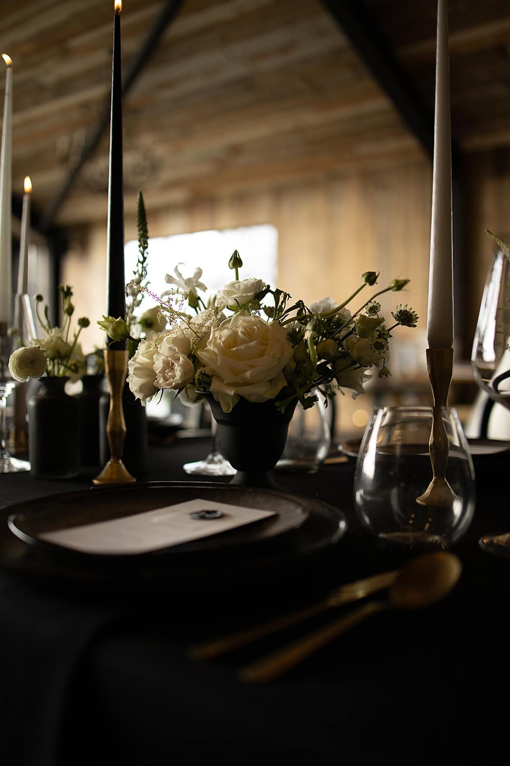 With a rising trend towards darker colours and the use of black at weddings, they embraced this bold choice in their design concept and included a chic colour palette of mainly black and white, with touches of gold. Set at the stylish new Botley Hill Barn in Surrey, with its feature window walls and industrial inspired interiors, they embraced the season, with its shorter daylight hours and early twilight, and created a unique, candlelit setting for our bold and moody shoot.
