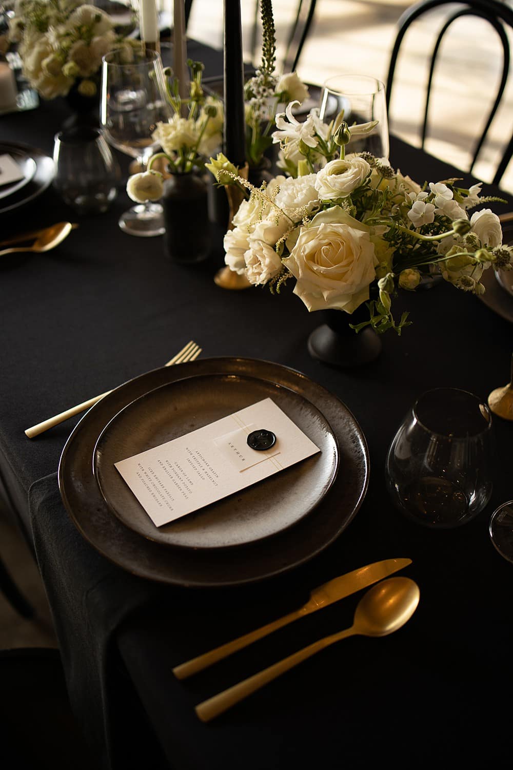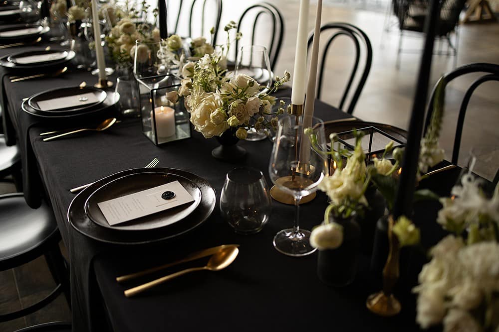 Our tables are dressed in black tablecloths and runners, brushed gold flatware and stylish black and white Ester & Erik candles, all from The W Collection, and finished with an abundance of white florals. Our backdrop for the ceremony is a wall of glass with gentle cascading greenery and display plinths of white florals.