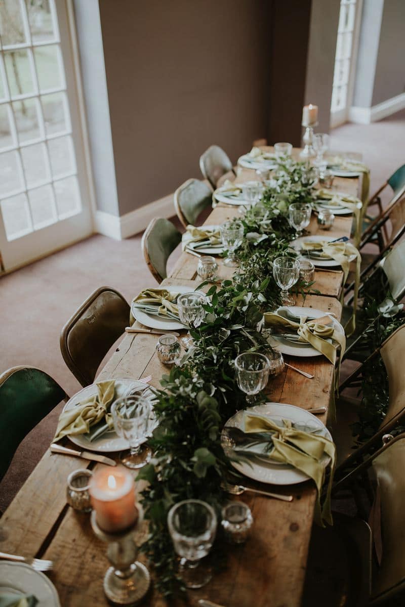 I dressed the table with Bridwell’s own crockery and satin napkins and oversized ties in hues of duck egg and green with the addition of feathers. The chair backs and table were decked out in volumes of greenery by our florist Emma at Brompton Buds who combined the plaster pink colour with the most beautiful roses and trailing vines.