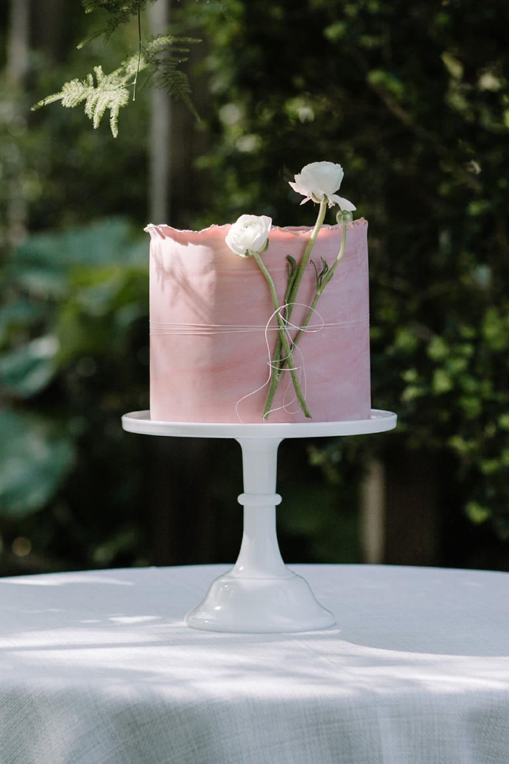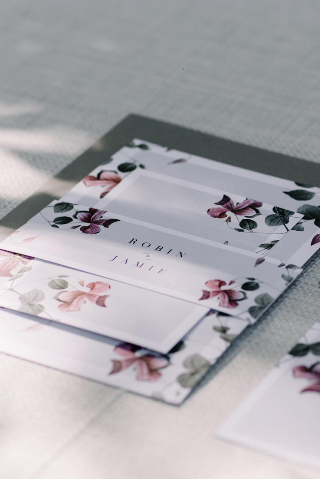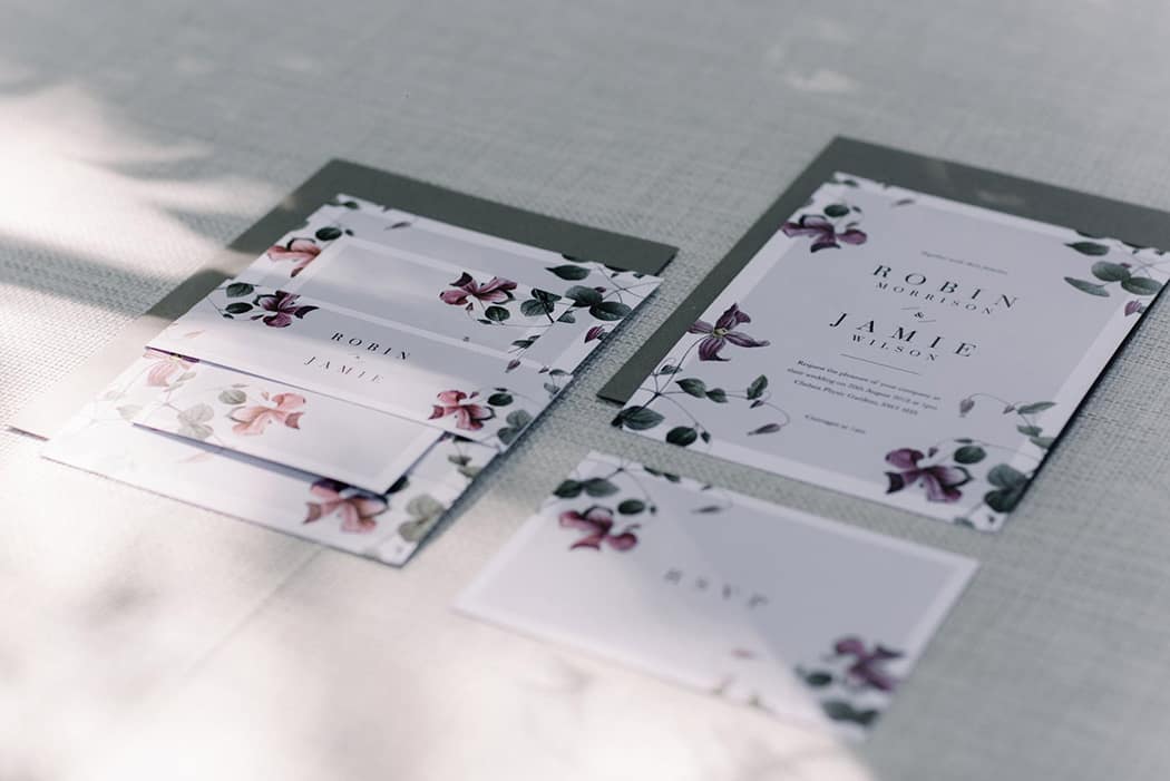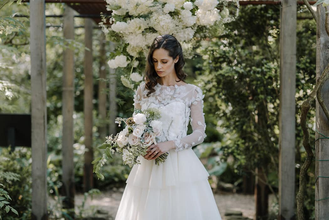 We wanted the tablescape to blend into the gardens but still have a contemporary feel – with modern tableware and botanical inspired stationery by Nat’s Paper Studio, sitting under a cloud of fluffy white hydrangea by our florist Bloomologie.