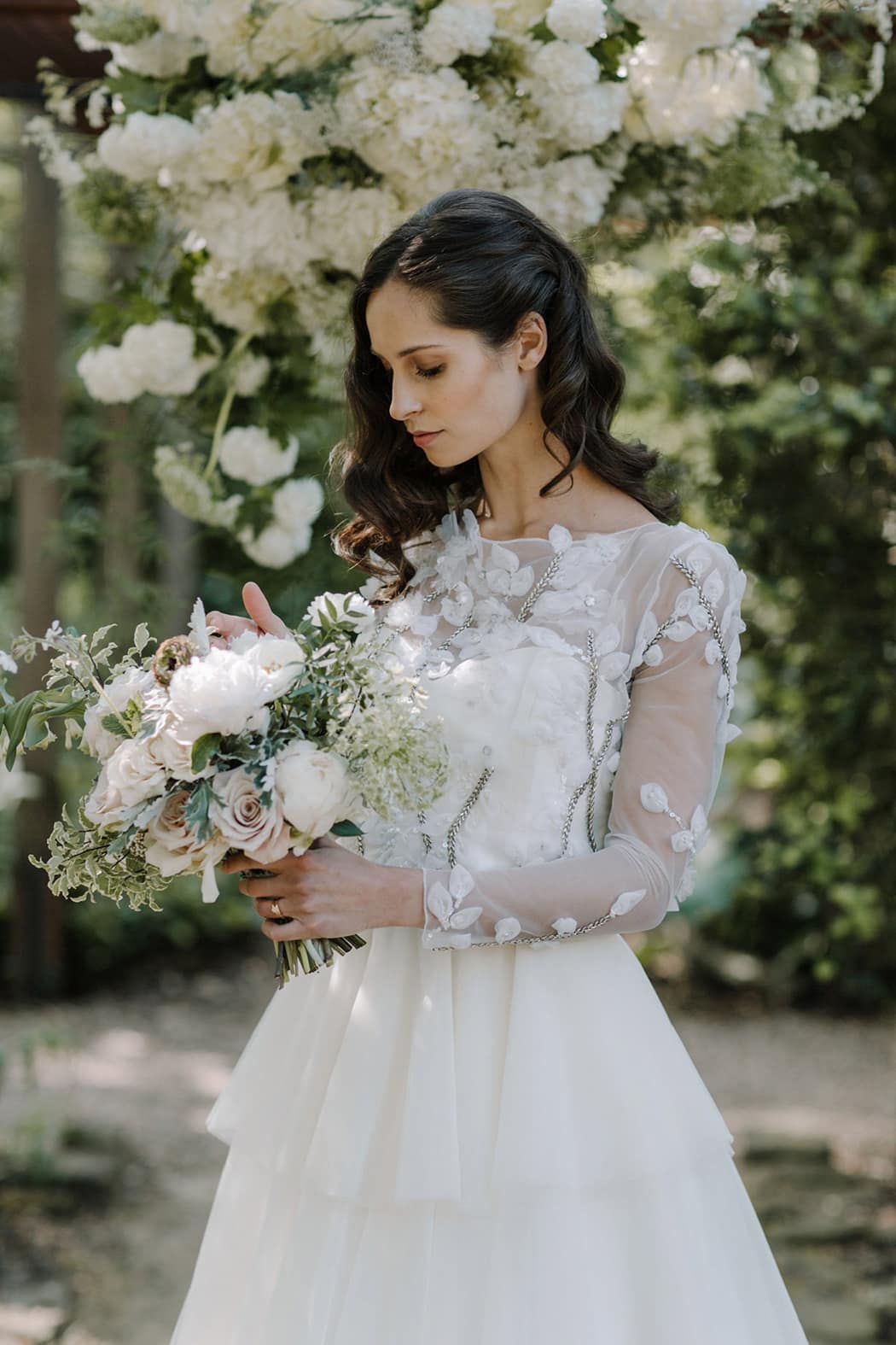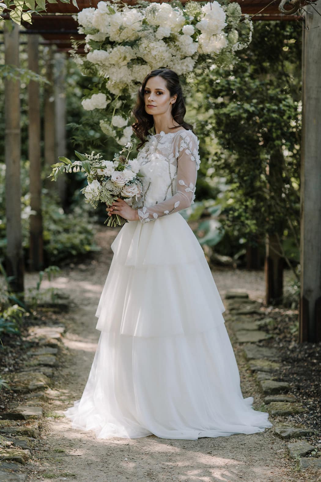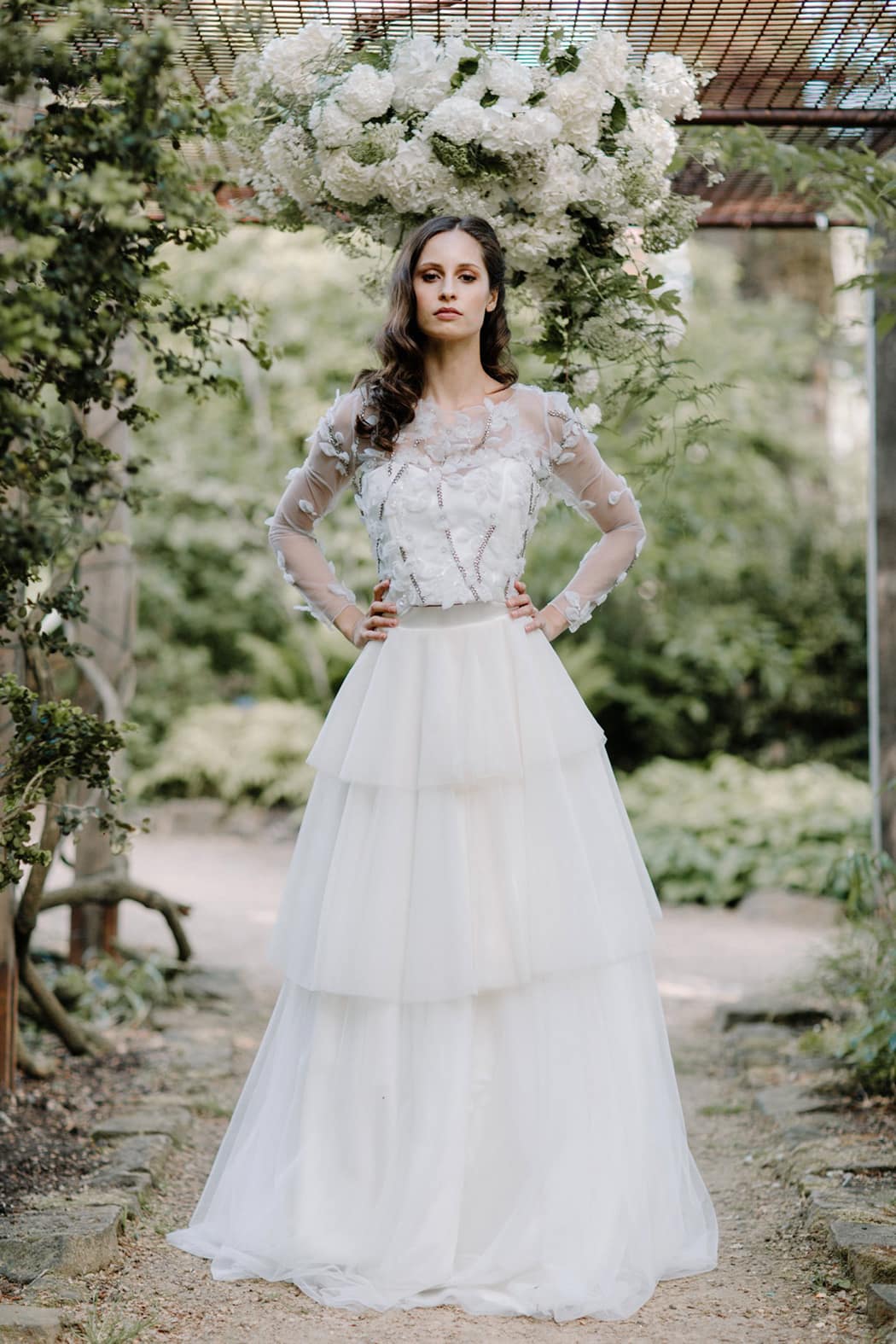 For the first look Kate created a 2-piece outfit with long sleeve top using textured floral tulle teamed with a three-tier tulle skirt. Hair by Love Hair By Lou was styled with elegant waves, and airbrush makeup by Ana Ospina was kept natural and glowing.