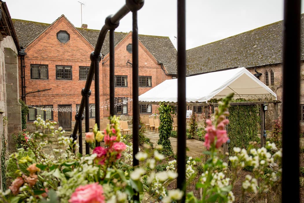 The Courtyard, the heart of Brinsop Court was dressed for an outdoor ceremony, with a beautiful display of wild and colourful flowers created by Twisted Sisters.