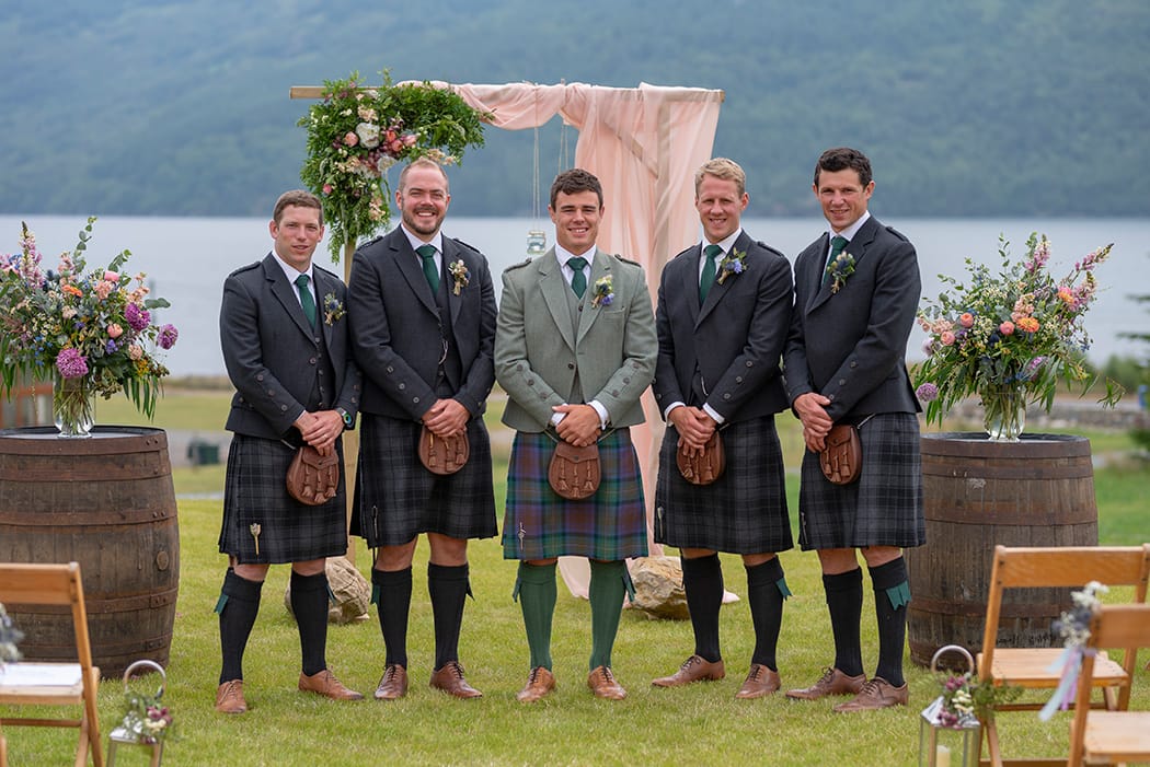 Lee and I wanted to create quite a classy rustic look for the wedding so went for grey bridesmaid dresses and dark grey kilts for the groomsmen. We got all the kilts from Slanj, some from Edinburgh and some in Glasgow. Lee wore Isle of Sky tartan for his kilt with a green tweed jacket which matched the rustic theme for the wedding.