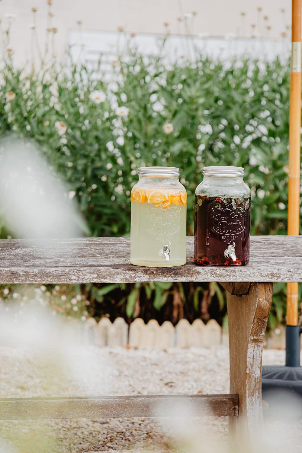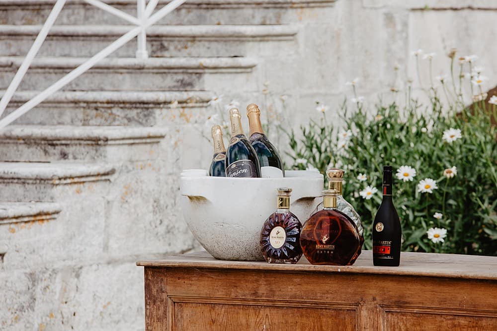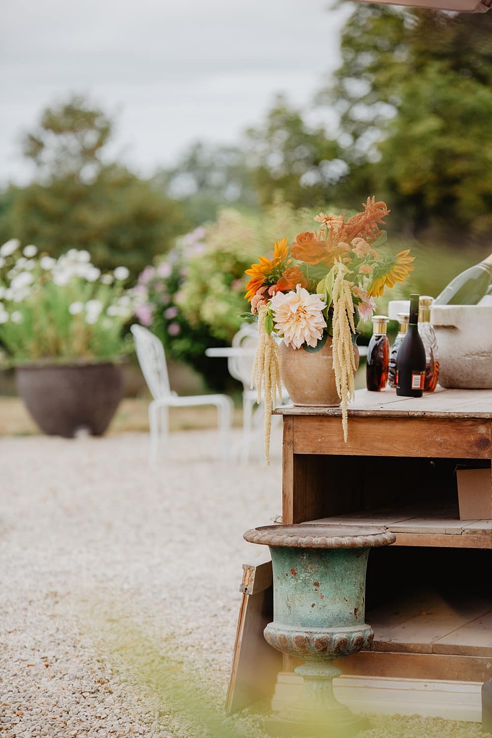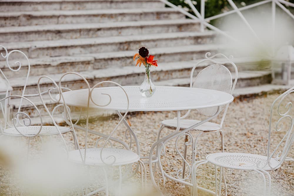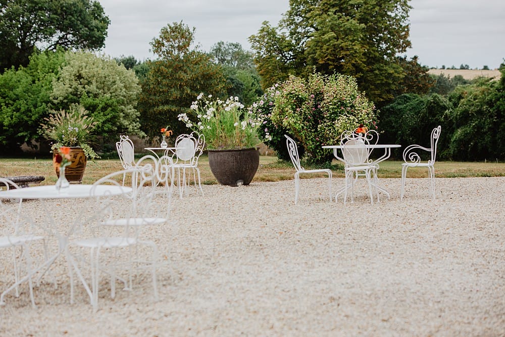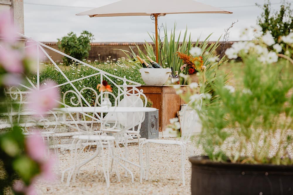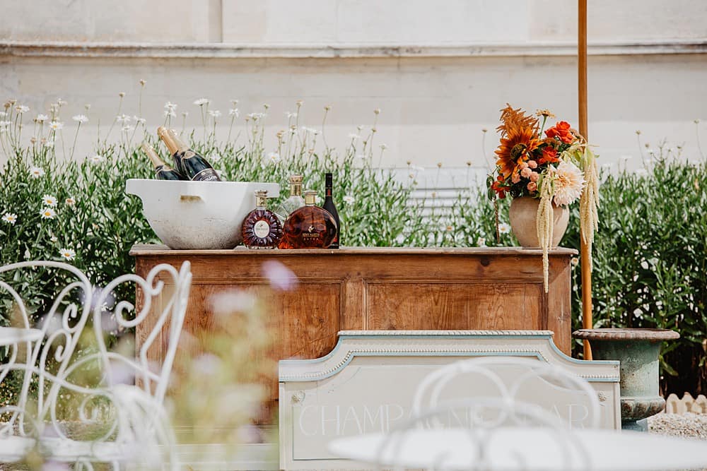 The owners of the property have the most beautiful collection of antiques and props, which from a wedding planning point of view is the dream! We wanted to utilise this on the shoot, so we used an old dresser as the bar, as well as antique vases, candle holders and signage which are made from antique French bed heads. When planning a wedding we always look at mixing materials – stone, wood, linen and generally a good range of textures. This is something we did with this shoot, the lighter white-washed wooden tables are the perfect shade and style to complement most colour palettes, and the metal frame chairs give it that extra layer of interest.