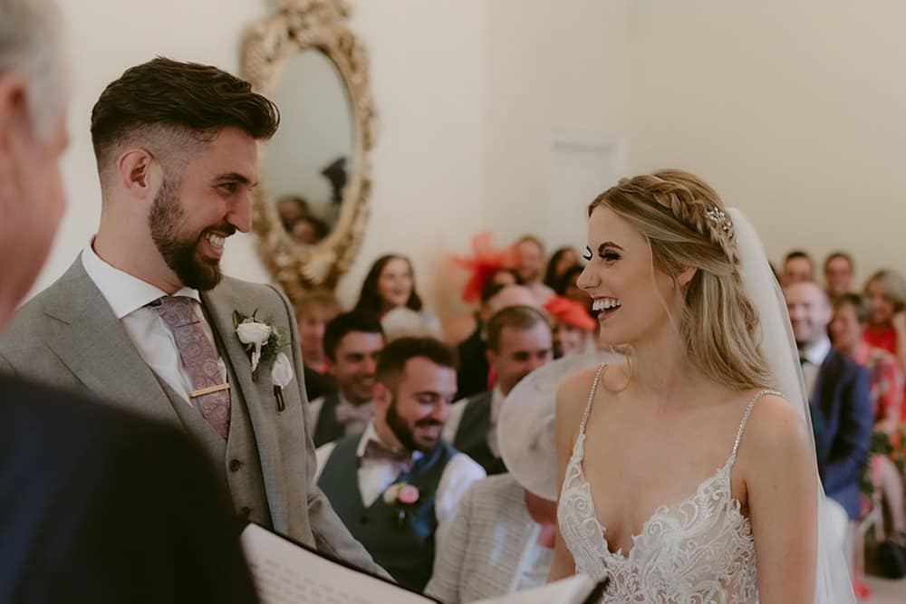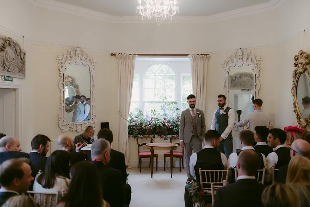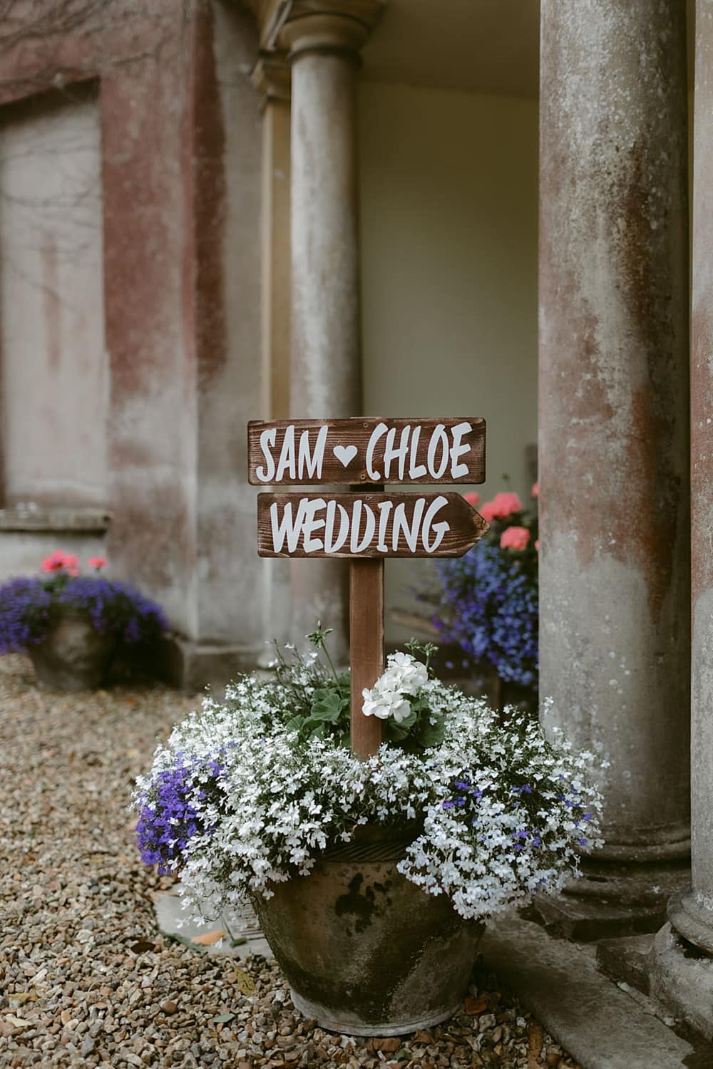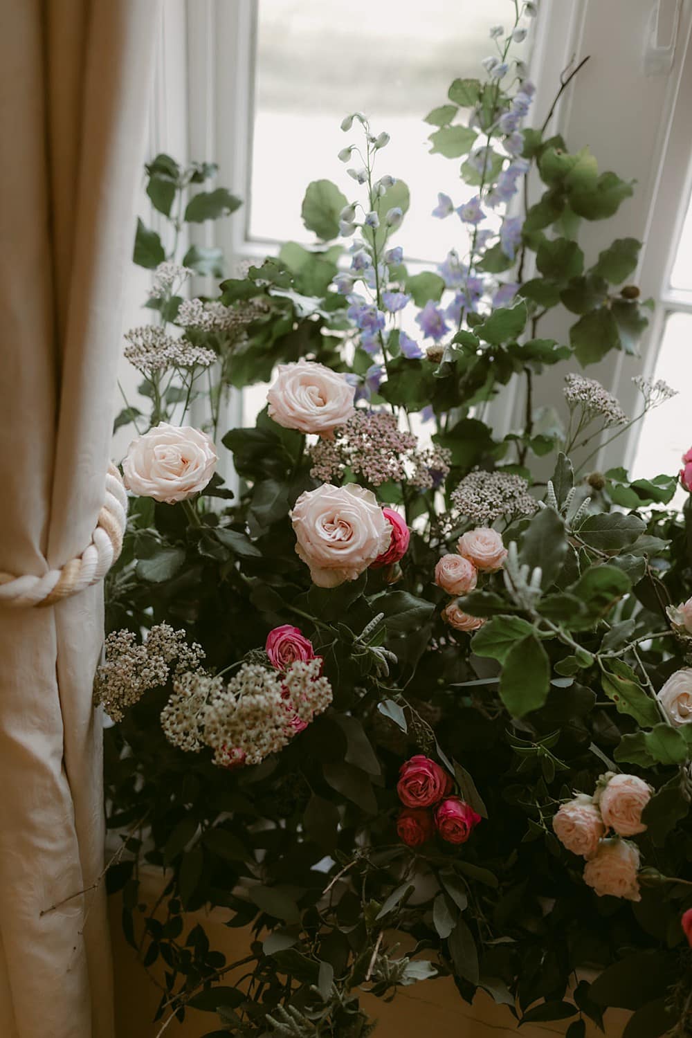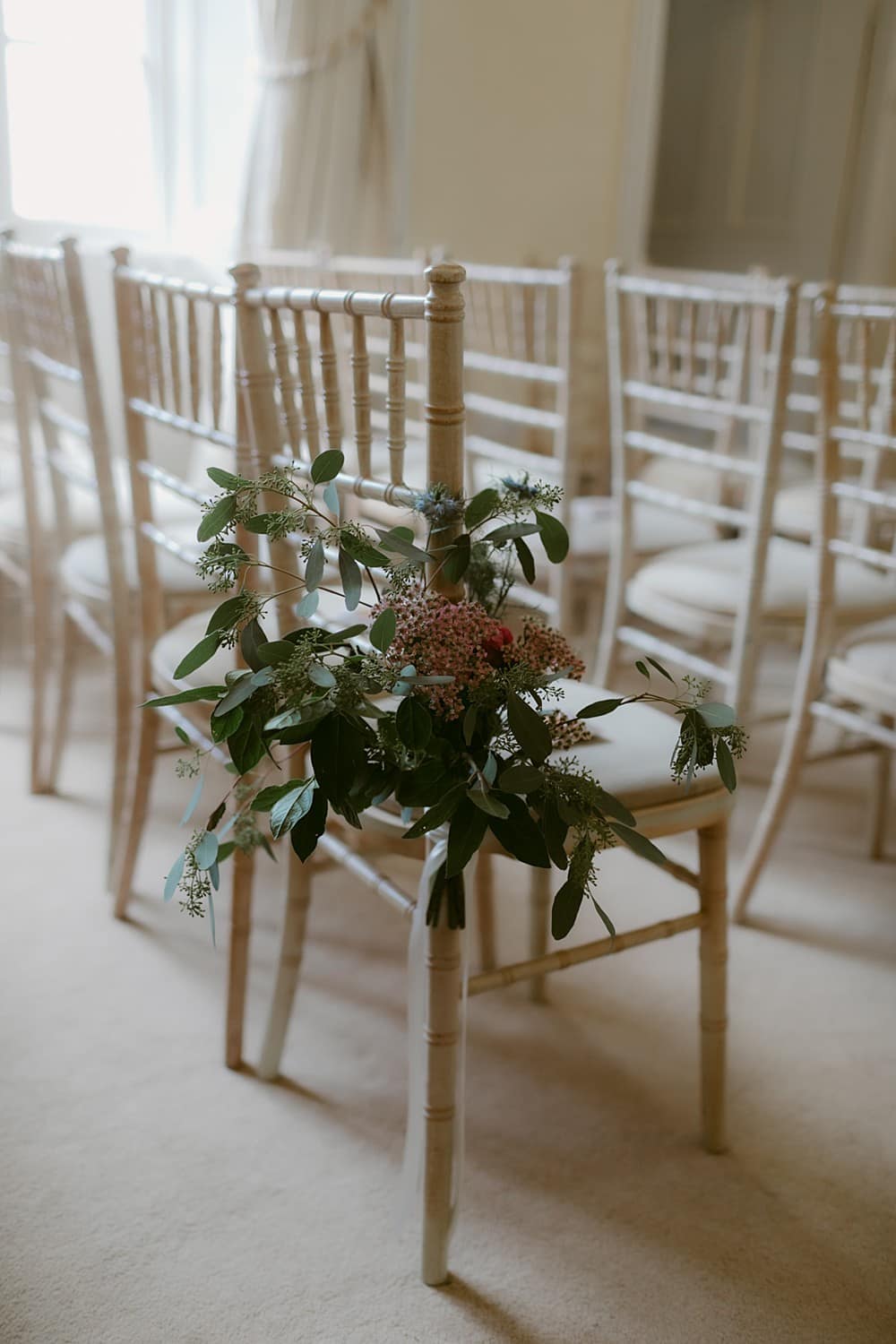 Due to the wind on the day we moved our ceremony inside, so the flowers that were meant to be on the arbour were placed on the windowsill in the ceremony room, which created a beautifully lush backdrop. We had a posy of wild flowers tied to the chairs down the aisle.